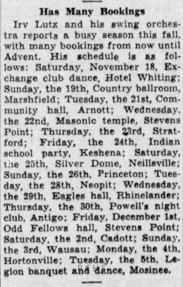 Newspaper clippings from Portage County newspapers. These clippings show jazz musicians, bands, events, school organizations, and traveling shows from 1936-1960. Some highlighted topics are Ray Jacobs, Irv Lutz, Benny Graham, Laurie Brill, Louie's Ol' Timers, Rhythm Rascals, Cornwall's Hawaiians, Wally Ives, Silver Dome Ballroom, Bob Worth.Created By