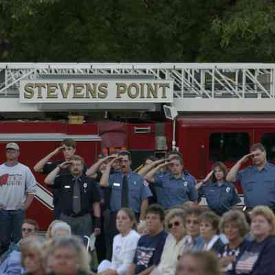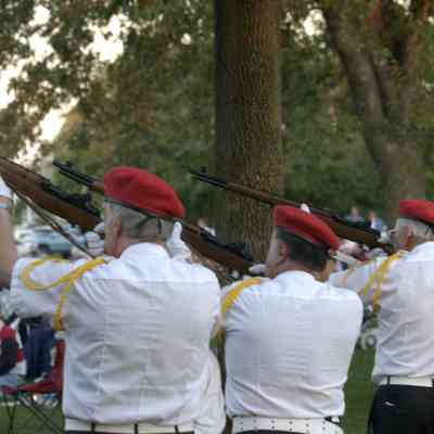 The AMVETs Rifle Squad stands in formation near the Pfiffner Pioneer Park Bandshell as the Stevens Point Barbershoppers present their "United We Stand" concert Wednesday evening. Veterans groups and military personnel, as well as local police and fire departments, were recognized.