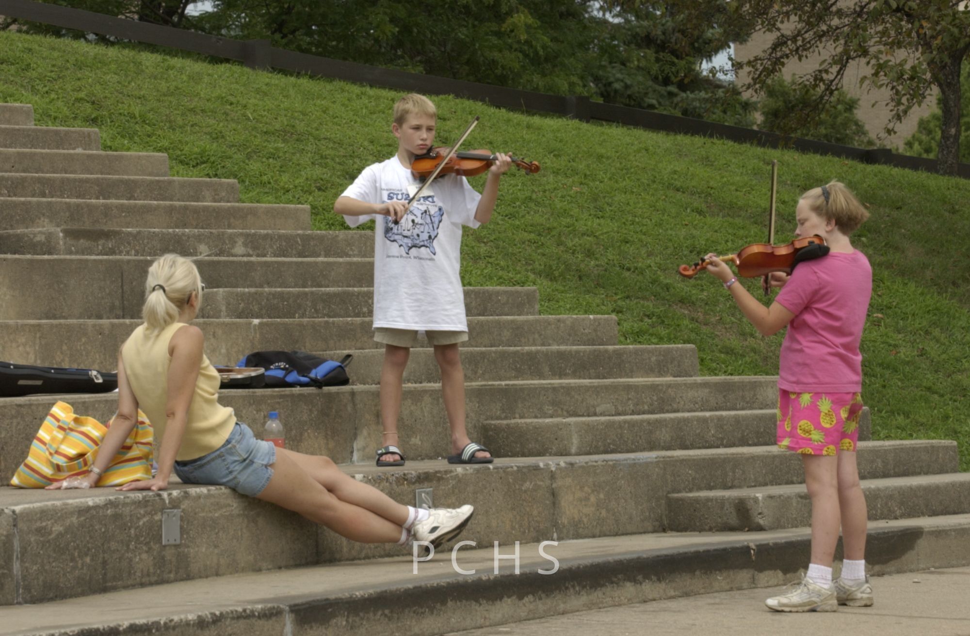 Images depict: harp students in a class and string instrument students practicing outside.Photograph Details