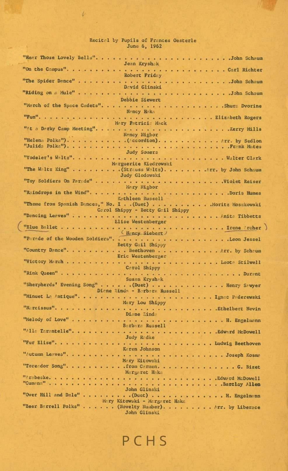 A list of the songs played by pupils of Frances Osterle on 6/6/1962, along with which students played each song.Created By