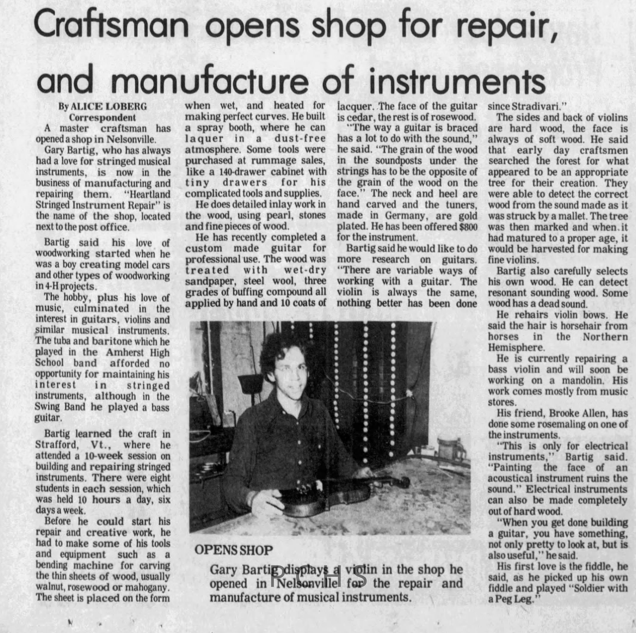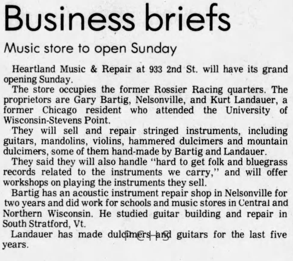 Newspaper articles ranging from 1978-2001, covering the history of the Heartland Music and Repair shop and the owner, Gary Bartig.Created By