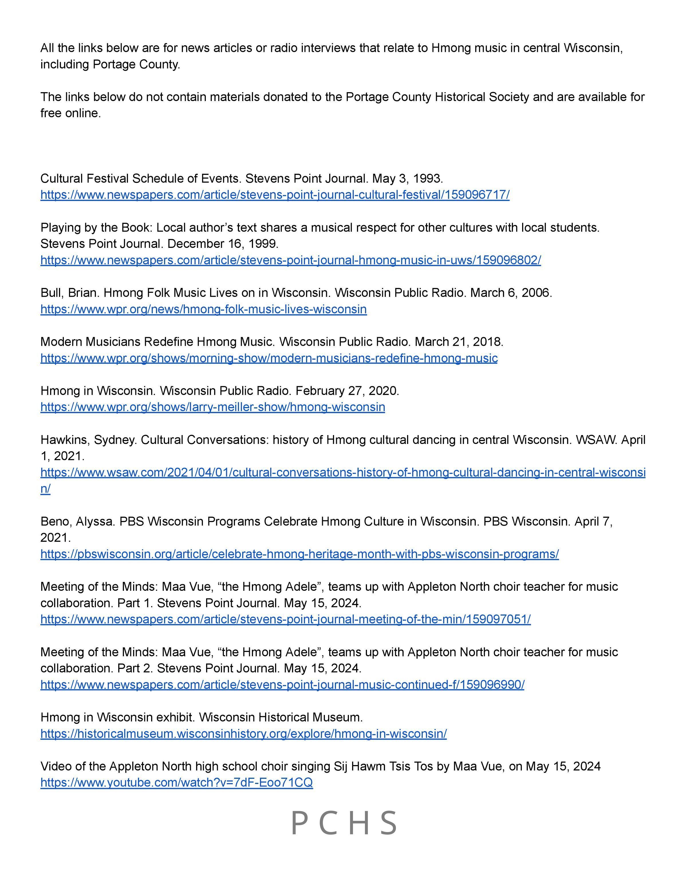 Three documents that contain links and information on Hmong history in Portage County and musical traditions.Created By
