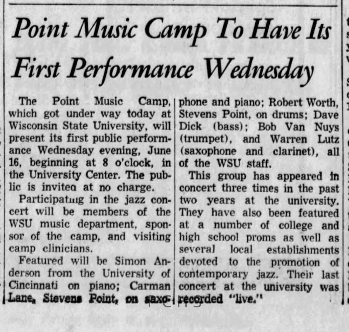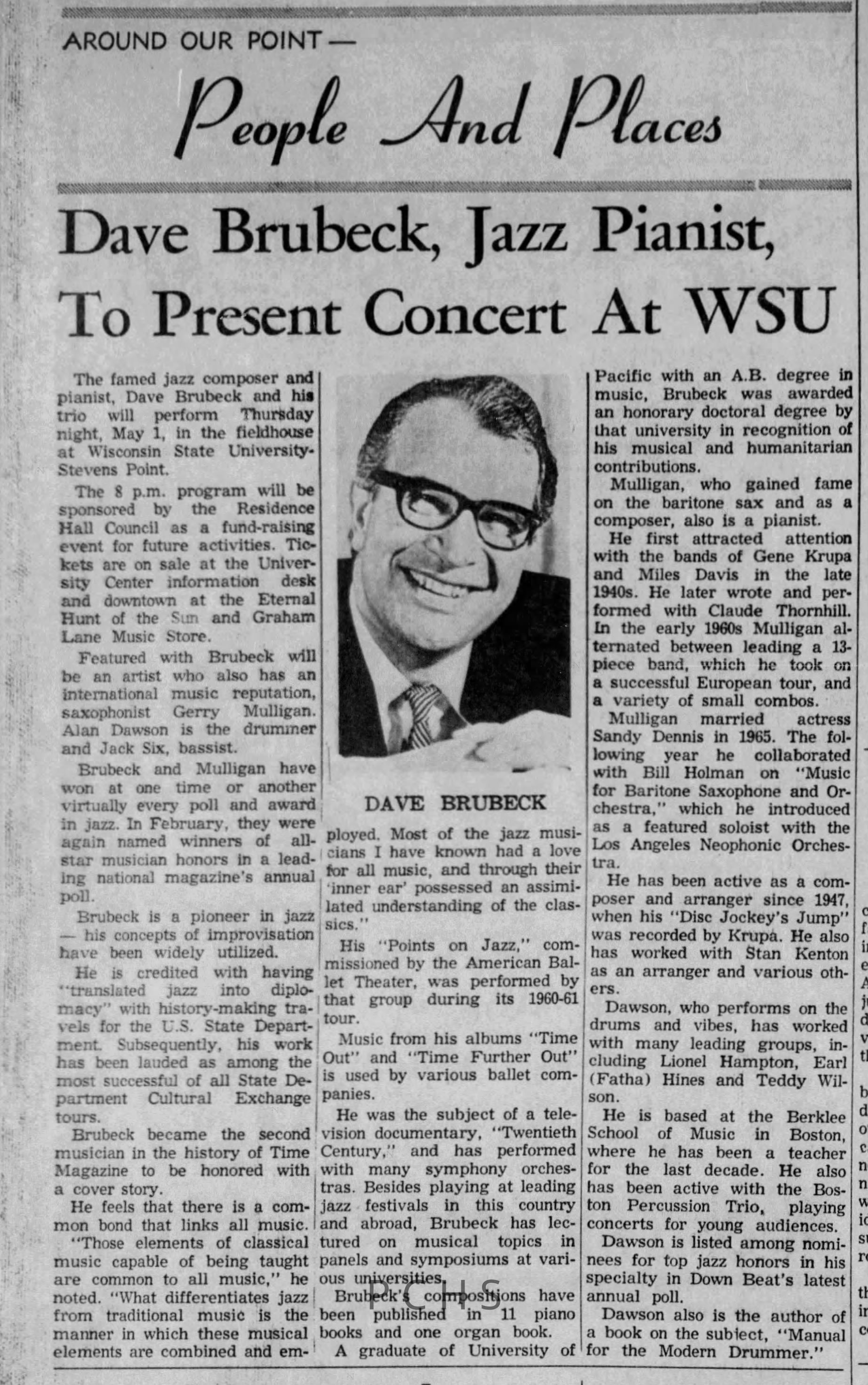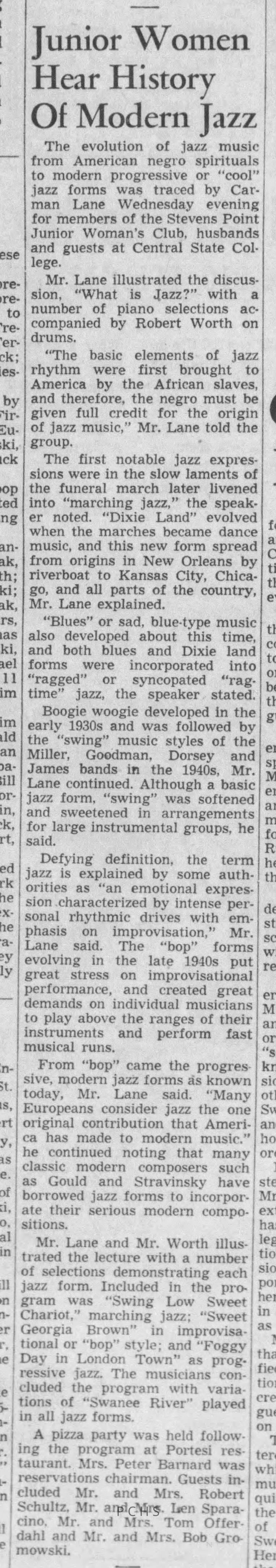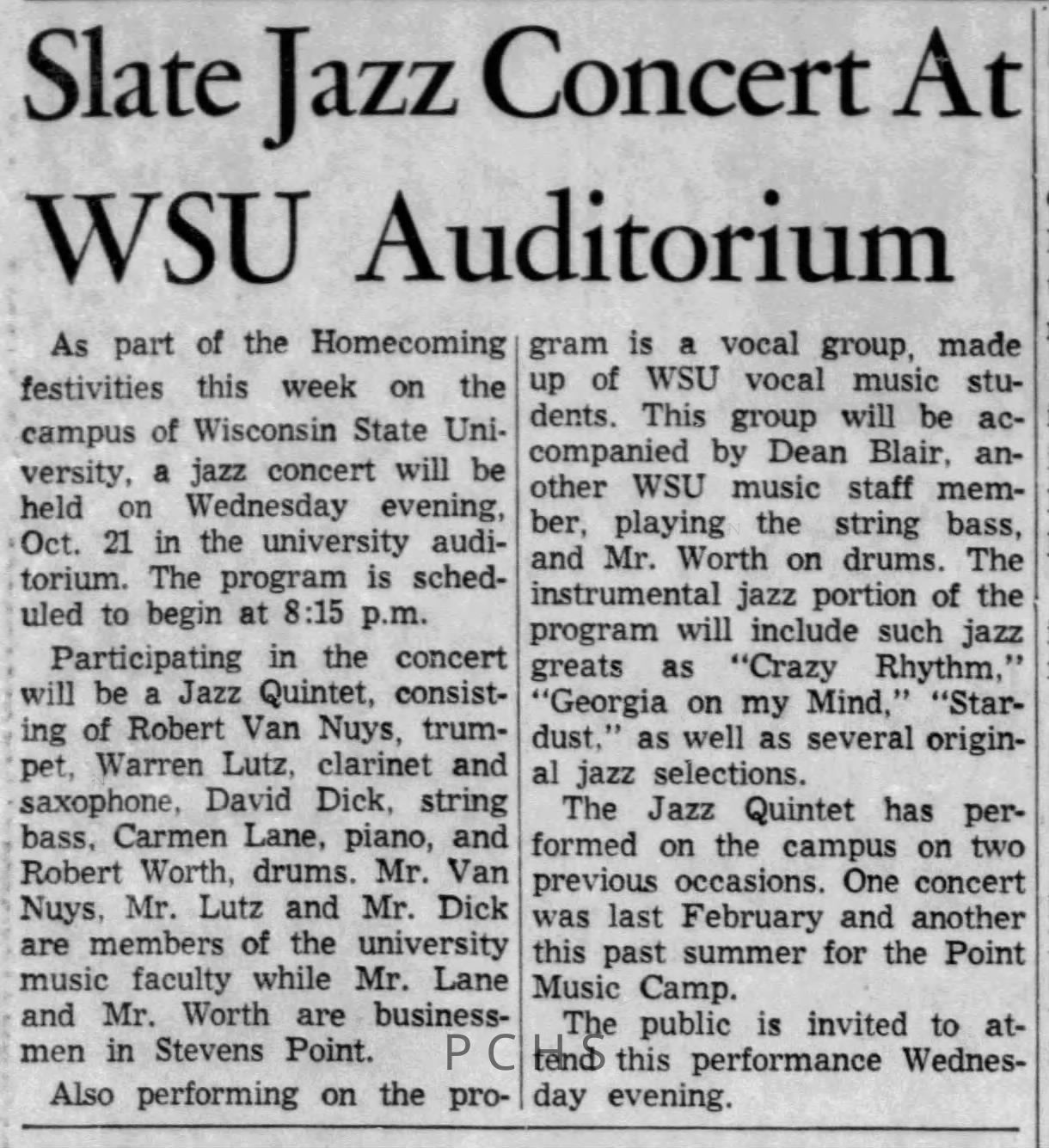 Newspaper clippings from Portage County newspapers. These clippings show jazz musicians, bands, events, school organizations, and traveling shows from 1961-1970. Some highlighted topics are Bob Worth, Carman Lane, Boston Furniture, Don Chesebro, Jim Laabs, Kenny Vogt, Bill Atwell, the Nu-Notes, bandshell, WSU, La Vern Ives, Point Bowl, Dave Dick, Lynn Eckes, Treasure Island, KoKo Club, Brubeck Quartet, Tiny Tina, Uncalled Four, Wally Ives, James Duggan, Madrigals, Unnamed Four, Ruth Salzmann, American Federation of Musicians, Dave Brubeck, Graham Lane, Buddy Rich, Franz Roehmann, Wenzel Albrecht, Preservation Hall jazz band.Created By