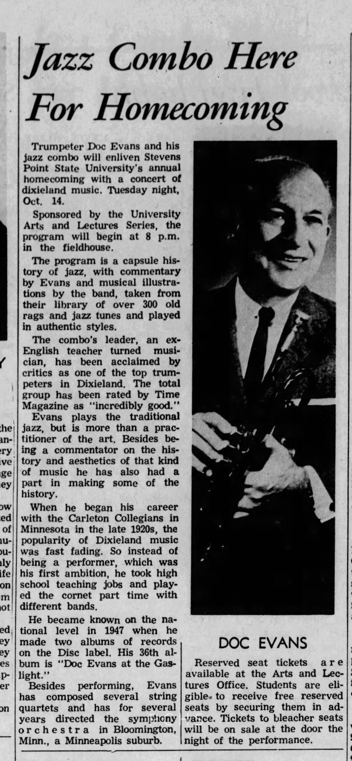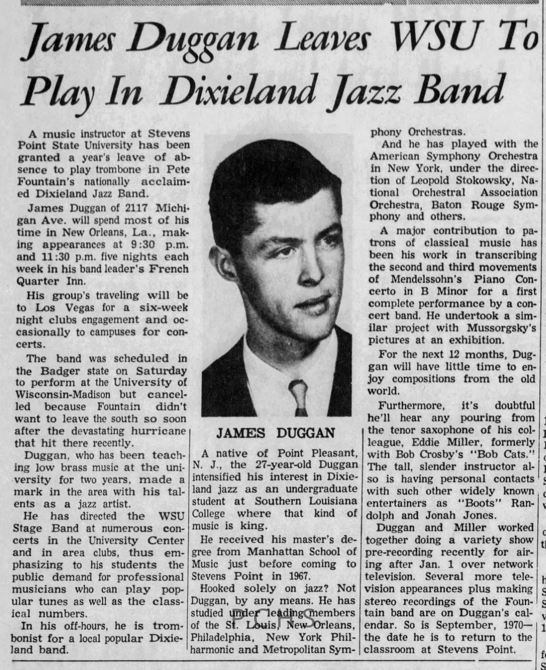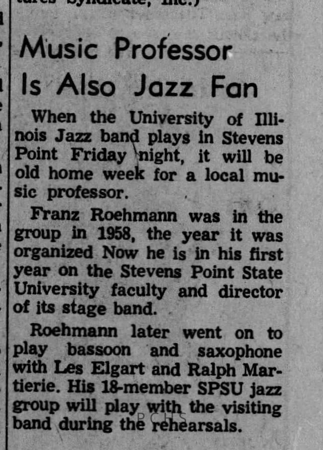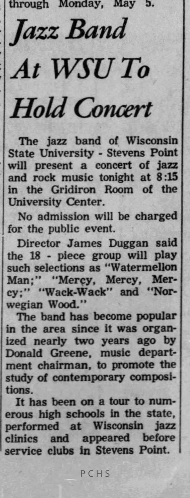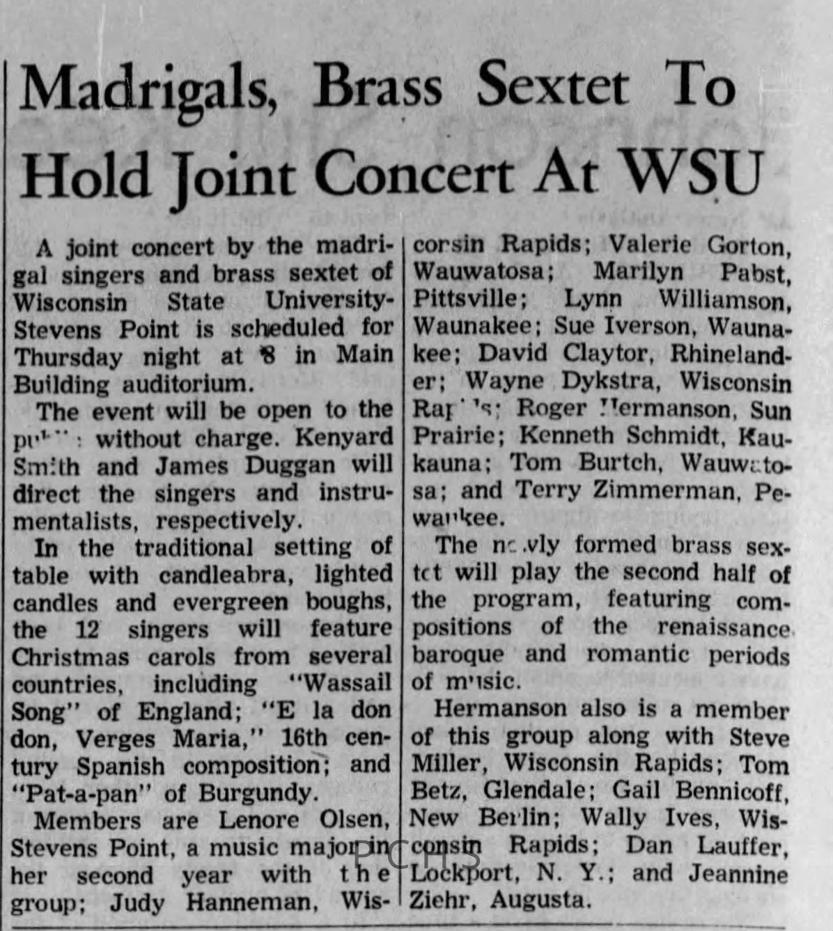 Newspaper clippings from Portage County newspapers. These clippings show jazz musicians, bands, events, school organizations, and traveling shows from 1961-1970. Some highlighted topics are Bob Worth, Carman Lane, Boston Furniture, Don Chesebro, Jim Laabs, Kenny Vogt, Bill Atwell, the Nu-Notes, bandshell, WSU, La Vern Ives, Point Bowl, Dave Dick, Lynn Eckes, Treasure Island, KoKo Club, Brubeck Quartet, Tiny Tina, Uncalled Four, Wally Ives, James Duggan, Madrigals, Unnamed Four, Ruth Salzmann, American Federation of Musicians, Dave Brubeck, Graham Lane, Buddy Rich, Franz Roehmann, Wenzel Albrecht, Preservation Hall jazz band.Created By