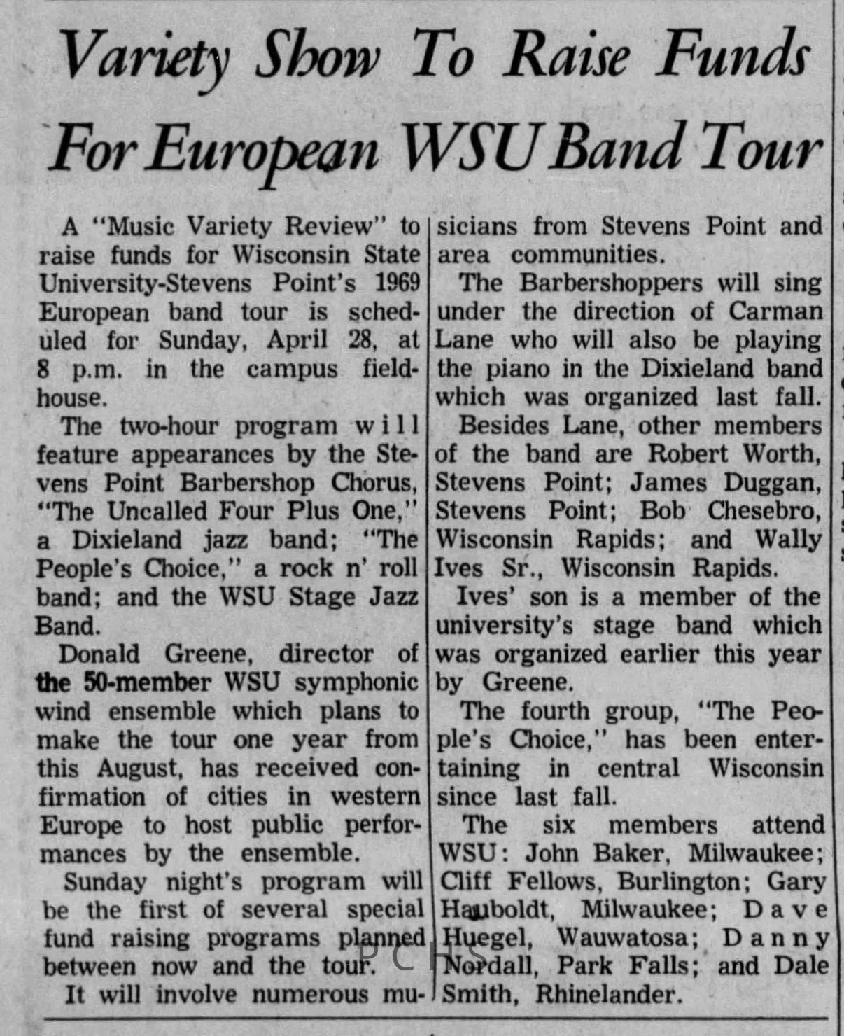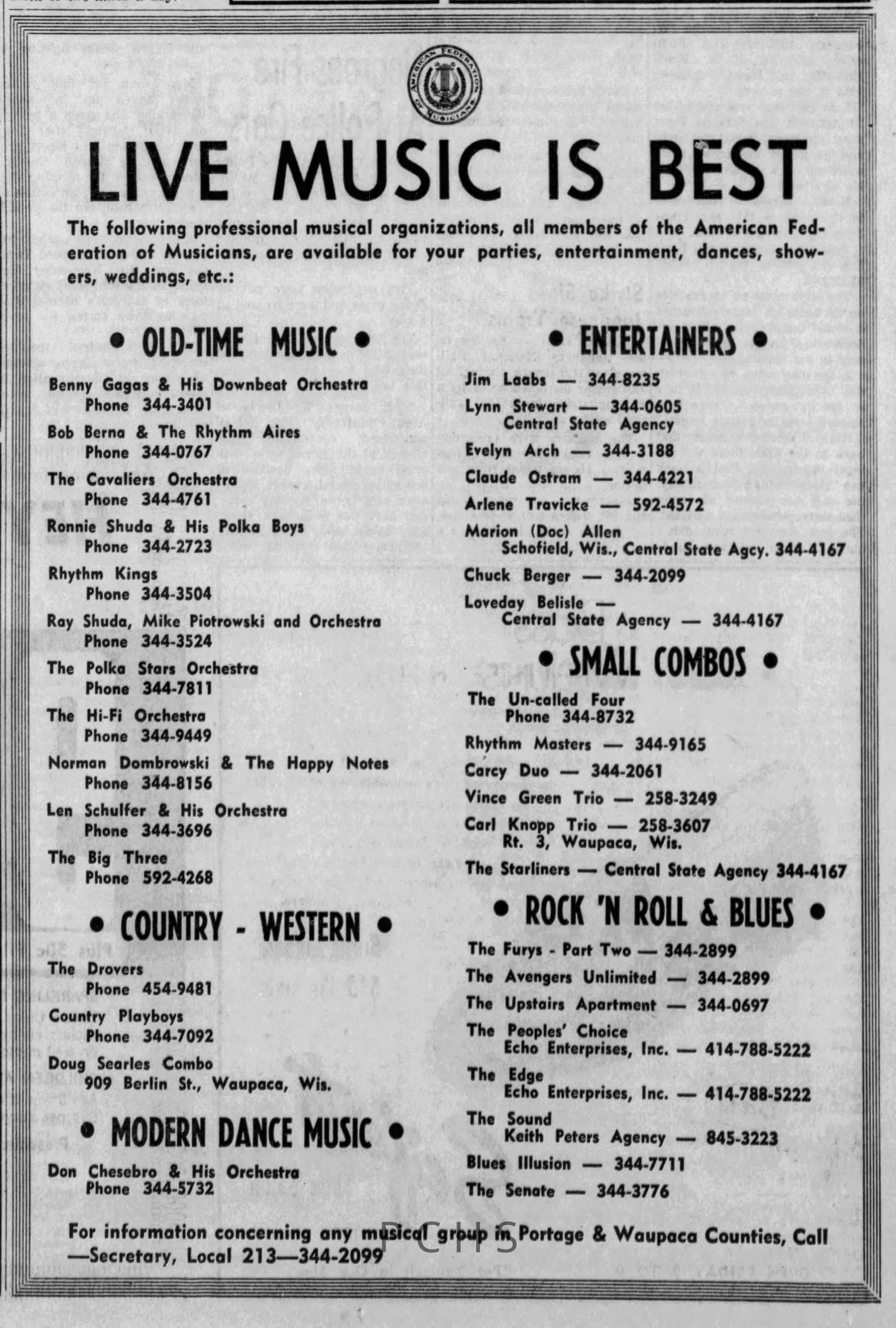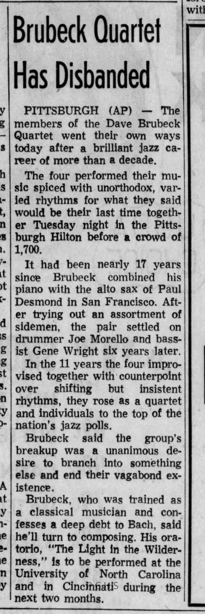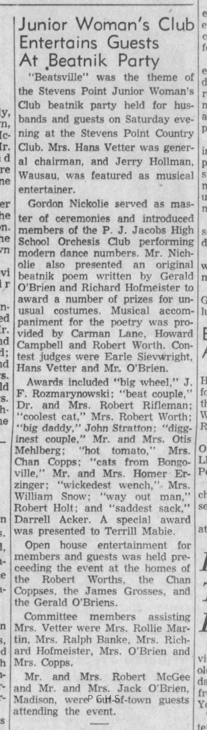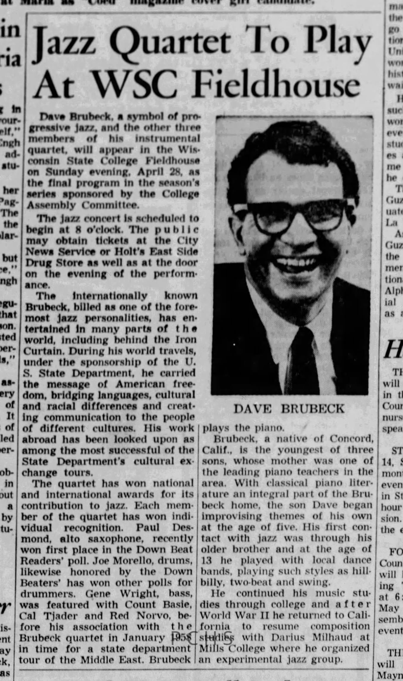 Newspaper clippings from Portage County newspapers. These clippings show jazz musicians, bands, events, school organizations, and traveling shows from 1961-1970. Some highlighted topics are Bob Worth, Carman Lane, Boston Furniture, Don Chesebro, Jim Laabs, Kenny Vogt, Bill Atwell, the Nu-Notes, bandshell, WSU, La Vern Ives, Point Bowl, Dave Dick, Lynn Eckes, Treasure Island, KoKo Club, Brubeck Quartet, Tiny Tina, Uncalled Four, Wally Ives, James Duggan, Madrigals, Unnamed Four, Ruth Salzmann, American Federation of Musicians, Dave Brubeck, Graham Lane, Buddy Rich, Franz Roehmann, Wenzel Albrecht, Preservation Hall jazz band.Created By