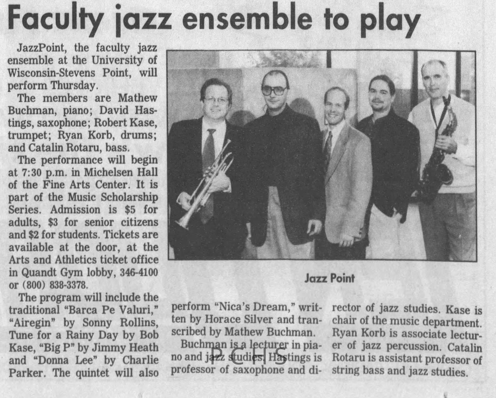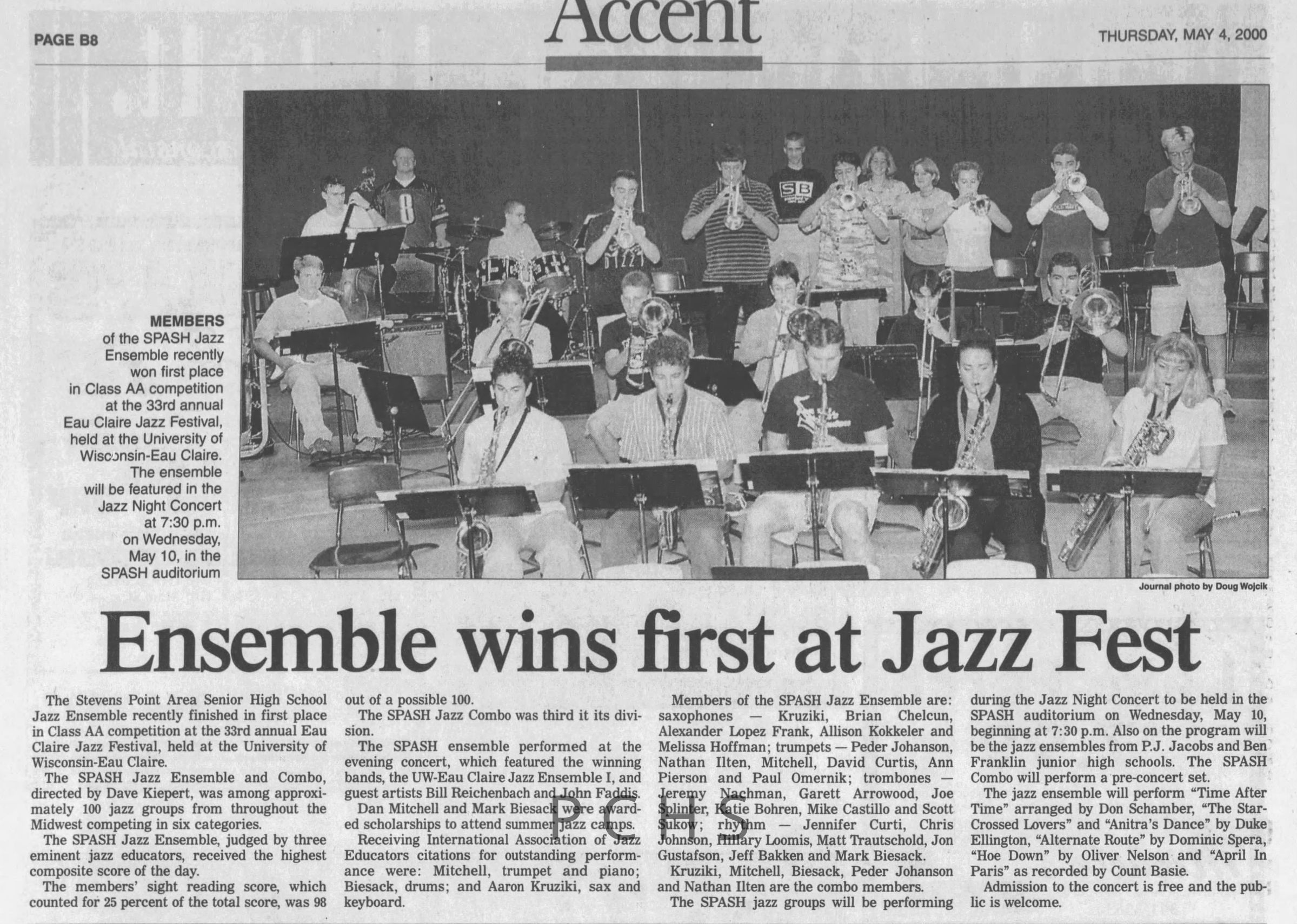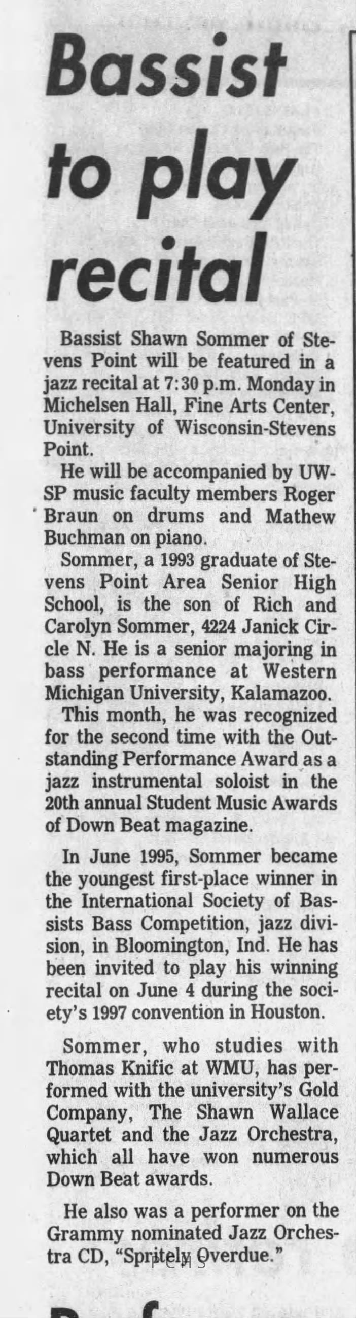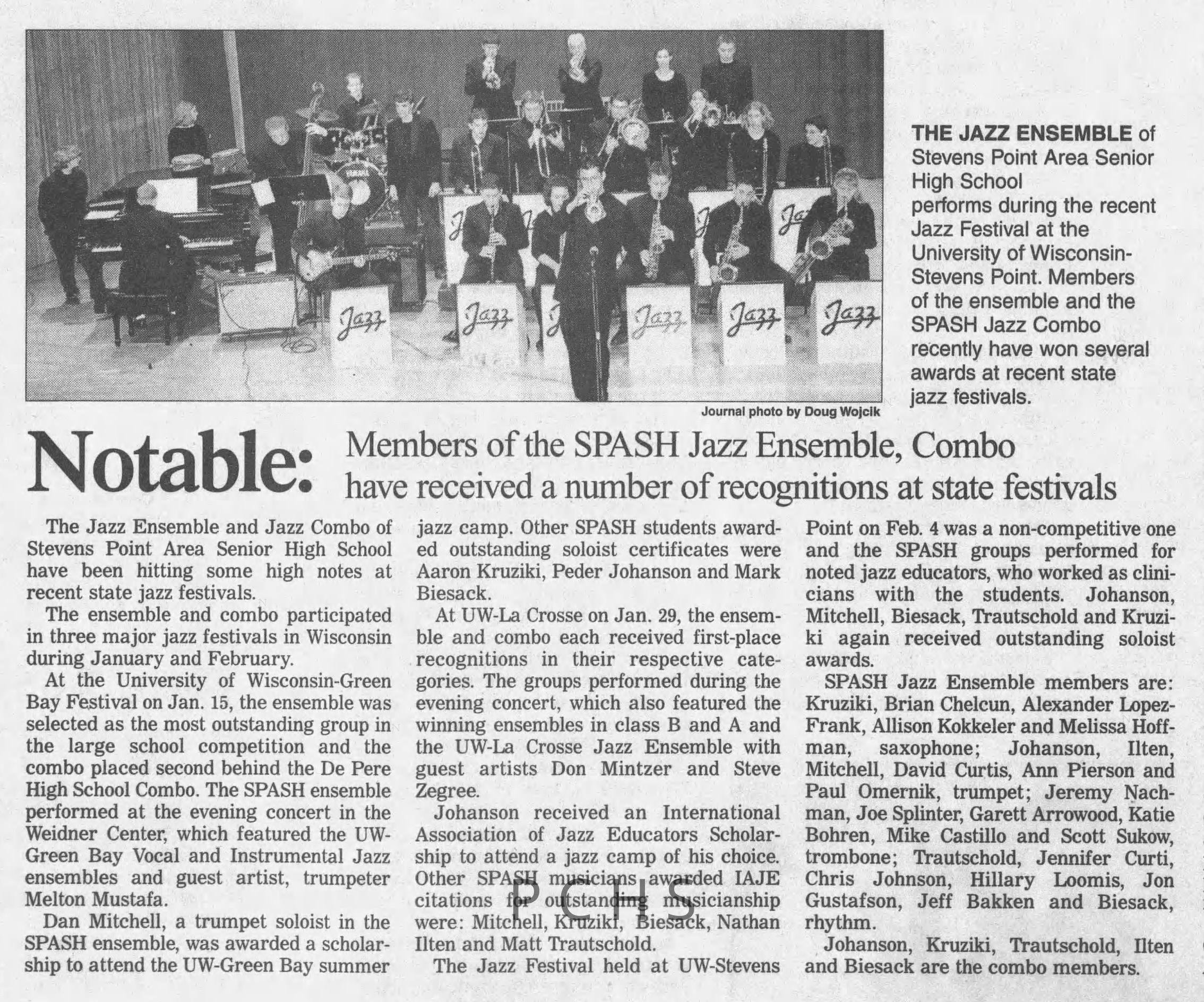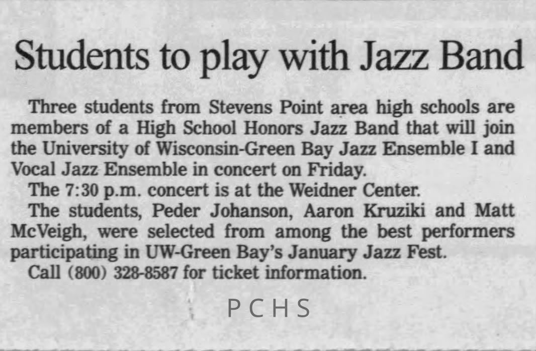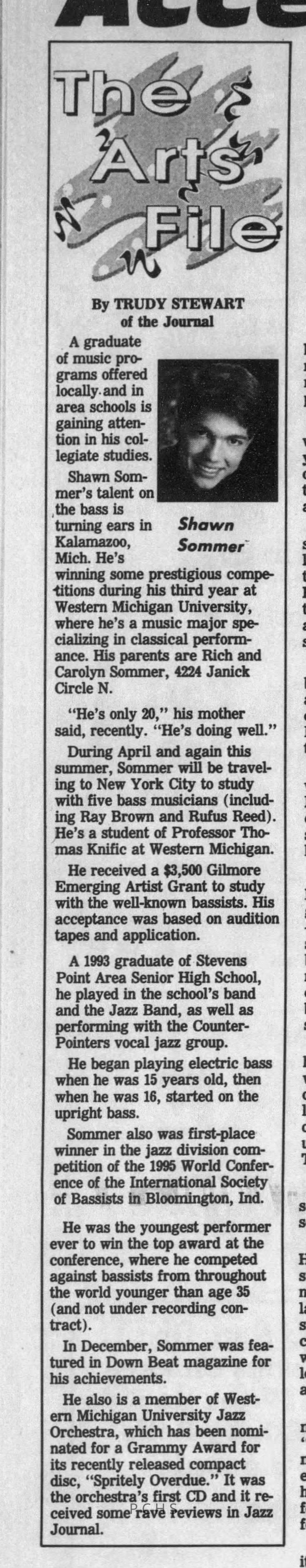 Newspaper clippings from Portage County newspapers. These clippings show jazz musicians, bands, events, school organizations, and traveling shows from 1996-2000. Some highlighted topics are Shawn Sommer, SPASH jazz ensemble, Don Chesebro, Thomas George, Rosholt, UWSP Mardi Gras Ball, CWSO, Poco a Poco, Don Greene, Ben Franklin Junior High, Riverfront Rendezvous, Dick Johnson, Almond-Bancroft, Todd Gustafson, Mike Metheny, John Greiner, John Altenburgh, Janet Planet, WWSP, jazzfest, Kip Gutke, Matt Dow, Bethany Ackeret, Counterpointers, PJ Jacobs, Big Band Express, Erin McLennon, Lindsey Quick, jazz lab band, Breanne Hetzel, Brian Reince, Matthew Antoniewicz, CWSO, Gold Company, David Hastings, Amanda Sommers, Laura Sommer, Jazz Point, Laura Caviani, Karrin Allyson, Soiree Musicale, Pacelli high school, Krazy Days, May Erickson, Wisconsin Christmas Jazz and Blues Show, Abbie Betinis, Greg Wright, Dave Kiepert, Jeff Erickson, Down Beat Ensemble, Pops Concert, Richard Johnson, Swing into Action, River Cities Jazz, Bob Kase Quartet, Don Chesebro Swing Quartet, Dennis Provisor.Created By