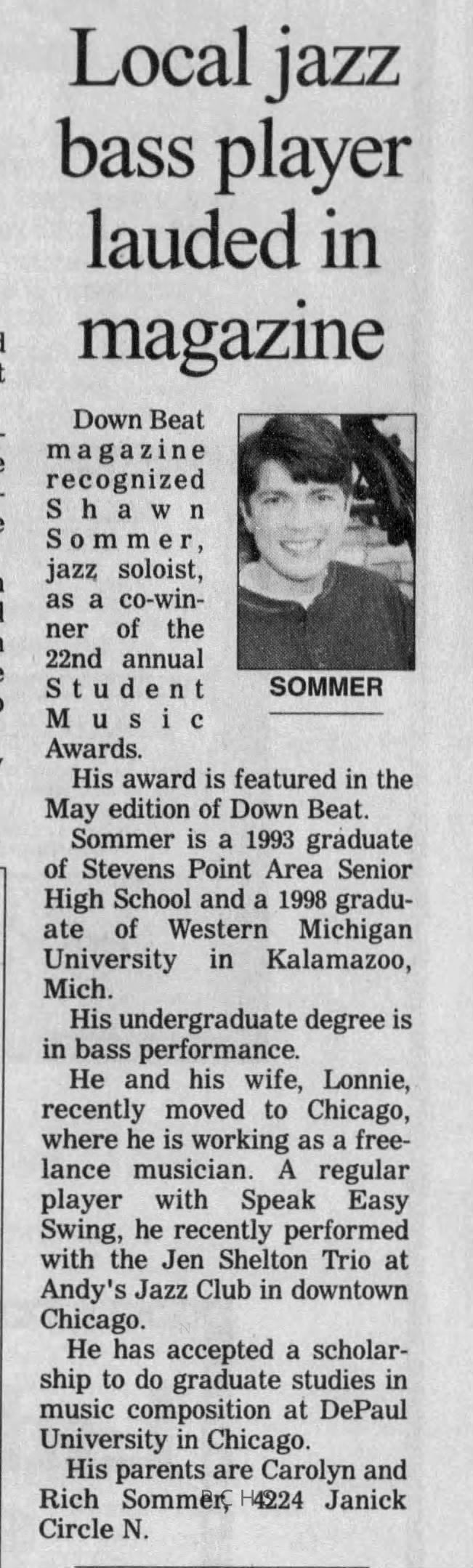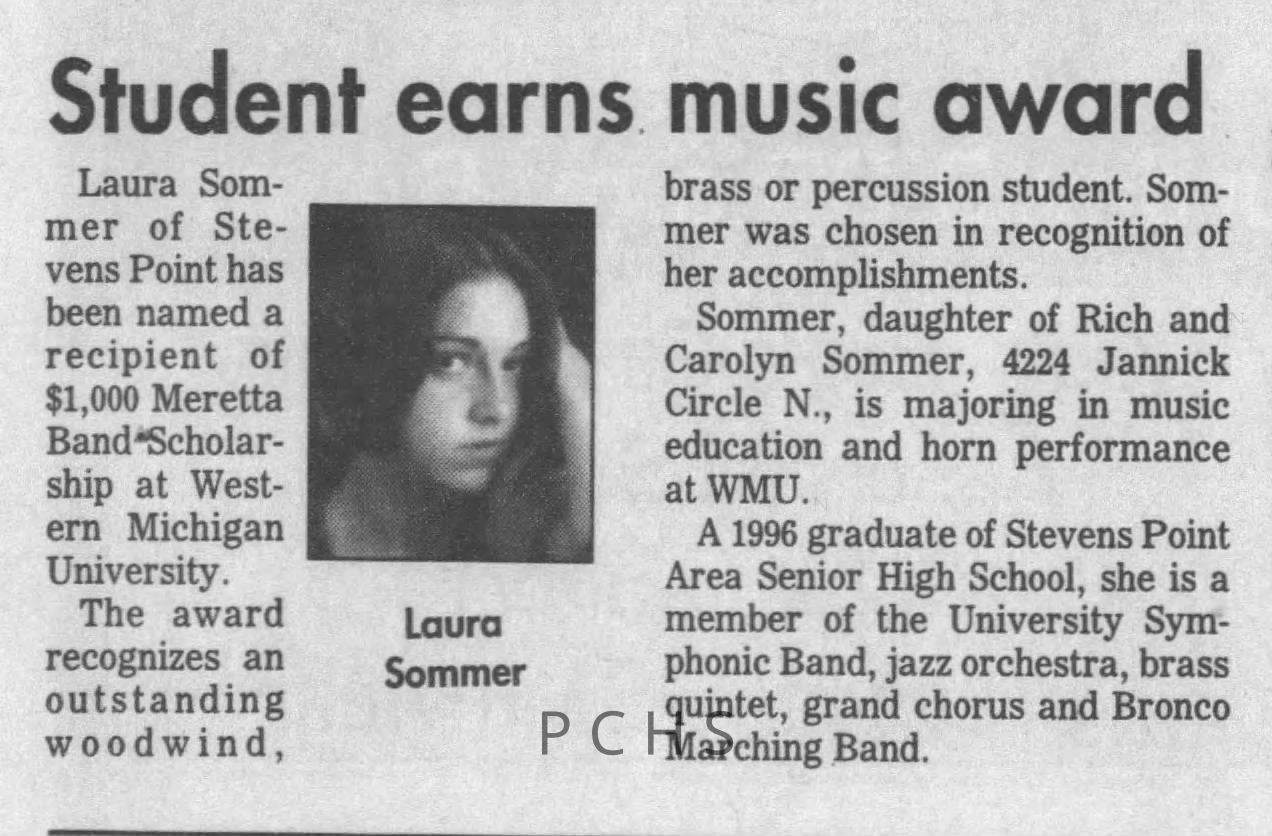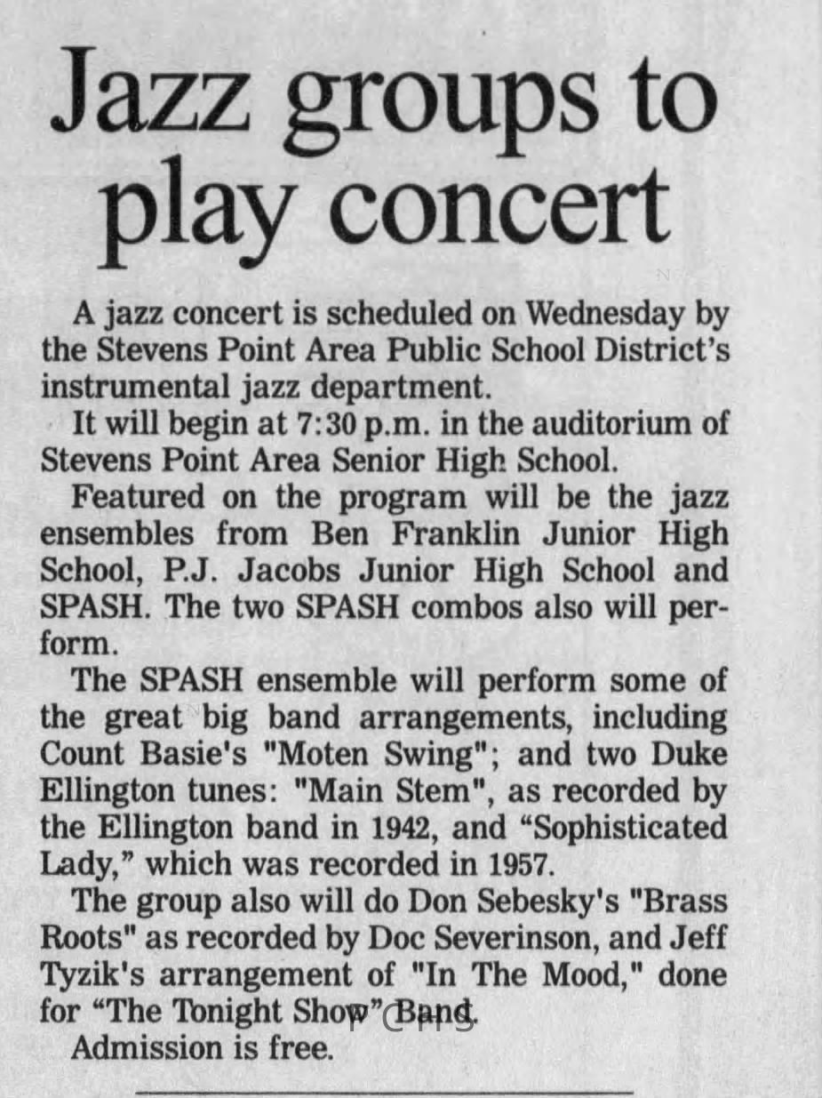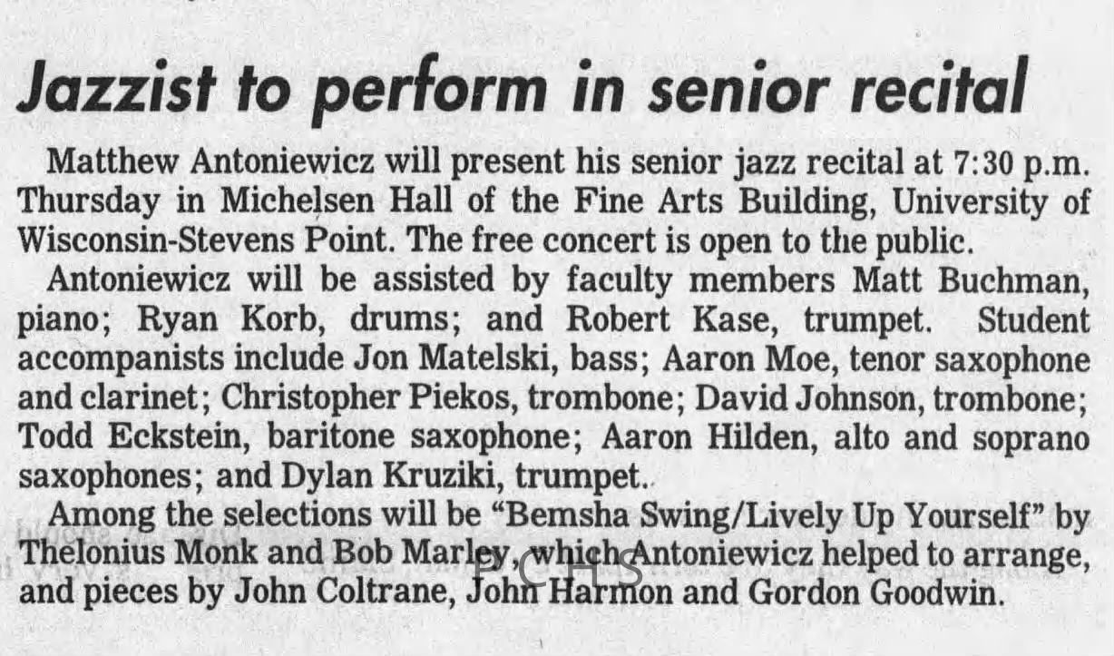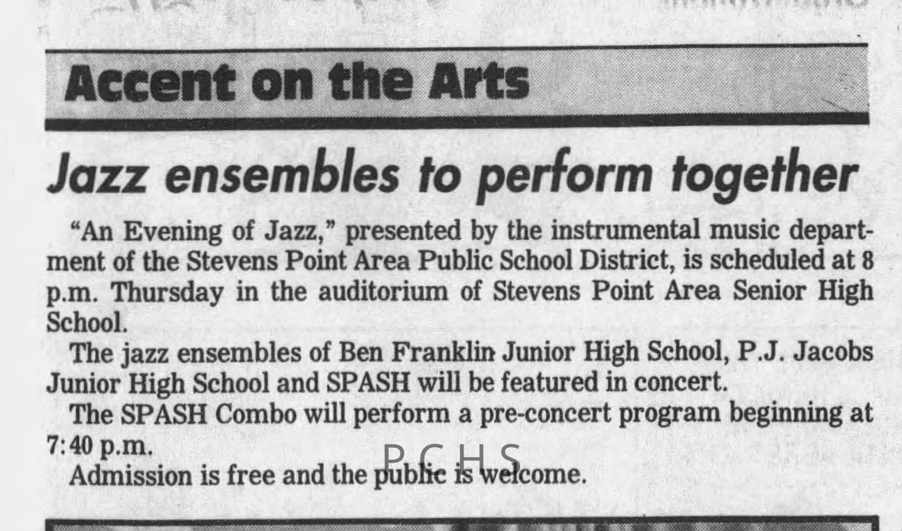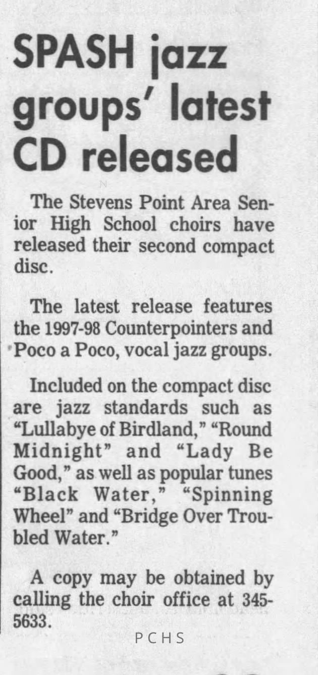 Newspaper clippings from Portage County newspapers. These clippings show jazz musicians, bands, events, school organizations, and traveling shows from 1996-2000. Some highlighted topics are Shawn Sommer, SPASH jazz ensemble, Don Chesebro, Thomas George, Rosholt, UWSP Mardi Gras Ball, CWSO, Poco a Poco, Don Greene, Ben Franklin Junior High, Riverfront Rendezvous, Dick Johnson, Almond-Bancroft, Todd Gustafson, Mike Metheny, John Greiner, John Altenburgh, Janet Planet, WWSP, jazzfest, Kip Gutke, Matt Dow, Bethany Ackeret, Counterpointers, PJ Jacobs, Big Band Express, Erin McLennon, Lindsey Quick, jazz lab band, Breanne Hetzel, Brian Reince, Matthew Antoniewicz, CWSO, Gold Company, David Hastings, Amanda Sommers, Laura Sommer, Jazz Point, Laura Caviani, Karrin Allyson, Soiree Musicale, Pacelli high school, Krazy Days, May Erickson, Wisconsin Christmas Jazz and Blues Show, Abbie Betinis, Greg Wright, Dave Kiepert, Jeff Erickson, Down Beat Ensemble, Pops Concert, Richard Johnson, Swing into Action, River Cities Jazz, Bob Kase Quartet, Don Chesebro Swing Quartet, Dennis Provisor.Created By