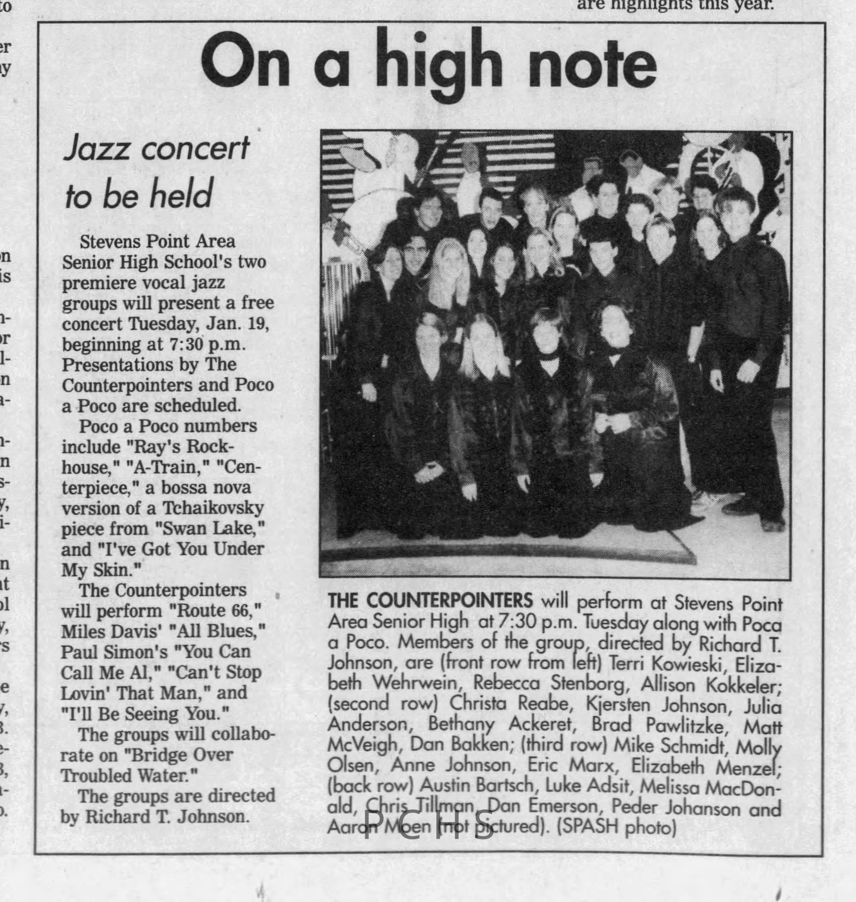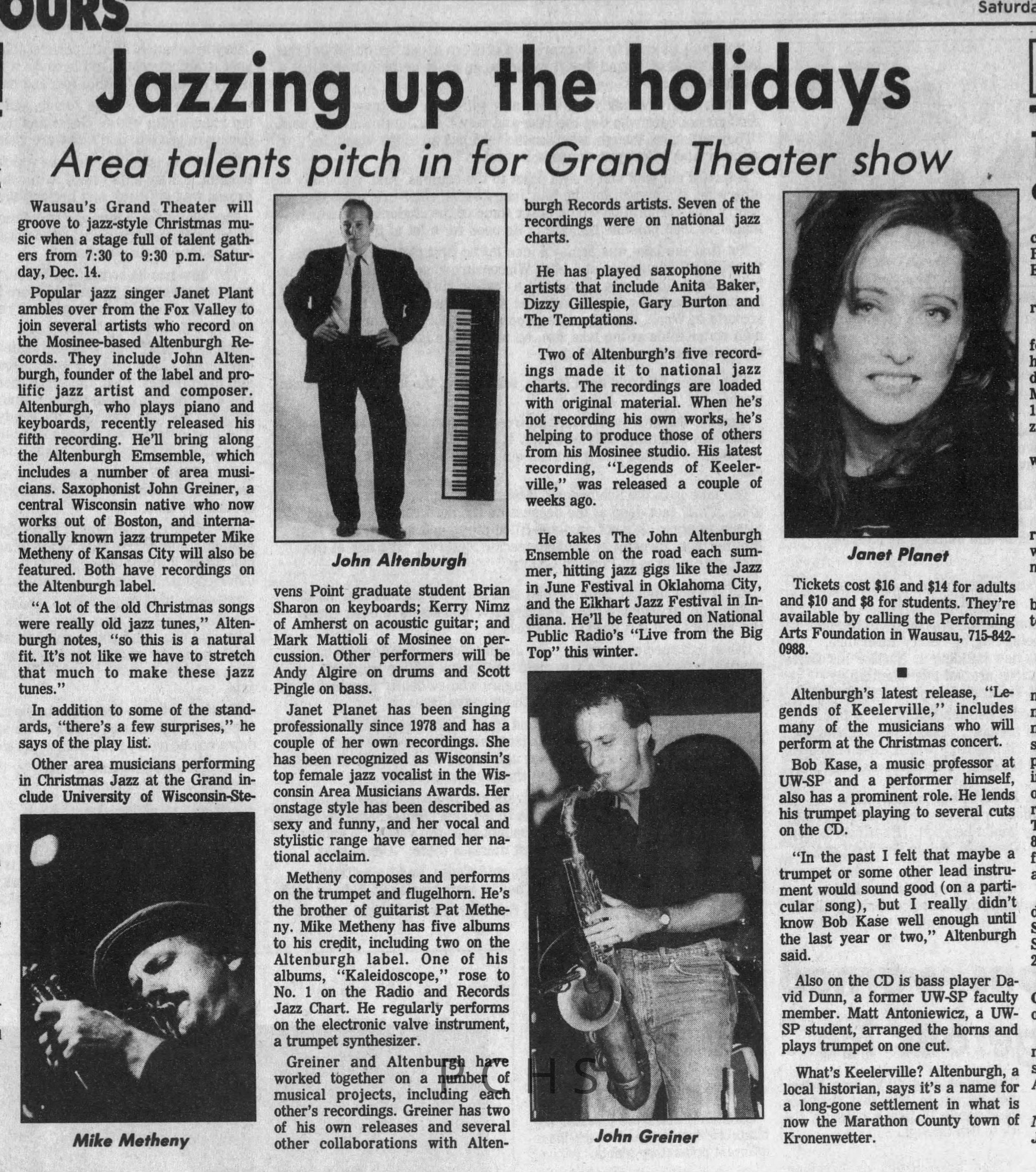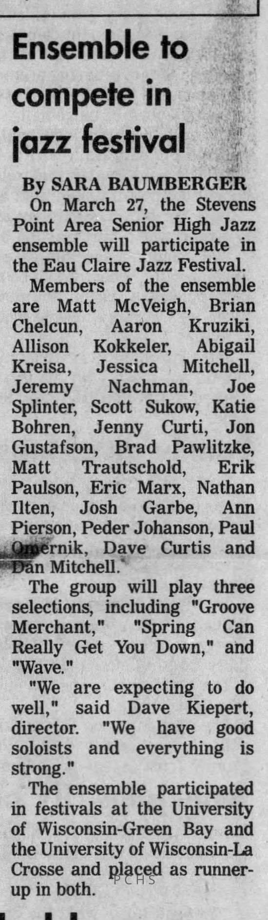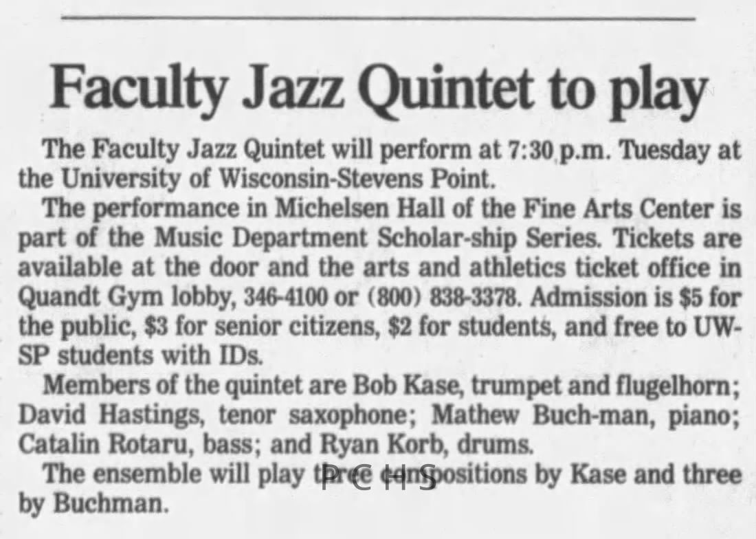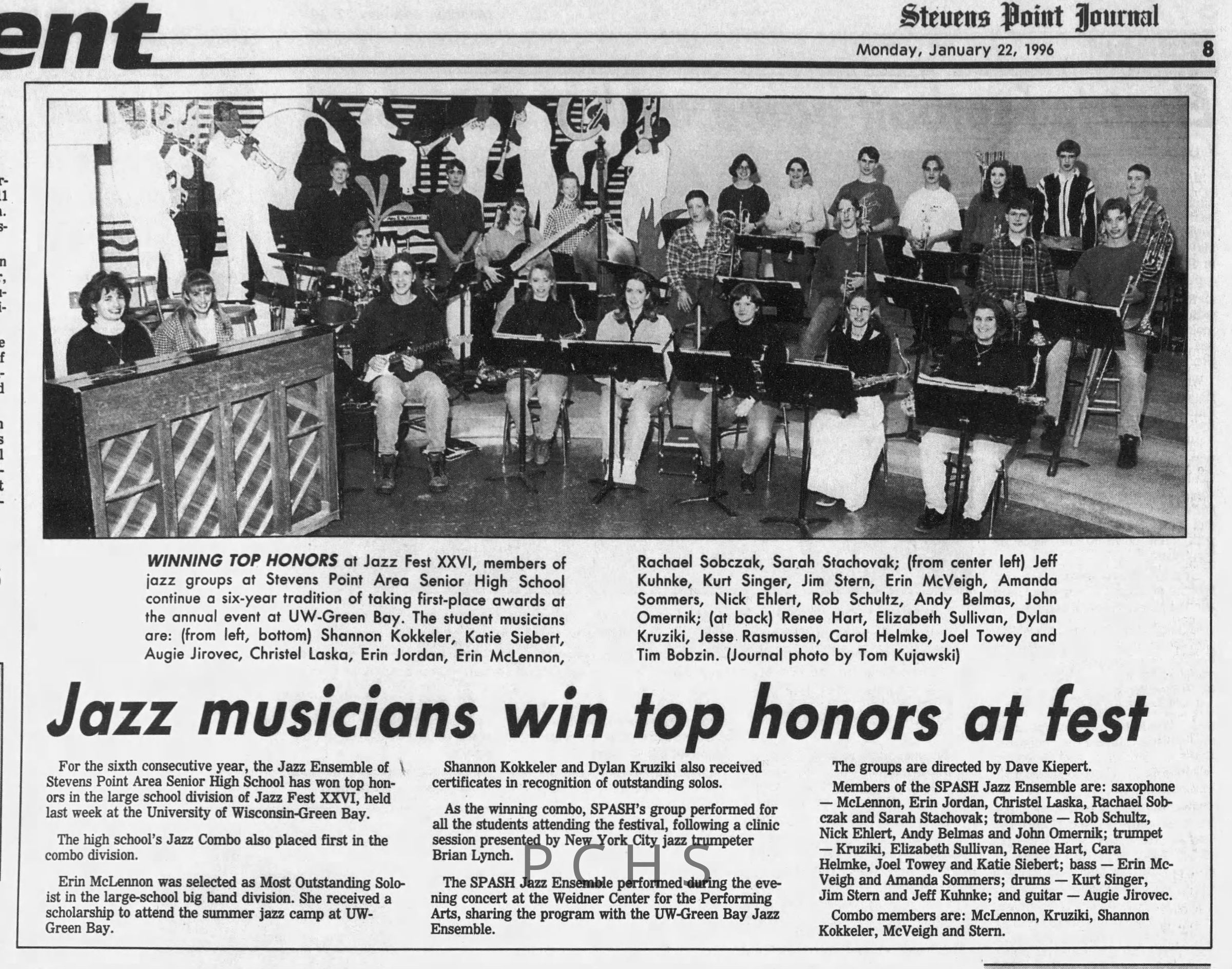 Newspaper clippings from Portage County newspapers. These clippings show jazz musicians, bands, events, school organizations, and traveling shows from 1996-2000. Some highlighted topics are Shawn Sommer, SPASH jazz ensemble, Don Chesebro, Thomas George, Rosholt, UWSP Mardi Gras Ball, CWSO, Poco a Poco, Don Greene, Ben Franklin Junior High, Riverfront Rendezvous, Dick Johnson, Almond-Bancroft, Todd Gustafson, Mike Metheny, John Greiner, John Altenburgh, Janet Planet, WWSP, jazzfest, Kip Gutke, Matt Dow, Bethany Ackeret, Counterpointers, PJ Jacobs, Big Band Express, Erin McLennon, Lindsey Quick, jazz lab band, Breanne Hetzel, Brian Reince, Matthew Antoniewicz, CWSO, Gold Company, David Hastings, Amanda Sommers, Laura Sommer, Jazz Point, Laura Caviani, Karrin Allyson, Soiree Musicale, Pacelli high school, Krazy Days, May Erickson, Wisconsin Christmas Jazz and Blues Show, Abbie Betinis, Greg Wright, Dave Kiepert, Jeff Erickson, Down Beat Ensemble, Pops Concert, Richard Johnson, Swing into Action, River Cities Jazz, Bob Kase Quartet, Don Chesebro Swing Quartet, Dennis Provisor.Created By
