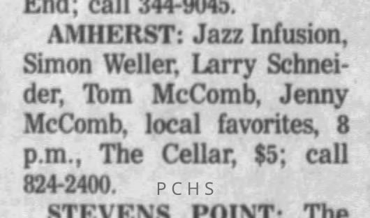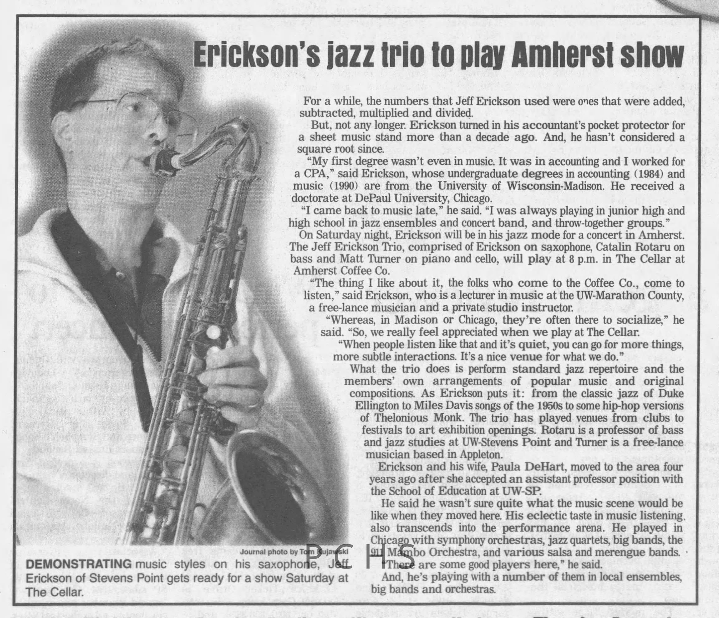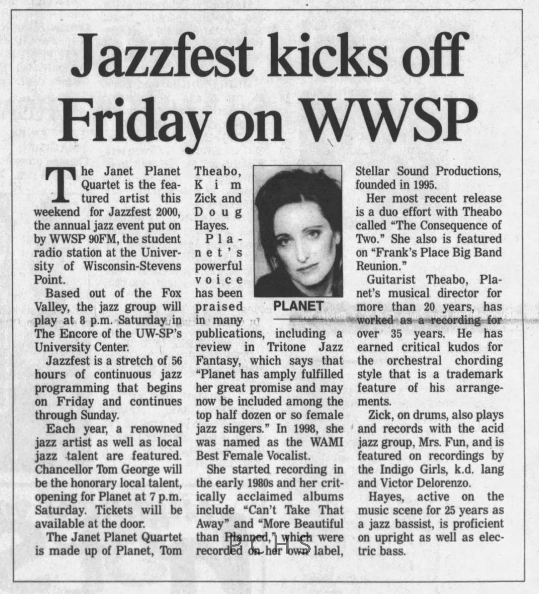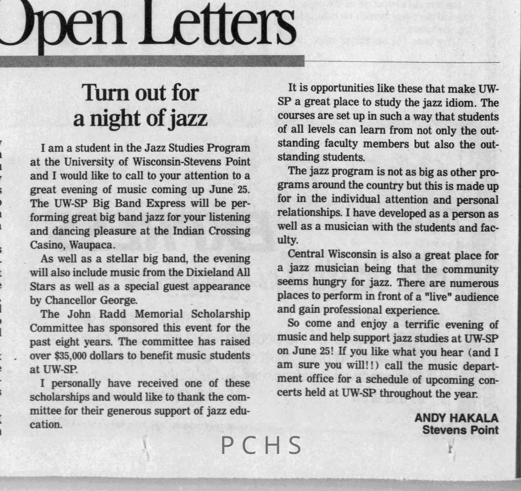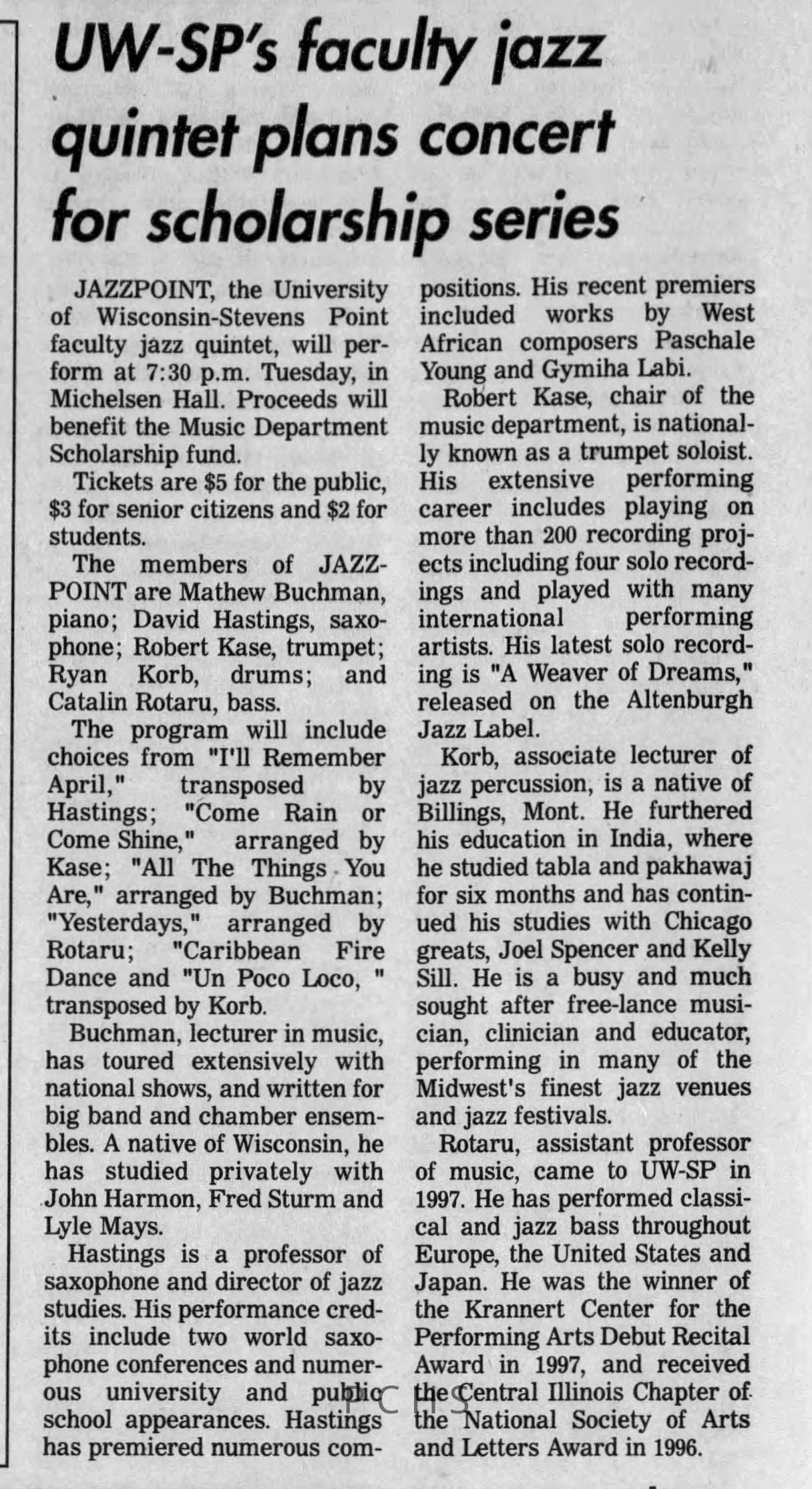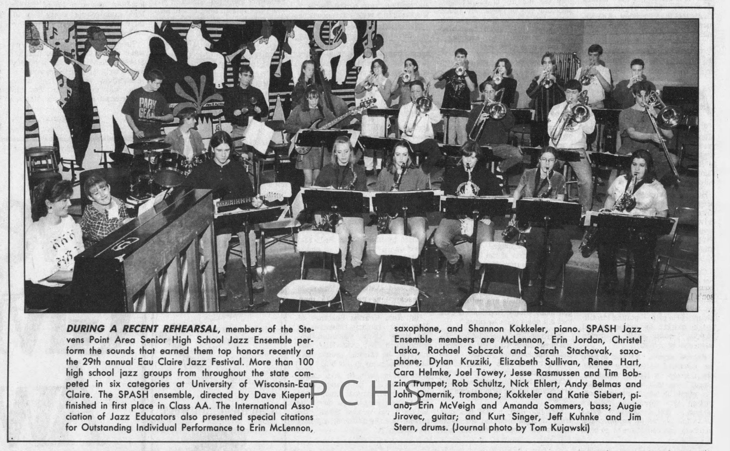 Newspaper clippings from Portage County newspapers. These clippings show jazz musicians, bands, events, school organizations, and traveling shows from 1996-2000. Some highlighted topics are Shawn Sommer, SPASH jazz ensemble, Don Chesebro, Thomas George, Rosholt, UWSP Mardi Gras Ball, CWSO, Poco a Poco, Don Greene, Ben Franklin Junior High, Riverfront Rendezvous, Dick Johnson, Almond-Bancroft, Todd Gustafson, Mike Metheny, John Greiner, John Altenburgh, Janet Planet, WWSP, jazzfest, Kip Gutke, Matt Dow, Bethany Ackeret, Counterpointers, PJ Jacobs, Big Band Express, Erin McLennon, Lindsey Quick, jazz lab band, Breanne Hetzel, Brian Reince, Matthew Antoniewicz, CWSO, Gold Company, David Hastings, Amanda Sommers, Laura Sommer, Jazz Point, Laura Caviani, Karrin Allyson, Soiree Musicale, Pacelli high school, Krazy Days, May Erickson, Wisconsin Christmas Jazz and Blues Show, Abbie Betinis, Greg Wright, Dave Kiepert, Jeff Erickson, Down Beat Ensemble, Pops Concert, Richard Johnson, Swing into Action, River Cities Jazz, Bob Kase Quartet, Don Chesebro Swing Quartet, Dennis Provisor.Created By
