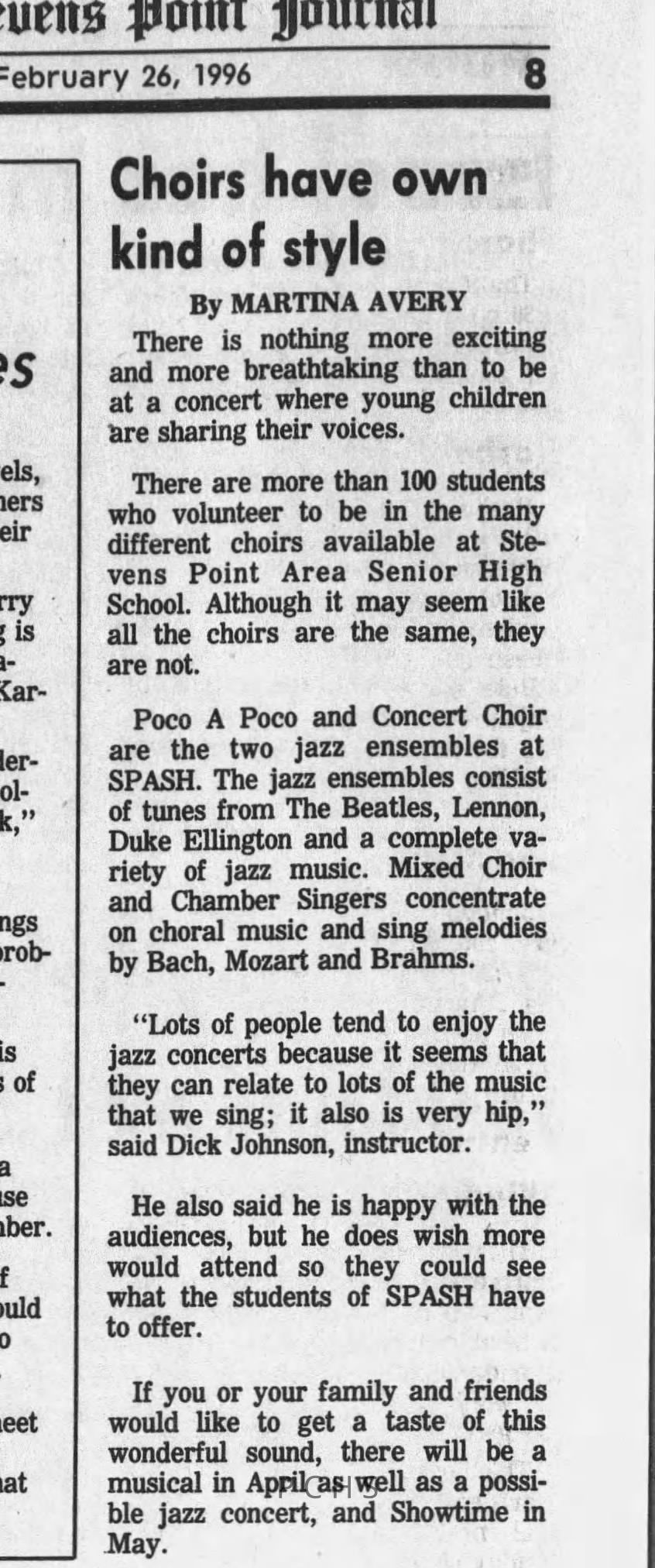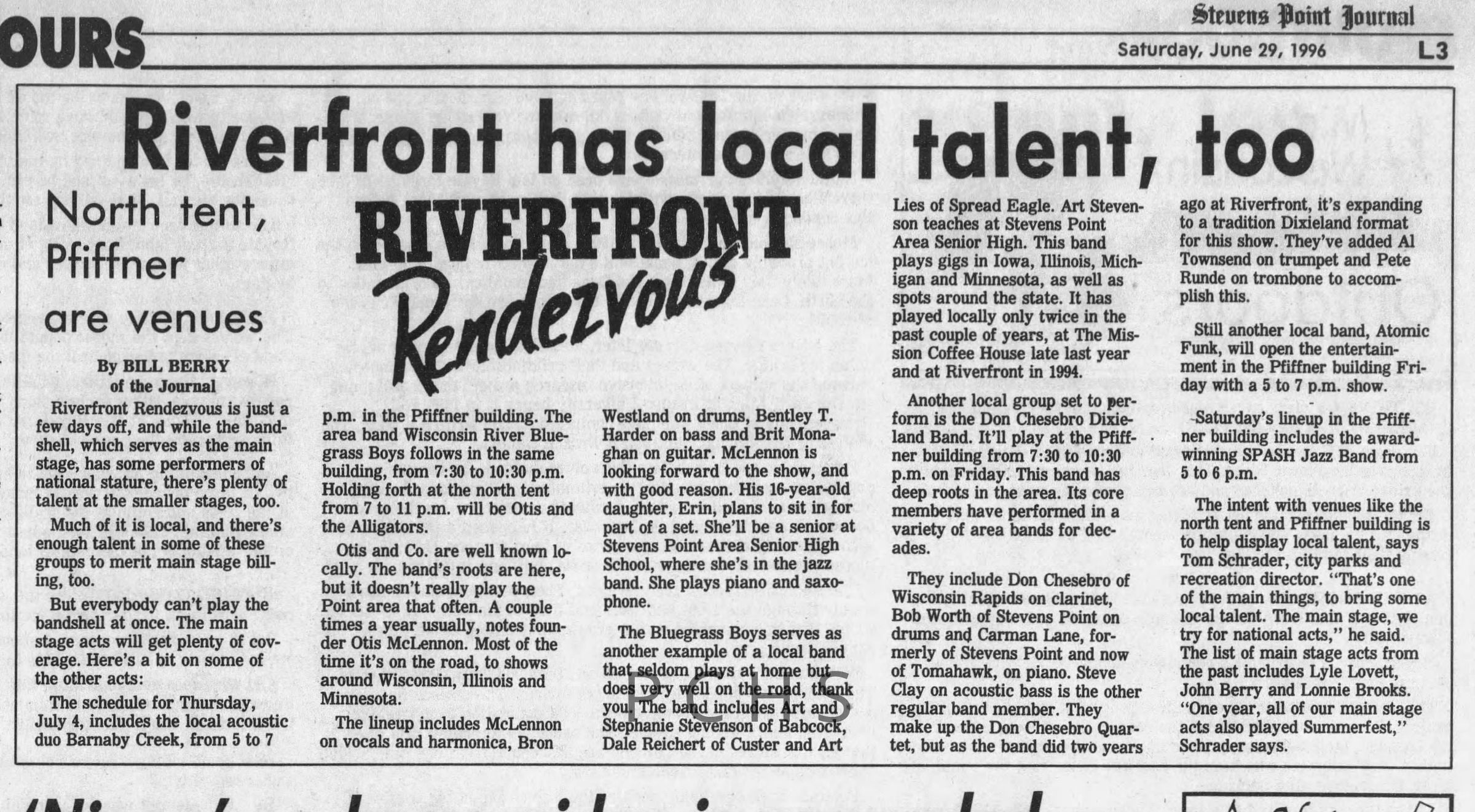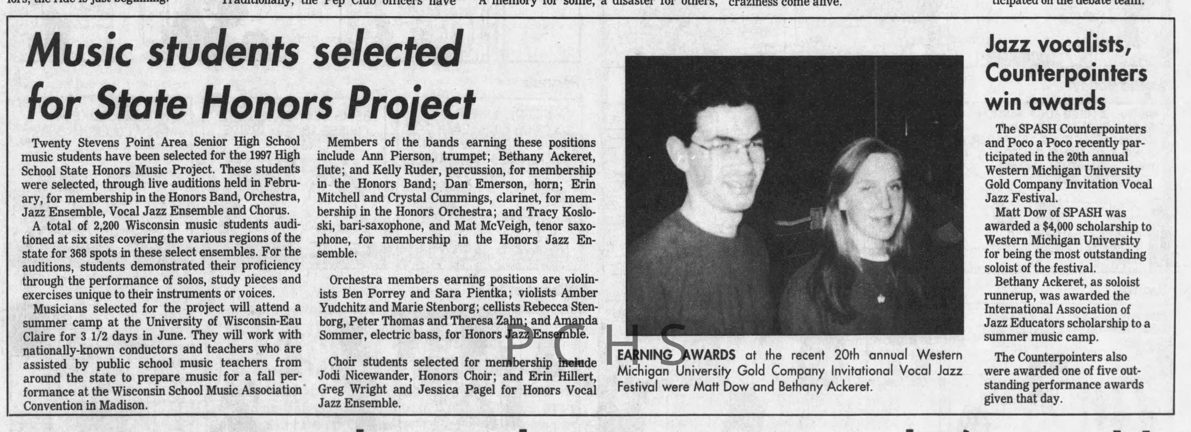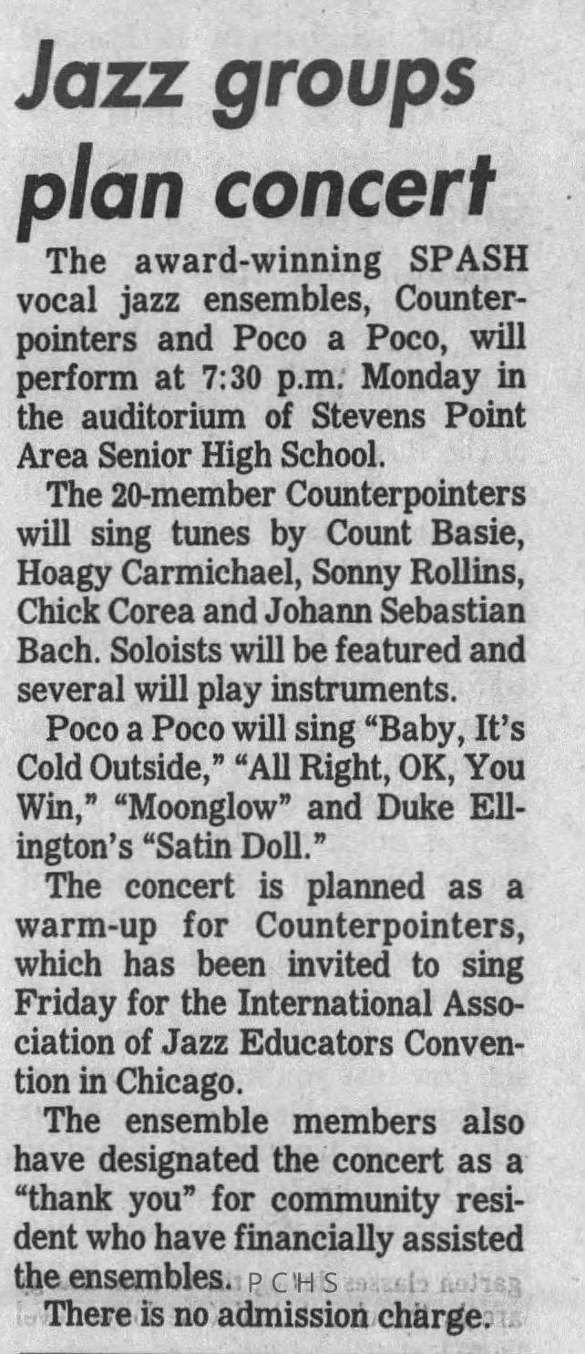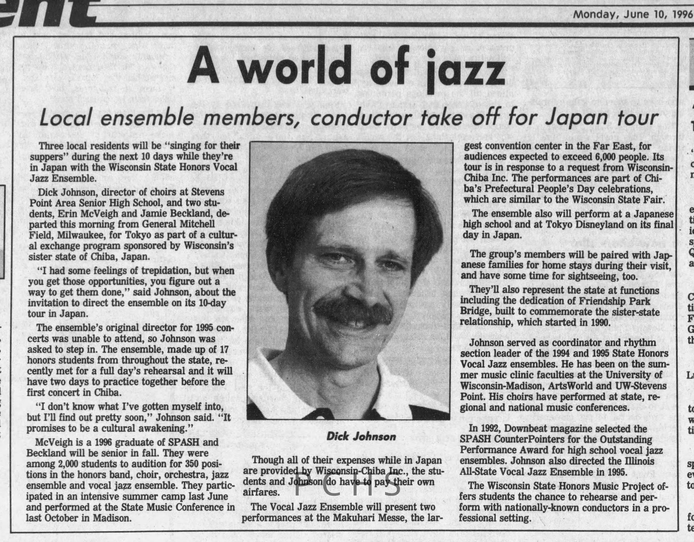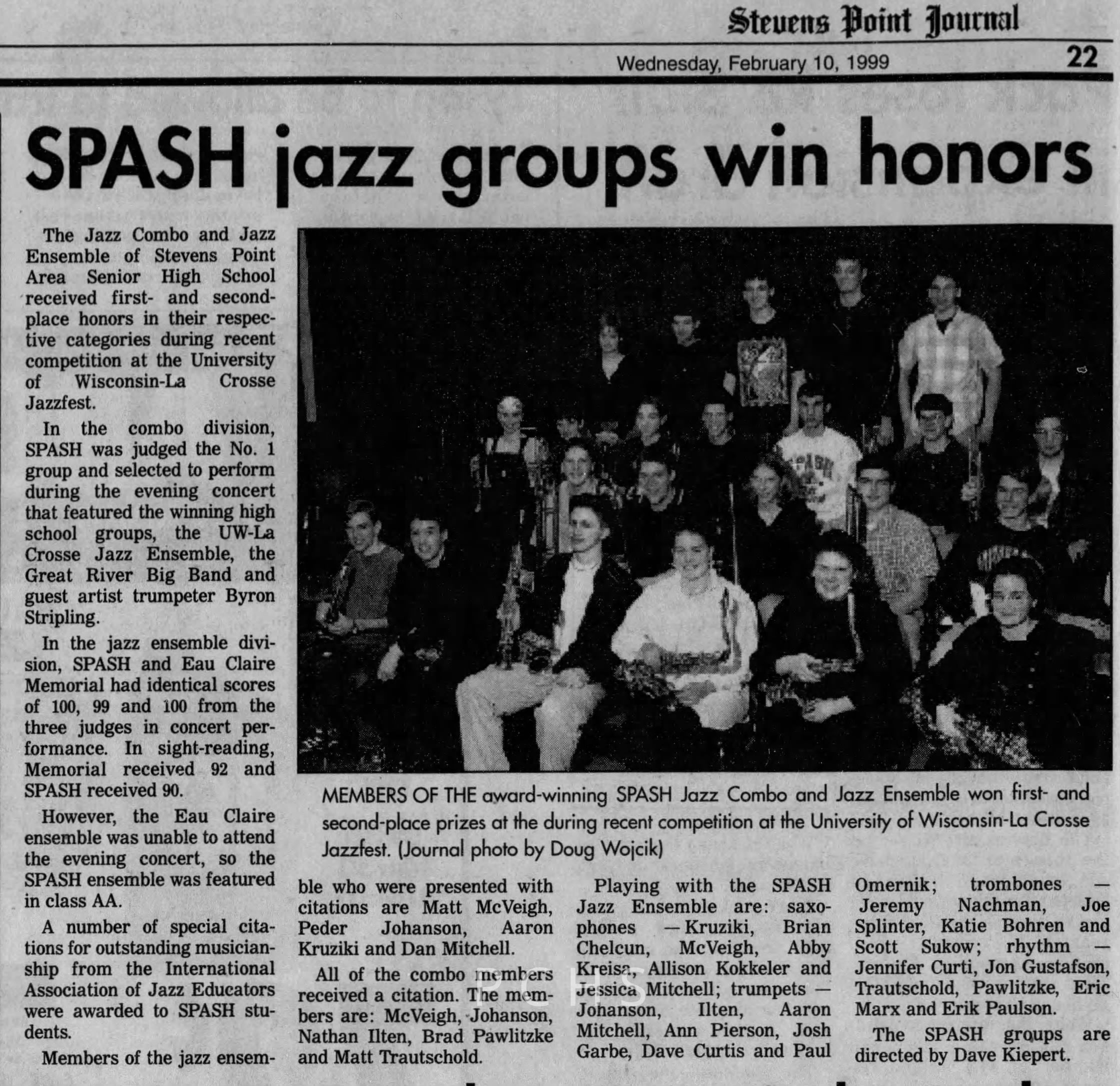 Newspaper clippings from Portage County newspapers. These clippings show jazz musicians, bands, events, school organizations, and traveling shows from 1996-2000. Some highlighted topics are Shawn Sommer, SPASH jazz ensemble, Don Chesebro, Thomas George, Rosholt, UWSP Mardi Gras Ball, CWSO, Poco a Poco, Don Greene, Ben Franklin Junior High, Riverfront Rendezvous, Dick Johnson, Almond-Bancroft, Todd Gustafson, Mike Metheny, John Greiner, John Altenburgh, Janet Planet, WWSP, jazzfest, Kip Gutke, Matt Dow, Bethany Ackeret, Counterpointers, PJ Jacobs, Big Band Express, Erin McLennon, Lindsey Quick, jazz lab band, Breanne Hetzel, Brian Reince, Matthew Antoniewicz, CWSO, Gold Company, David Hastings, Amanda Sommers, Laura Sommer, Jazz Point, Laura Caviani, Karrin Allyson, Soiree Musicale, Pacelli high school, Krazy Days, May Erickson, Wisconsin Christmas Jazz and Blues Show, Abbie Betinis, Greg Wright, Dave Kiepert, Jeff Erickson, Down Beat Ensemble, Pops Concert, Richard Johnson, Swing into Action, River Cities Jazz, Bob Kase Quartet, Don Chesebro Swing Quartet, Dennis Provisor.Created By