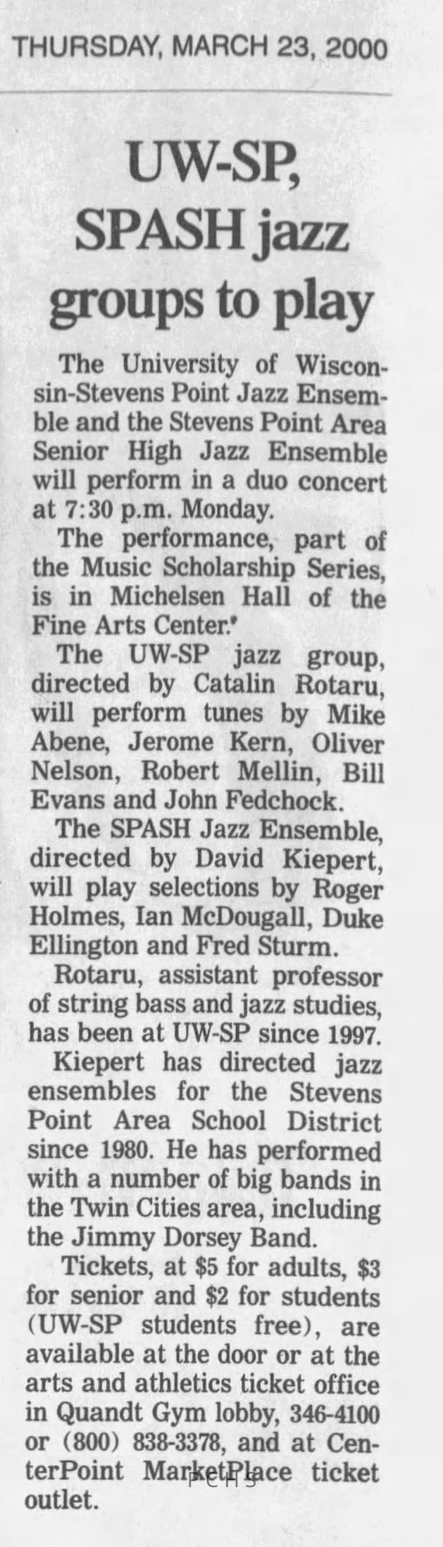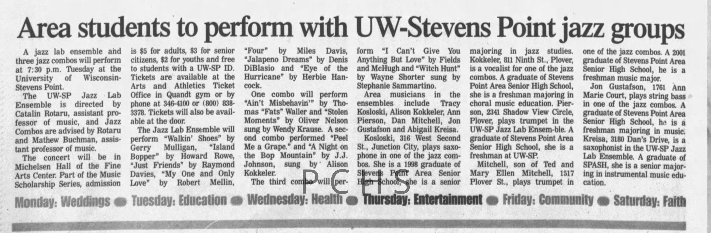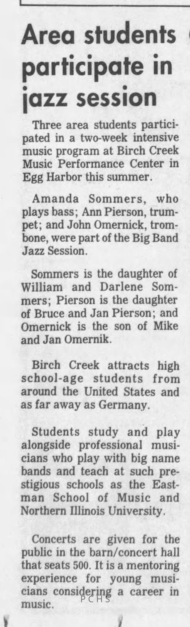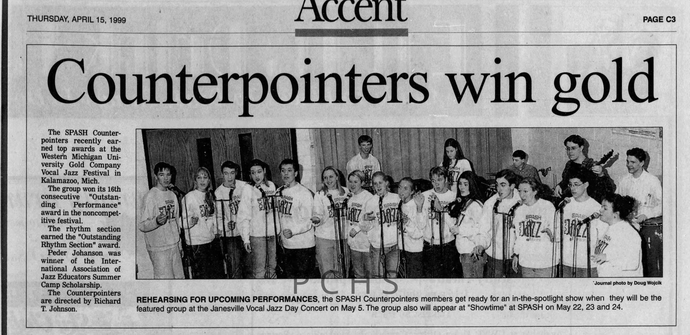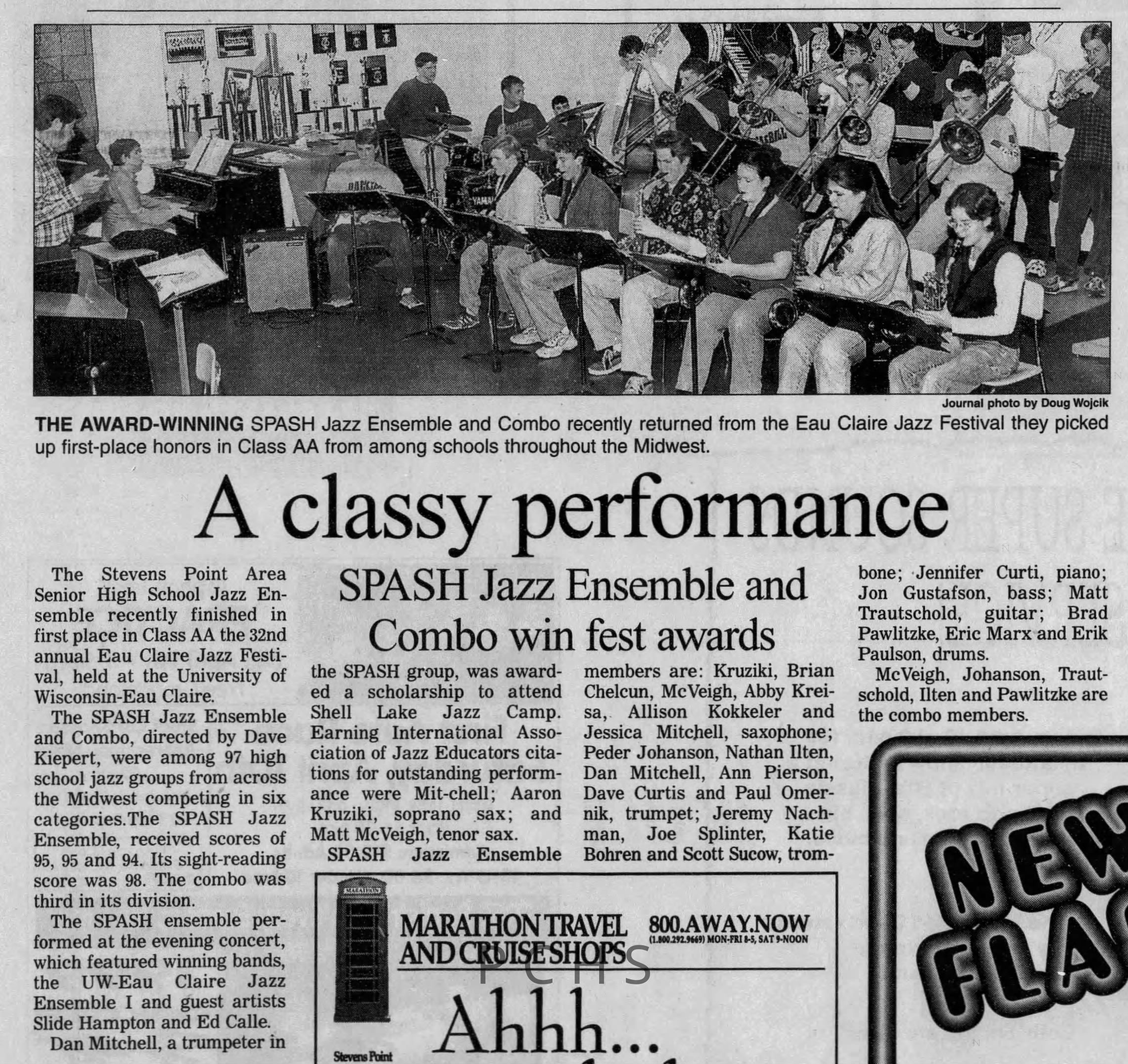 Newspaper clippings from Portage County newspapers. These clippings show jazz musicians, bands, events, school organizations, and traveling shows from 1996-2000. Some highlighted topics are Shawn Sommer, SPASH jazz ensemble, Don Chesebro, Thomas George, Rosholt, UWSP Mardi Gras Ball, CWSO, Poco a Poco, Don Greene, Ben Franklin Junior High, Riverfront Rendezvous, Dick Johnson, Almond-Bancroft, Todd Gustafson, Mike Metheny, John Greiner, John Altenburgh, Janet Planet, WWSP, jazzfest, Kip Gutke, Matt Dow, Bethany Ackeret, Counterpointers, PJ Jacobs, Big Band Express, Erin McLennon, Lindsey Quick, jazz lab band, Breanne Hetzel, Brian Reince, Matthew Antoniewicz, CWSO, Gold Company, David Hastings, Amanda Sommers, Laura Sommer, Jazz Point, Laura Caviani, Karrin Allyson, Soiree Musicale, Pacelli high school, Krazy Days, May Erickson, Wisconsin Christmas Jazz and Blues Show, Abbie Betinis, Greg Wright, Dave Kiepert, Jeff Erickson, Down Beat Ensemble, Pops Concert, Richard Johnson, Swing into Action, River Cities Jazz, Bob Kase Quartet, Don Chesebro Swing Quartet, Dennis Provisor.Created By