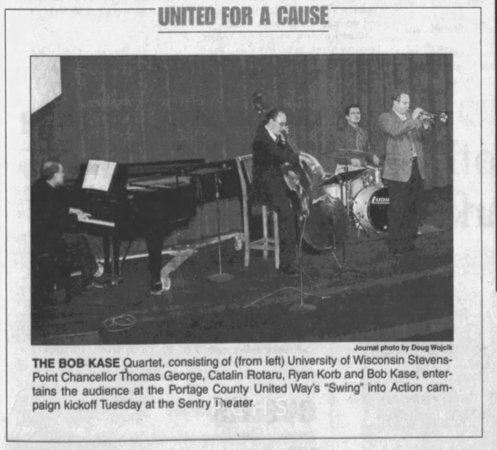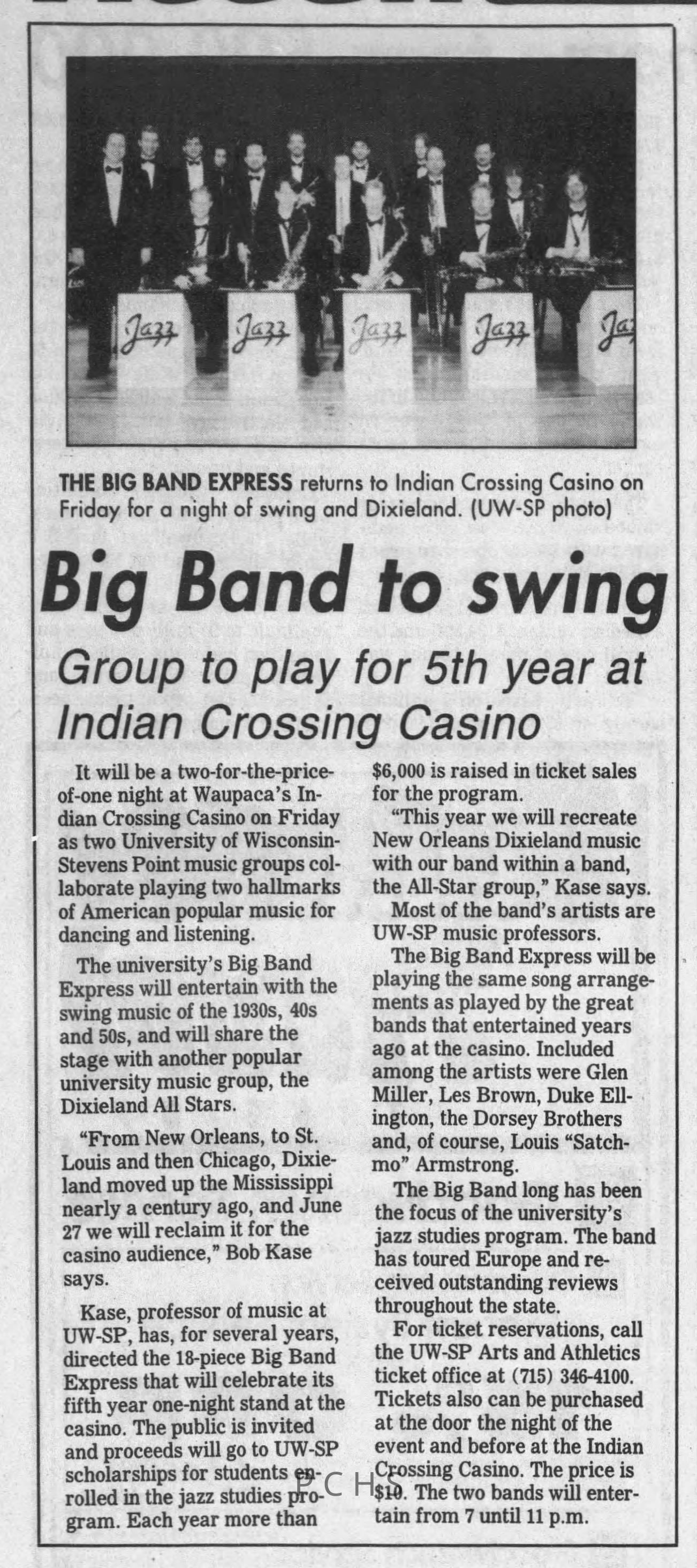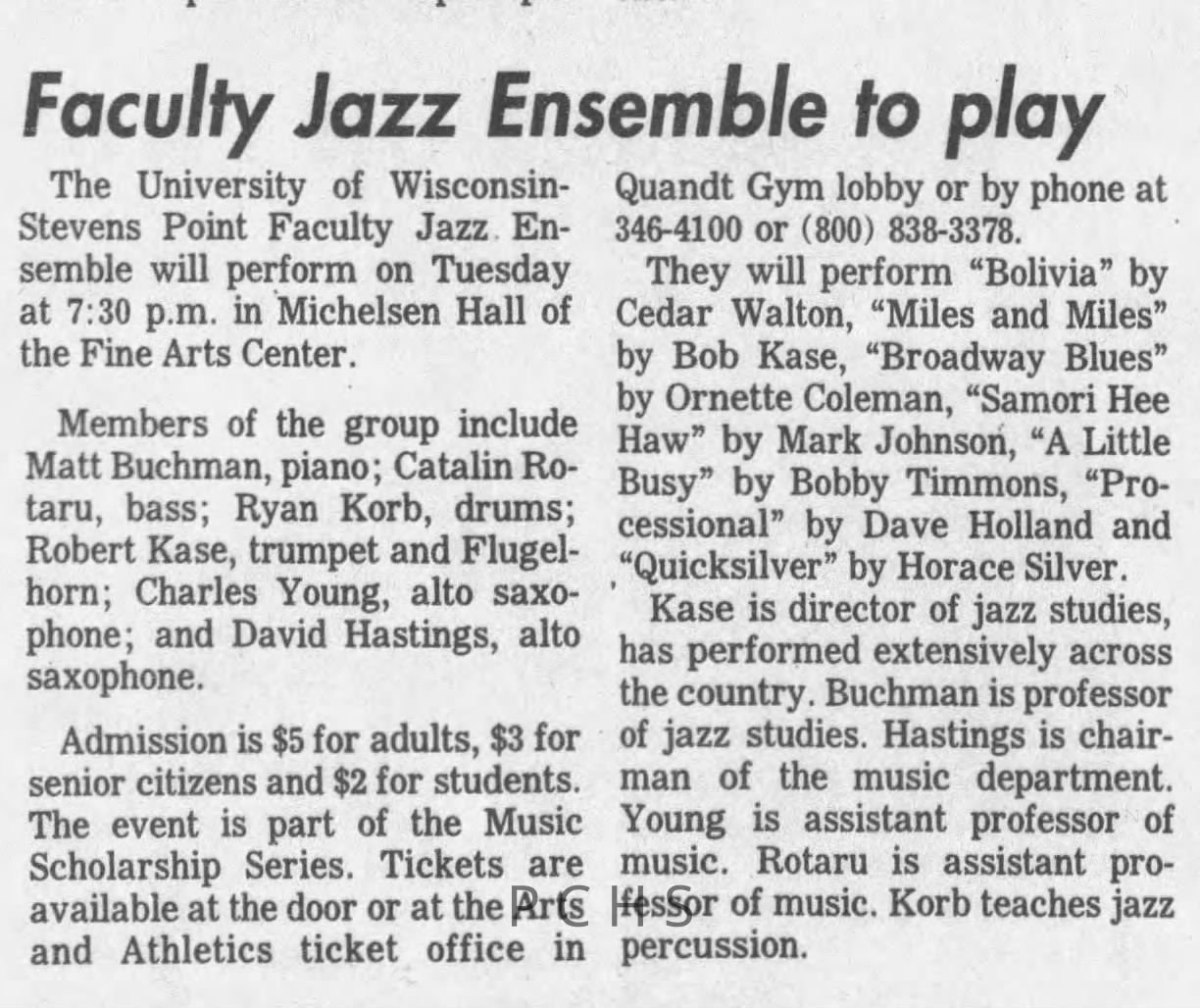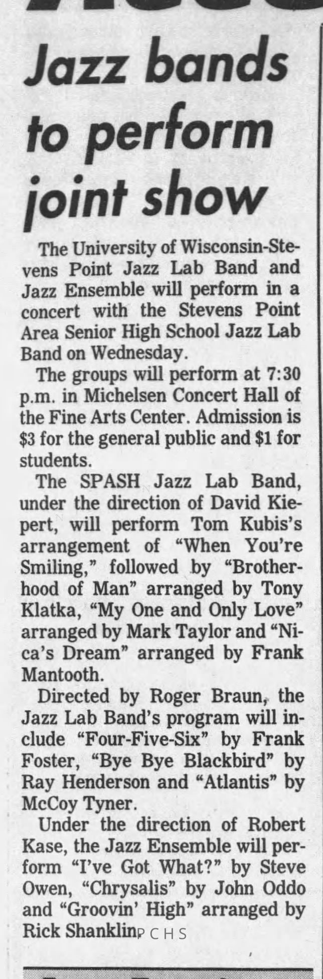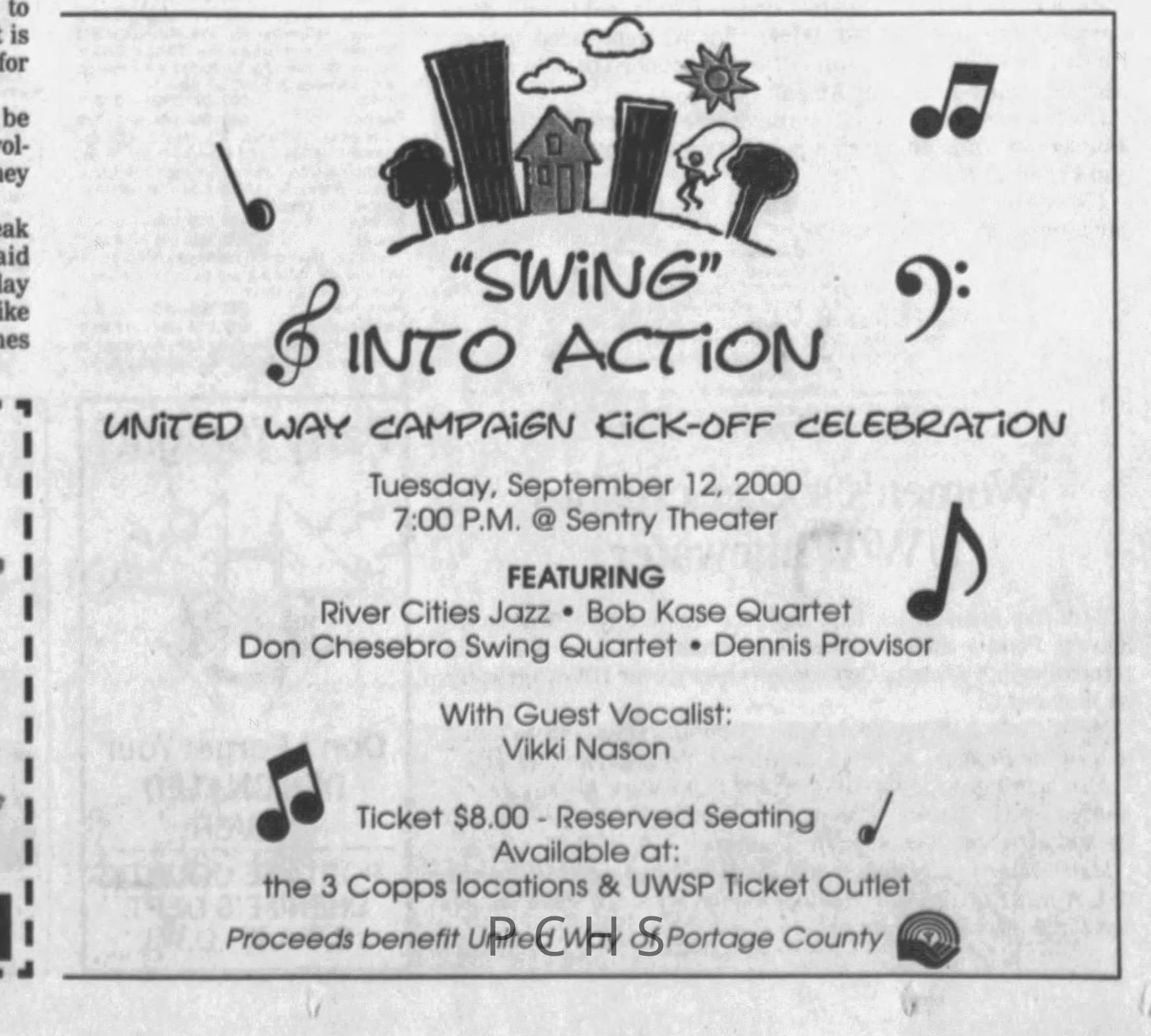 Newspaper clippings from Portage County newspapers. These clippings show jazz musicians, bands, events, school organizations, and traveling shows from 1996-2000. Some highlighted topics are Shawn Sommer, SPASH jazz ensemble, Don Chesebro, Thomas George, Rosholt, UWSP Mardi Gras Ball, CWSO, Poco a Poco, Don Greene, Ben Franklin Junior High, Riverfront Rendezvous, Dick Johnson, Almond-Bancroft, Todd Gustafson, Mike Metheny, John Greiner, John Altenburgh, Janet Planet, WWSP, jazzfest, Kip Gutke, Matt Dow, Bethany Ackeret, Counterpointers, PJ Jacobs, Big Band Express, Erin McLennon, Lindsey Quick, jazz lab band, Breanne Hetzel, Brian Reince, Matthew Antoniewicz, CWSO, Gold Company, David Hastings, Amanda Sommers, Laura Sommer, Jazz Point, Laura Caviani, Karrin Allyson, Soiree Musicale, Pacelli high school, Krazy Days, May Erickson, Wisconsin Christmas Jazz and Blues Show, Abbie Betinis, Greg Wright, Dave Kiepert, Jeff Erickson, Down Beat Ensemble, Pops Concert, Richard Johnson, Swing into Action, River Cities Jazz, Bob Kase Quartet, Don Chesebro Swing Quartet, Dennis Provisor.Created By