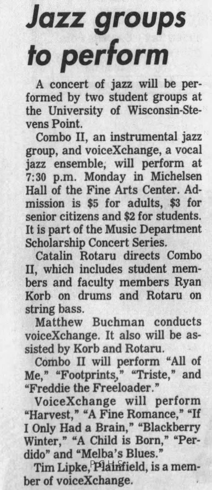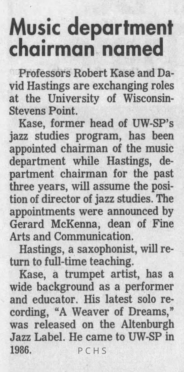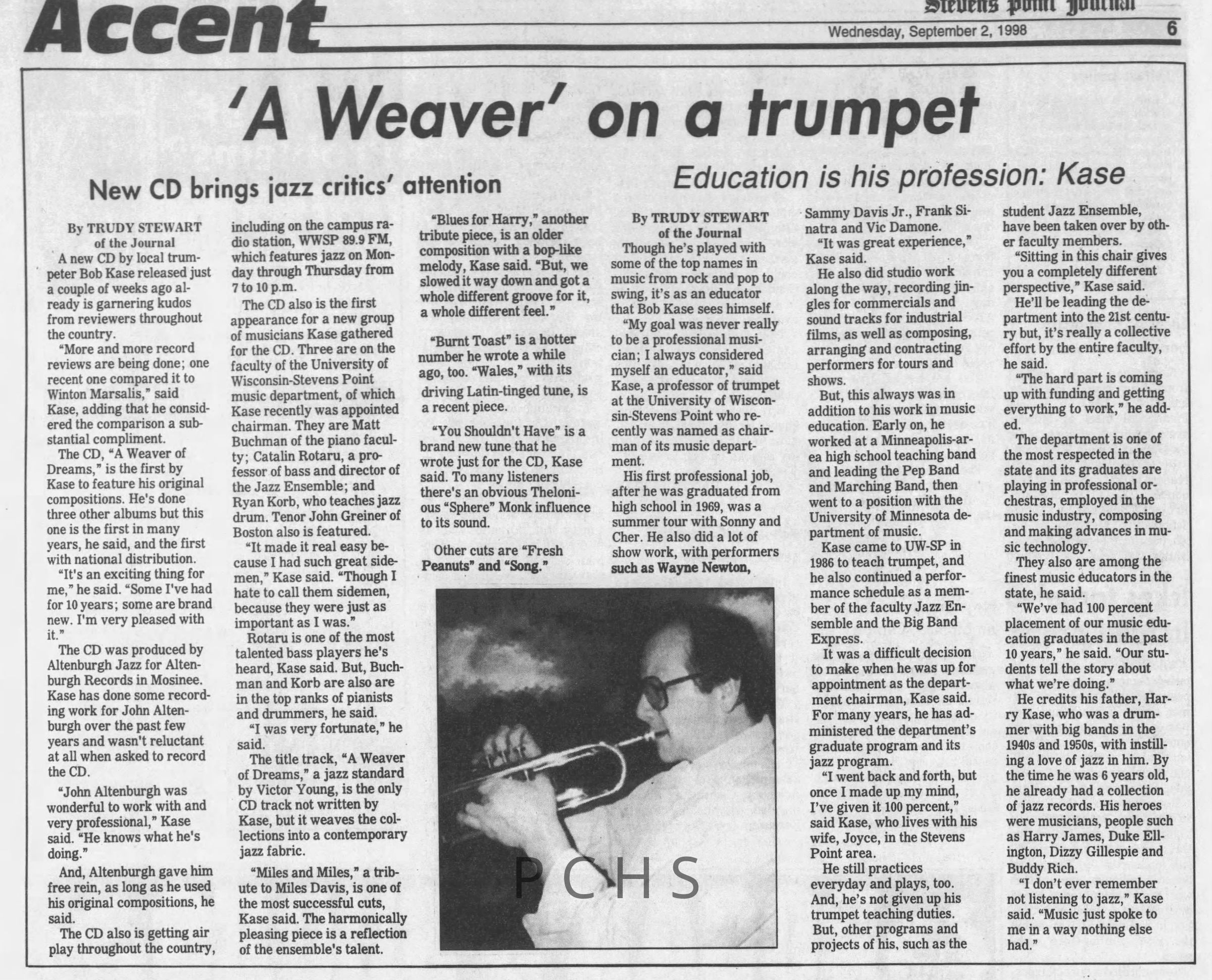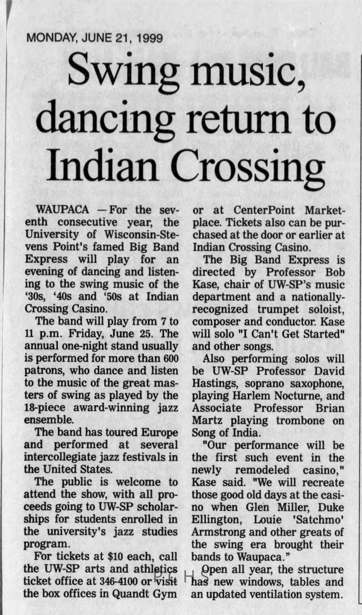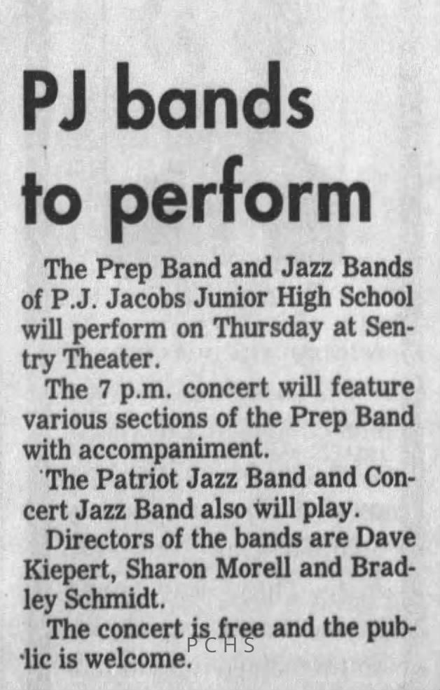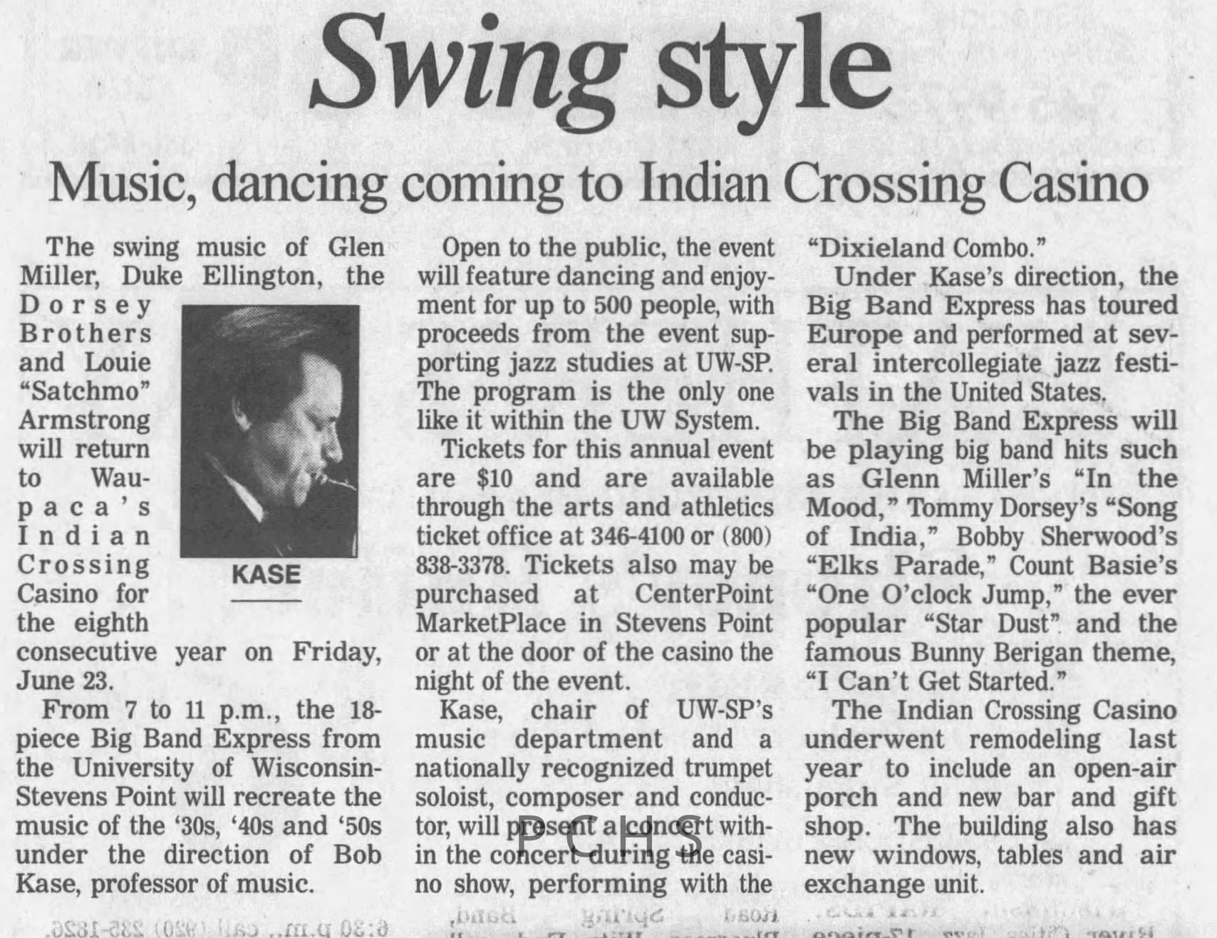 Newspaper clippings from Portage County newspapers. These clippings show jazz musicians, bands, events, school organizations, and traveling shows from 1996-2000. Some highlighted topics are Shawn Sommer, SPASH jazz ensemble, Don Chesebro, Thomas George, Rosholt, UWSP Mardi Gras Ball, CWSO, Poco a Poco, Don Greene, Ben Franklin Junior High, Riverfront Rendezvous, Dick Johnson, Almond-Bancroft, Todd Gustafson, Mike Metheny, John Greiner, John Altenburgh, Janet Planet, WWSP, jazzfest, Kip Gutke, Matt Dow, Bethany Ackeret, Counterpointers, PJ Jacobs, Big Band Express, Erin McLennon, Lindsey Quick, jazz lab band, Breanne Hetzel, Brian Reince, Matthew Antoniewicz, CWSO, Gold Company, David Hastings, Amanda Sommers, Laura Sommer, Jazz Point, Laura Caviani, Karrin Allyson, Soiree Musicale, Pacelli high school, Krazy Days, May Erickson, Wisconsin Christmas Jazz and Blues Show, Abbie Betinis, Greg Wright, Dave Kiepert, Jeff Erickson, Down Beat Ensemble, Pops Concert, Richard Johnson, Swing into Action, River Cities Jazz, Bob Kase Quartet, Don Chesebro Swing Quartet, Dennis Provisor.Created By