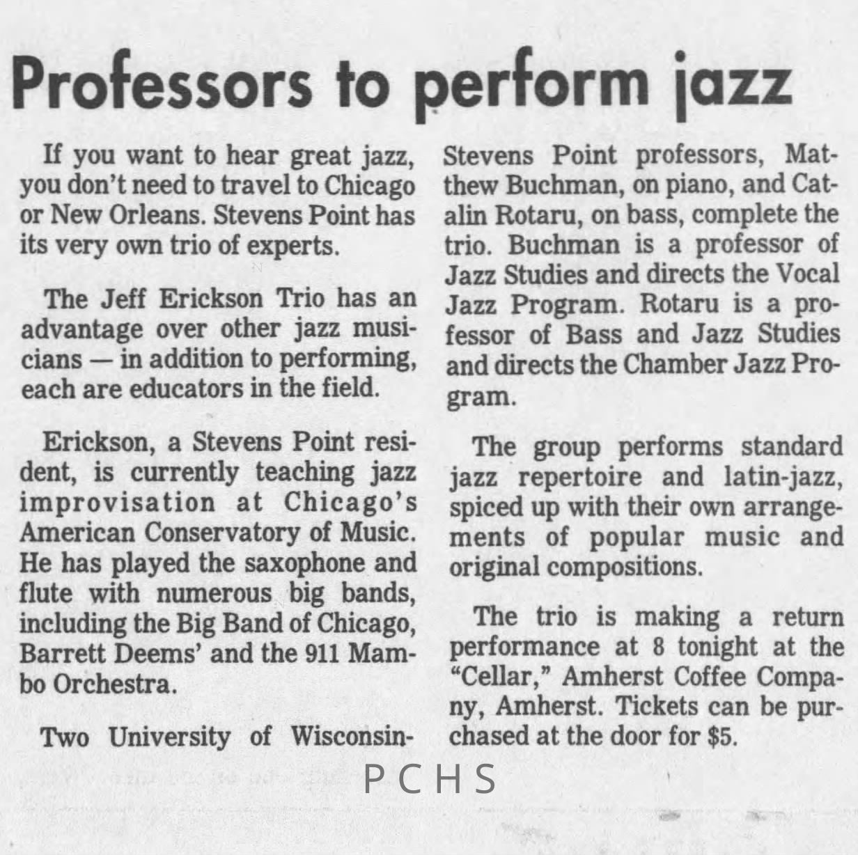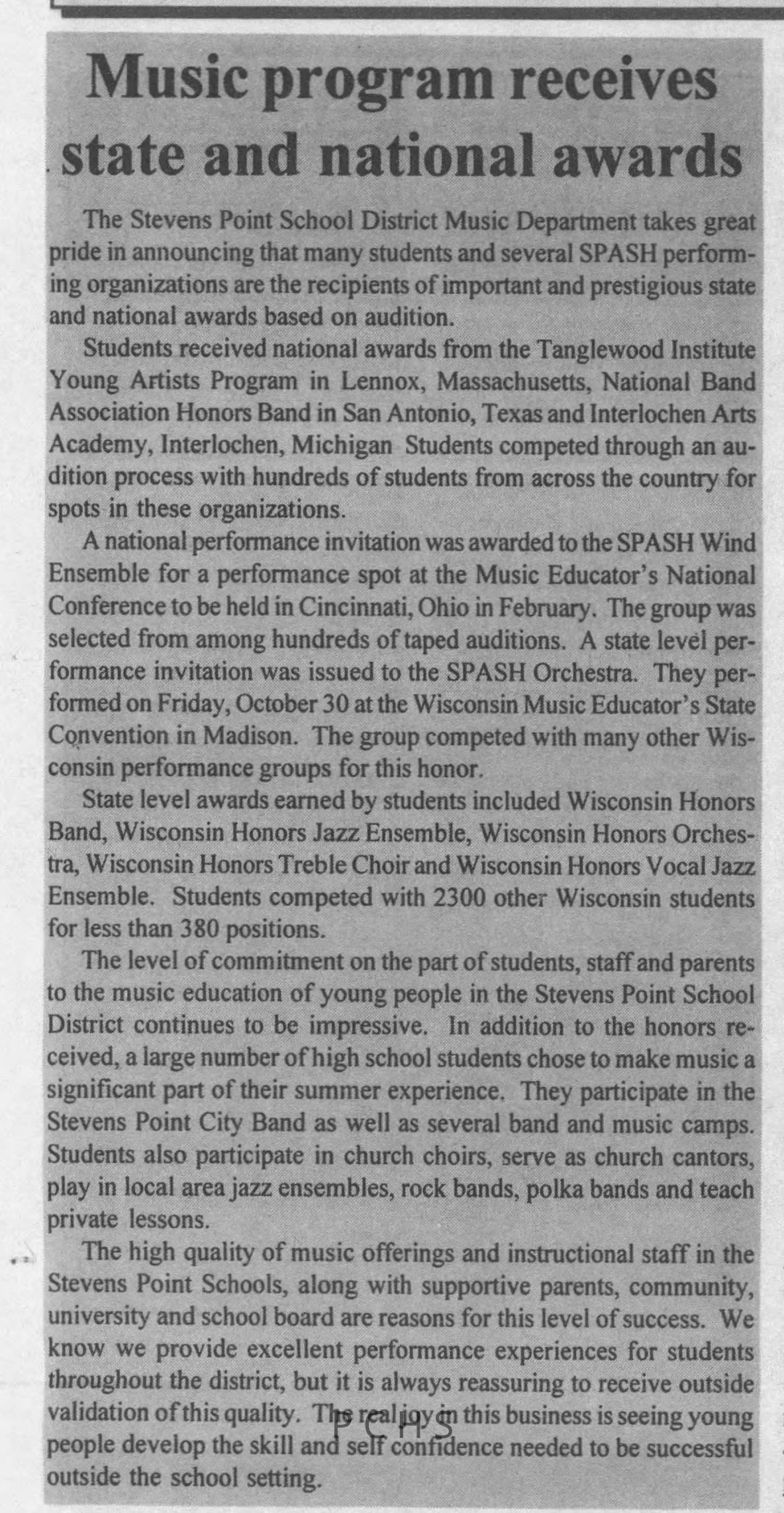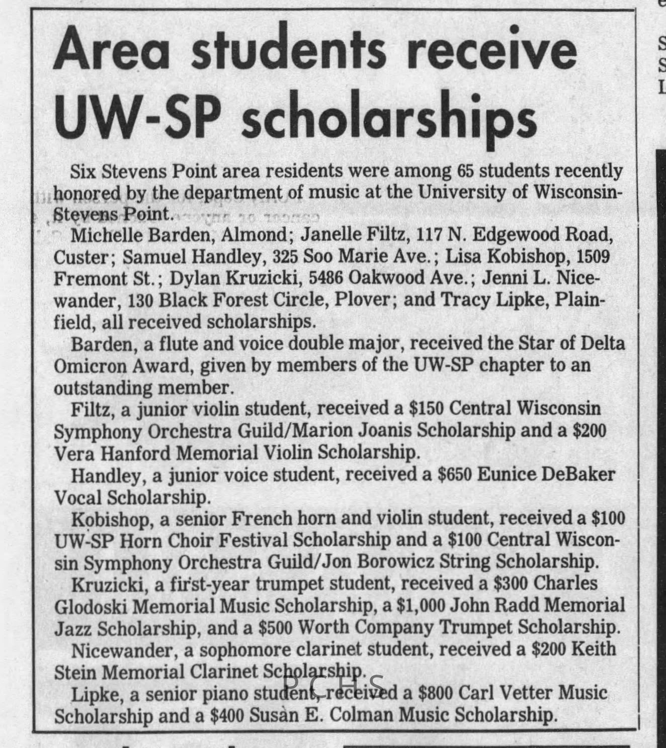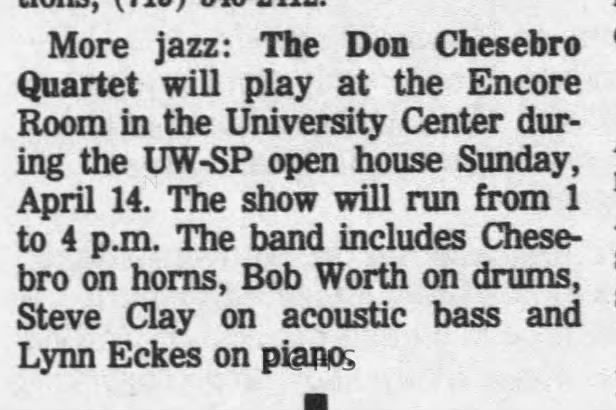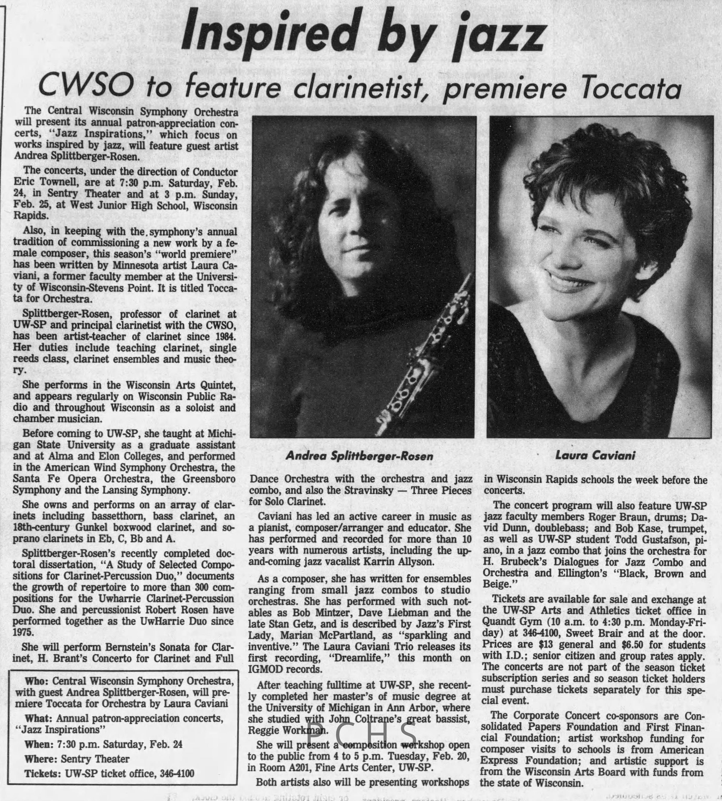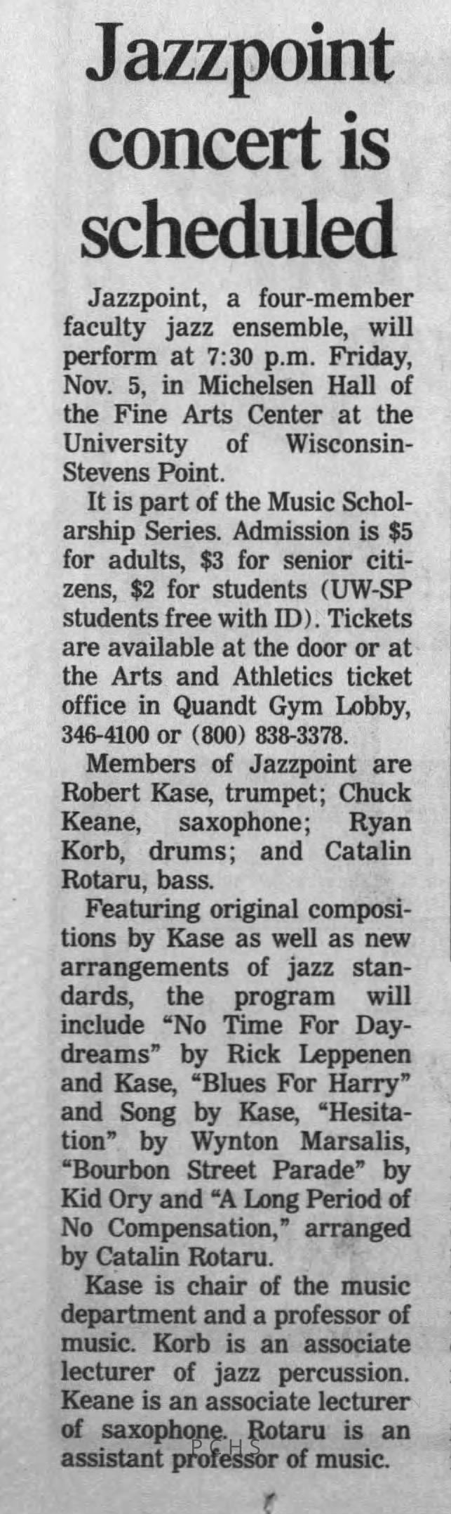 Newspaper clippings from Portage County newspapers. These clippings show jazz musicians, bands, events, school organizations, and traveling shows from 1996-2000. Some highlighted topics are Shawn Sommer, SPASH jazz ensemble, Don Chesebro, Thomas George, Rosholt, UWSP Mardi Gras Ball, CWSO, Poco a Poco, Don Greene, Ben Franklin Junior High, Riverfront Rendezvous, Dick Johnson, Almond-Bancroft, Todd Gustafson, Mike Metheny, John Greiner, John Altenburgh, Janet Planet, WWSP, jazzfest, Kip Gutke, Matt Dow, Bethany Ackeret, Counterpointers, PJ Jacobs, Big Band Express, Erin McLennon, Lindsey Quick, jazz lab band, Breanne Hetzel, Brian Reince, Matthew Antoniewicz, CWSO, Gold Company, David Hastings, Amanda Sommers, Laura Sommer, Jazz Point, Laura Caviani, Karrin Allyson, Soiree Musicale, Pacelli high school, Krazy Days, May Erickson, Wisconsin Christmas Jazz and Blues Show, Abbie Betinis, Greg Wright, Dave Kiepert, Jeff Erickson, Down Beat Ensemble, Pops Concert, Richard Johnson, Swing into Action, River Cities Jazz, Bob Kase Quartet, Don Chesebro Swing Quartet, Dennis Provisor.Created By