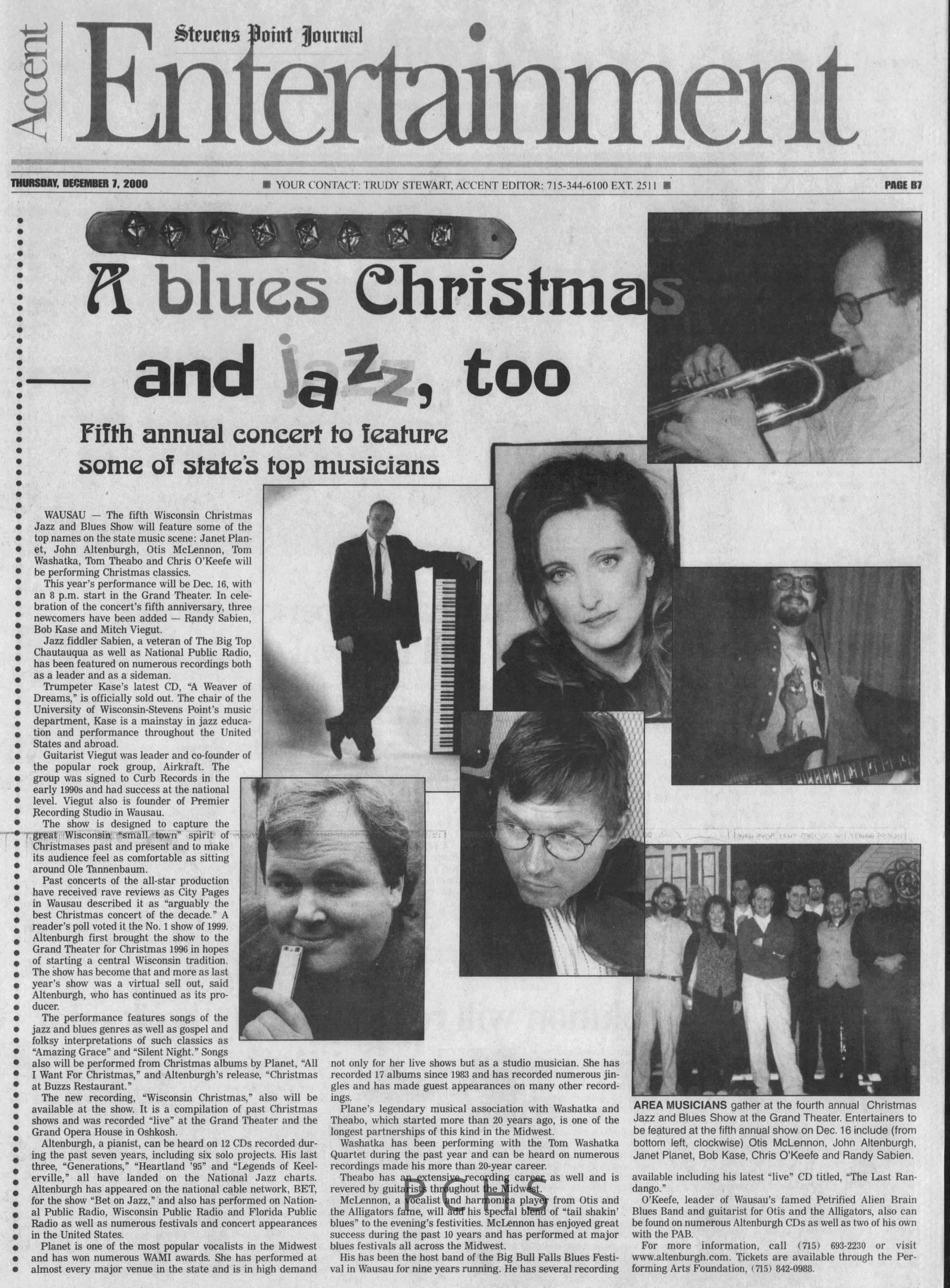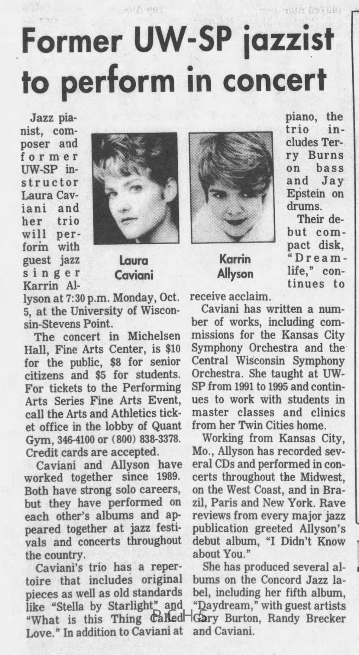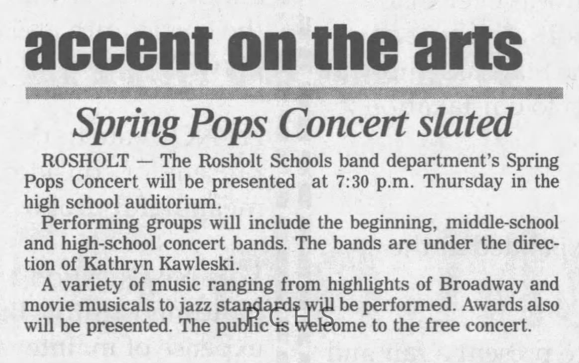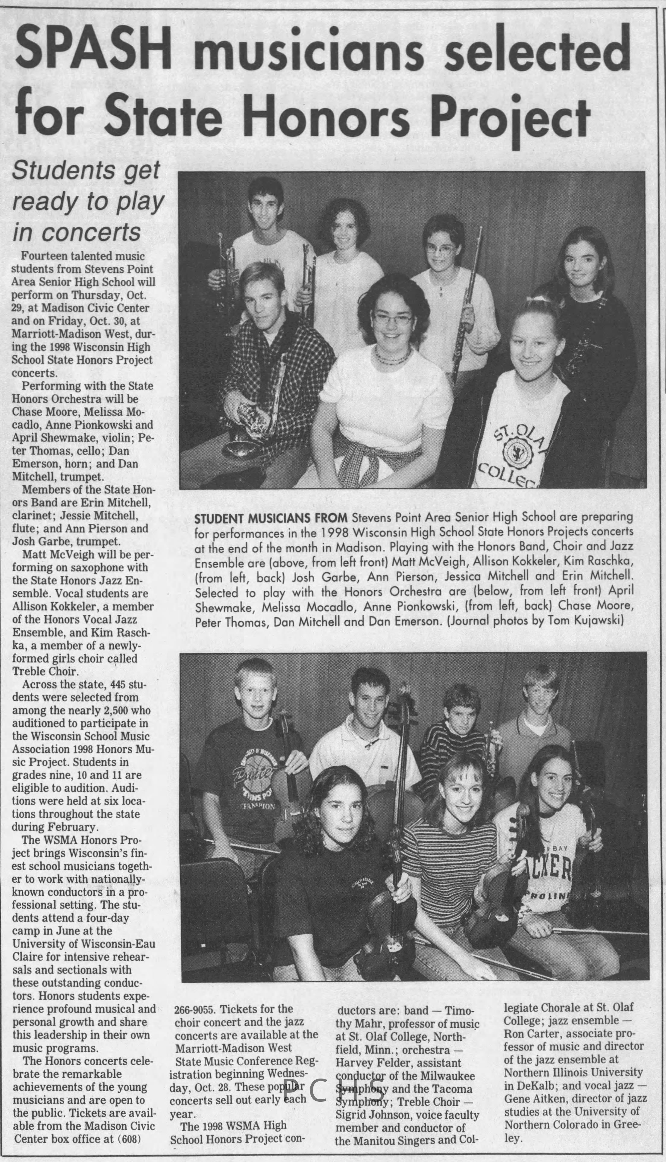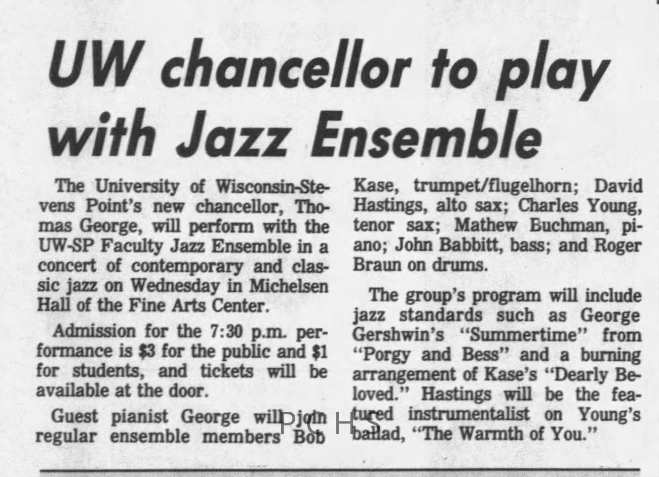 Newspaper clippings from Portage County newspapers. These clippings show jazz musicians, bands, events, school organizations, and traveling shows from 1996-2000. Some highlighted topics are Shawn Sommer, SPASH jazz ensemble, Don Chesebro, Thomas George, Rosholt, UWSP Mardi Gras Ball, CWSO, Poco a Poco, Don Greene, Ben Franklin Junior High, Riverfront Rendezvous, Dick Johnson, Almond-Bancroft, Todd Gustafson, Mike Metheny, John Greiner, John Altenburgh, Janet Planet, WWSP, jazzfest, Kip Gutke, Matt Dow, Bethany Ackeret, Counterpointers, PJ Jacobs, Big Band Express, Erin McLennon, Lindsey Quick, jazz lab band, Breanne Hetzel, Brian Reince, Matthew Antoniewicz, CWSO, Gold Company, David Hastings, Amanda Sommers, Laura Sommer, Jazz Point, Laura Caviani, Karrin Allyson, Soiree Musicale, Pacelli high school, Krazy Days, May Erickson, Wisconsin Christmas Jazz and Blues Show, Abbie Betinis, Greg Wright, Dave Kiepert, Jeff Erickson, Down Beat Ensemble, Pops Concert, Richard Johnson, Swing into Action, River Cities Jazz, Bob Kase Quartet, Don Chesebro Swing Quartet, Dennis Provisor.Created By