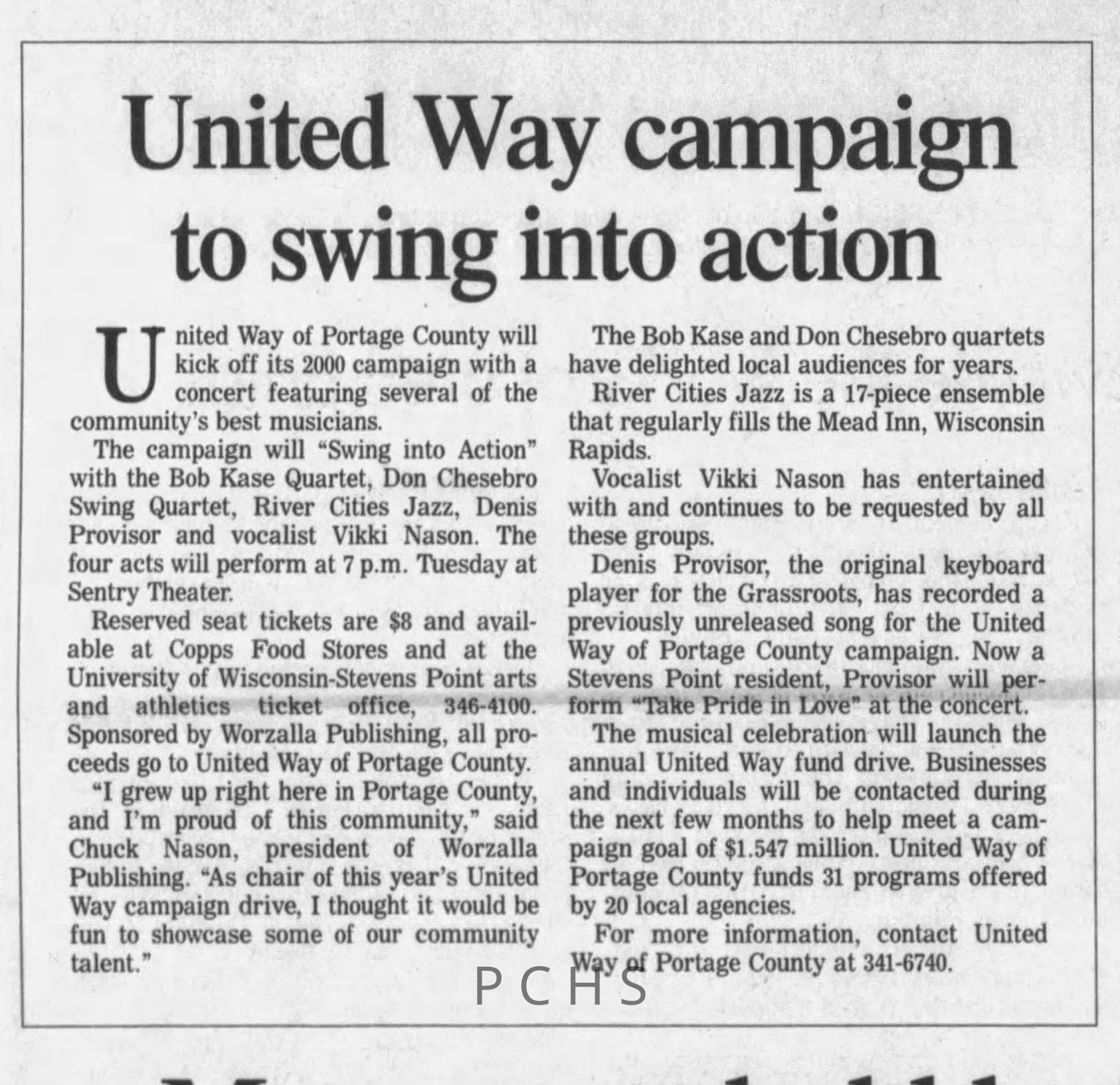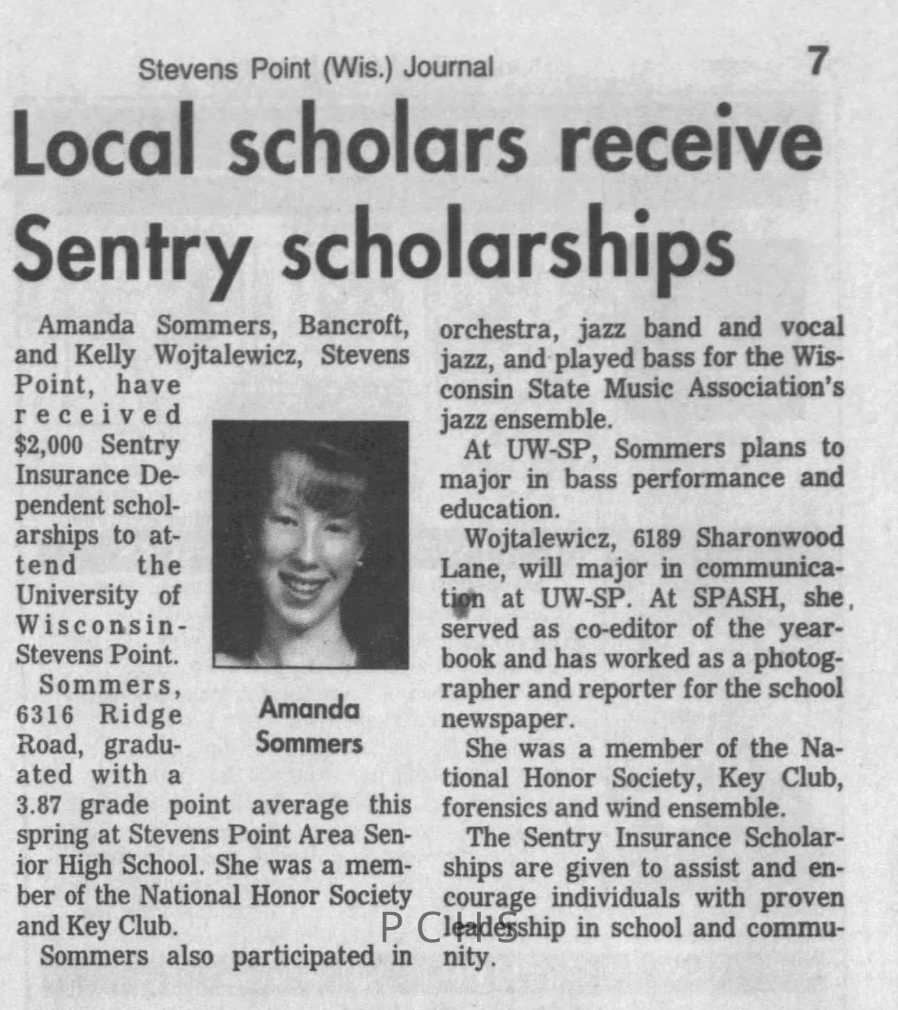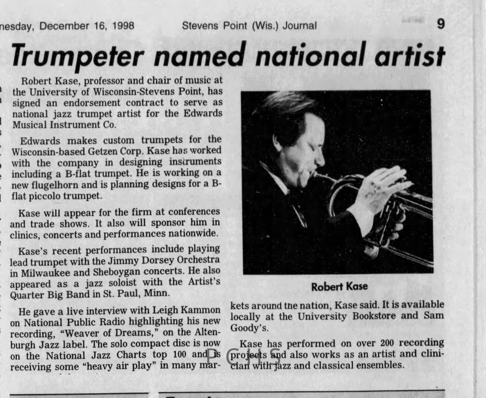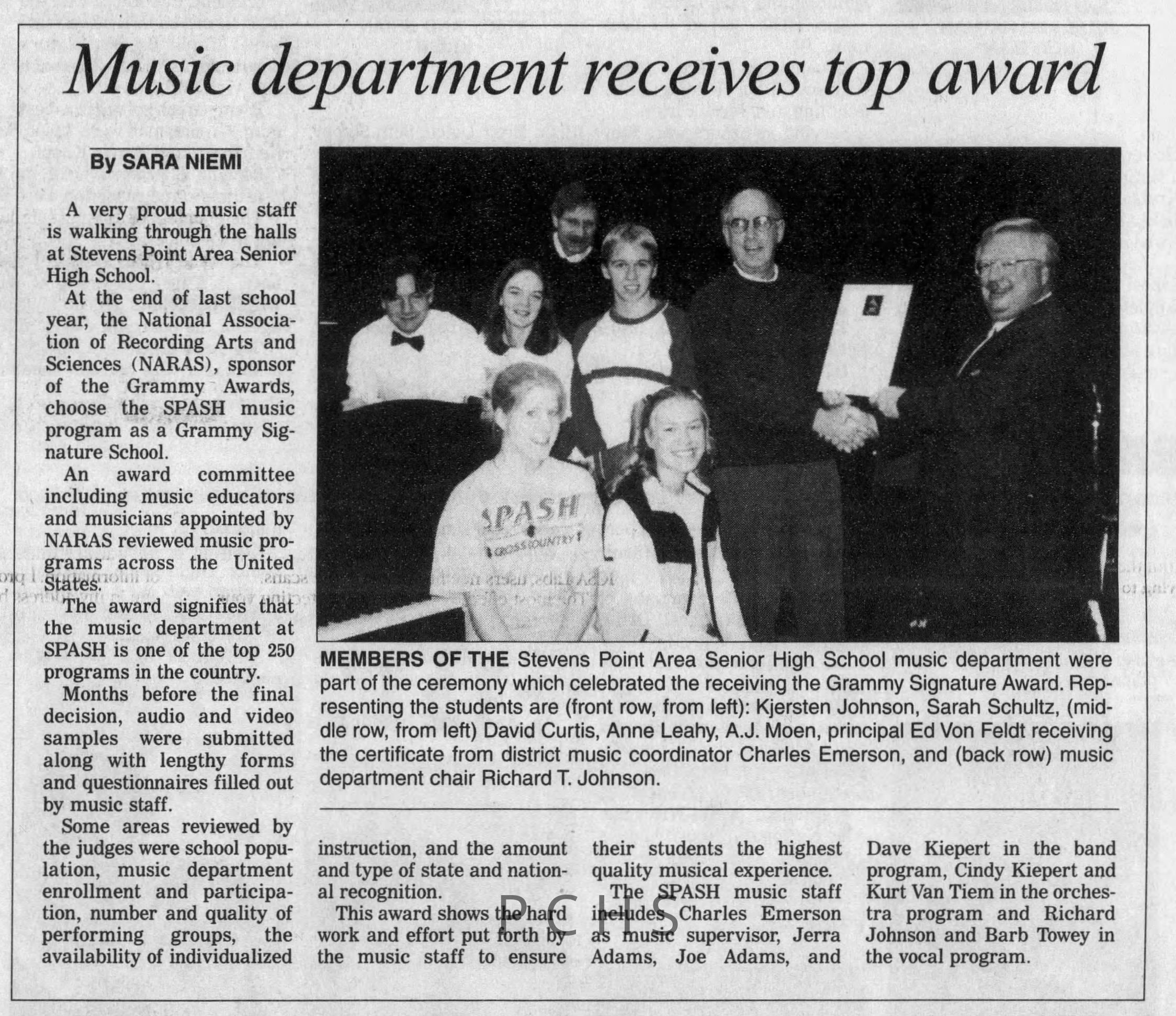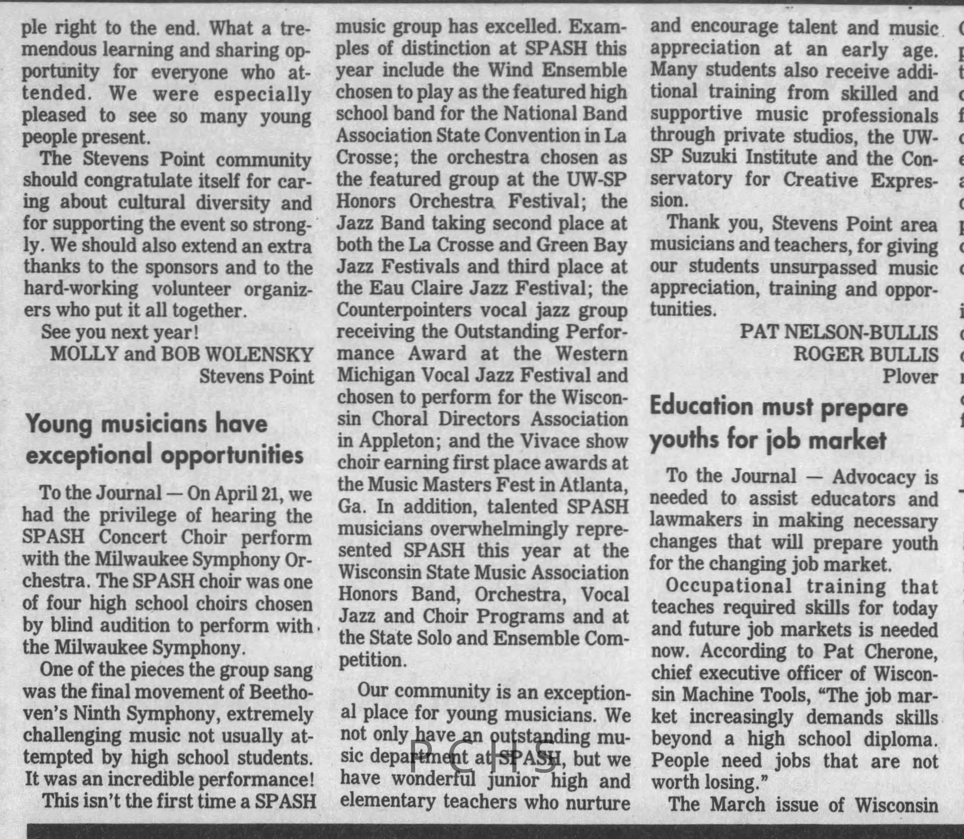 Newspaper clippings from Portage County newspapers. These clippings show jazz musicians, bands, events, school organizations, and traveling shows from 1996-2000. Some highlighted topics are Shawn Sommer, SPASH jazz ensemble, Don Chesebro, Thomas George, Rosholt, UWSP Mardi Gras Ball, CWSO, Poco a Poco, Don Greene, Ben Franklin Junior High, Riverfront Rendezvous, Dick Johnson, Almond-Bancroft, Todd Gustafson, Mike Metheny, John Greiner, John Altenburgh, Janet Planet, WWSP, jazzfest, Kip Gutke, Matt Dow, Bethany Ackeret, Counterpointers, PJ Jacobs, Big Band Express, Erin McLennon, Lindsey Quick, jazz lab band, Breanne Hetzel, Brian Reince, Matthew Antoniewicz, CWSO, Gold Company, David Hastings, Amanda Sommers, Laura Sommer, Jazz Point, Laura Caviani, Karrin Allyson, Soiree Musicale, Pacelli high school, Krazy Days, May Erickson, Wisconsin Christmas Jazz and Blues Show, Abbie Betinis, Greg Wright, Dave Kiepert, Jeff Erickson, Down Beat Ensemble, Pops Concert, Richard Johnson, Swing into Action, River Cities Jazz, Bob Kase Quartet, Don Chesebro Swing Quartet, Dennis Provisor.Created By