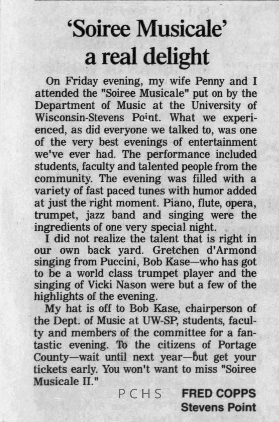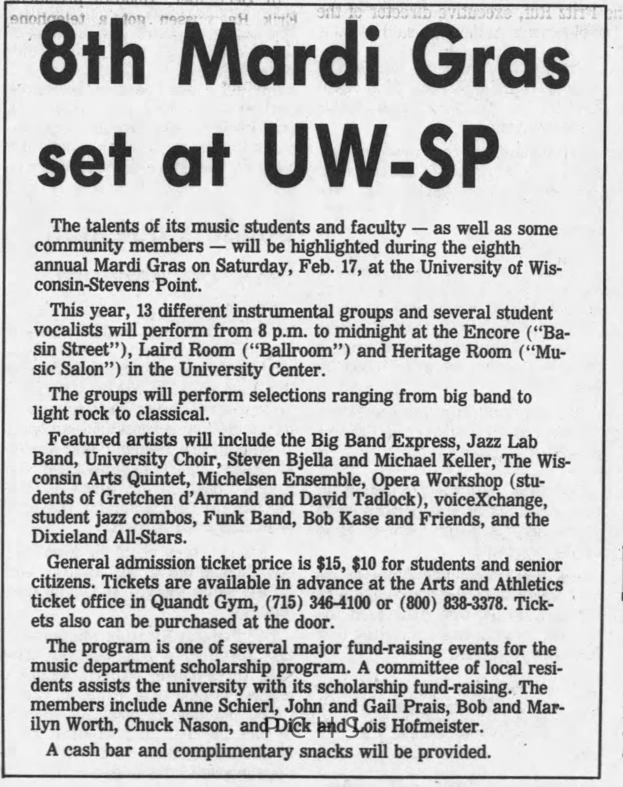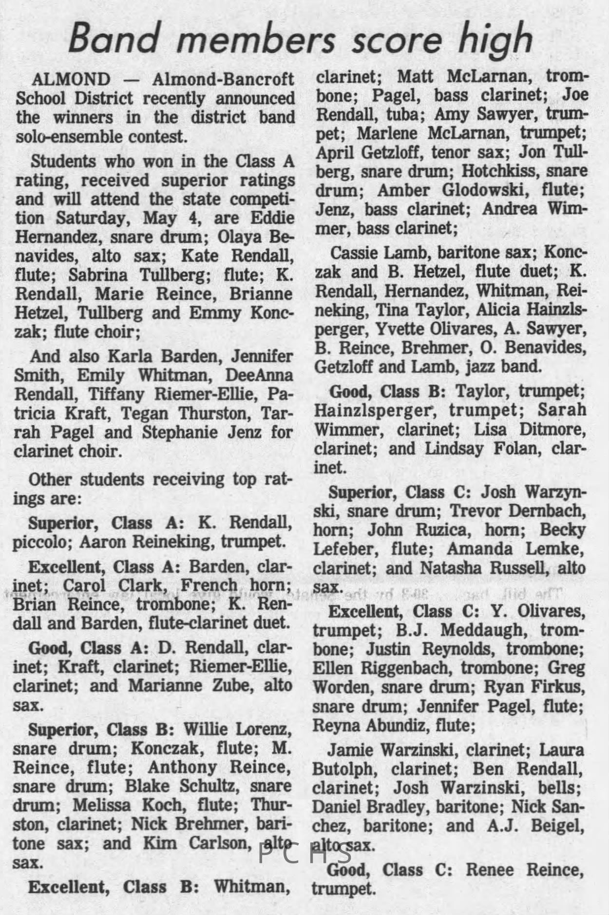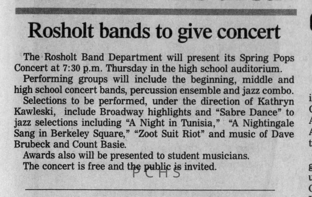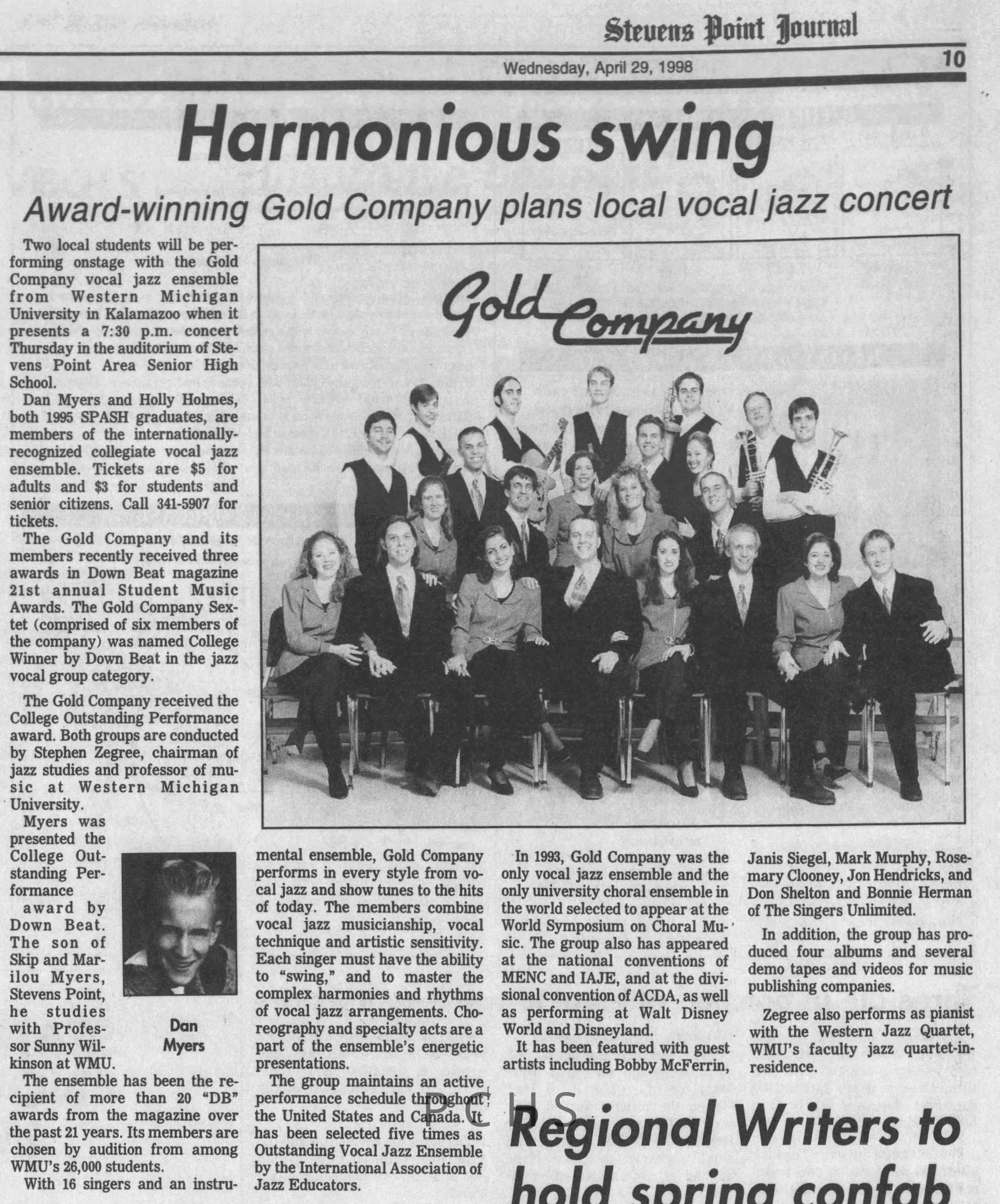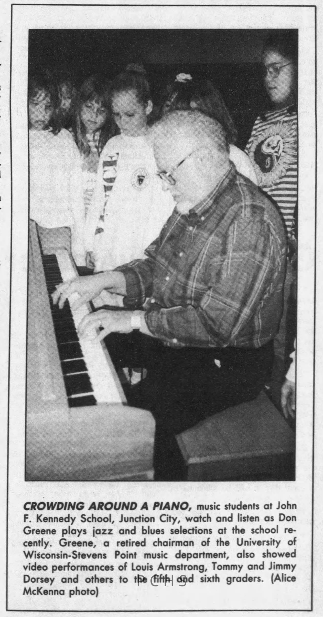 Newspaper clippings from Portage County newspapers. These clippings show jazz musicians, bands, events, school organizations, and traveling shows from 1996-2000. Some highlighted topics are Shawn Sommer, SPASH jazz ensemble, Don Chesebro, Thomas George, Rosholt, UWSP Mardi Gras Ball, CWSO, Poco a Poco, Don Greene, Ben Franklin Junior High, Riverfront Rendezvous, Dick Johnson, Almond-Bancroft, Todd Gustafson, Mike Metheny, John Greiner, John Altenburgh, Janet Planet, WWSP, jazzfest, Kip Gutke, Matt Dow, Bethany Ackeret, Counterpointers, PJ Jacobs, Big Band Express, Erin McLennon, Lindsey Quick, jazz lab band, Breanne Hetzel, Brian Reince, Matthew Antoniewicz, CWSO, Gold Company, David Hastings, Amanda Sommers, Laura Sommer, Jazz Point, Laura Caviani, Karrin Allyson, Soiree Musicale, Pacelli high school, Krazy Days, May Erickson, Wisconsin Christmas Jazz and Blues Show, Abbie Betinis, Greg Wright, Dave Kiepert, Jeff Erickson, Down Beat Ensemble, Pops Concert, Richard Johnson, Swing into Action, River Cities Jazz, Bob Kase Quartet, Don Chesebro Swing Quartet, Dennis Provisor.Created By