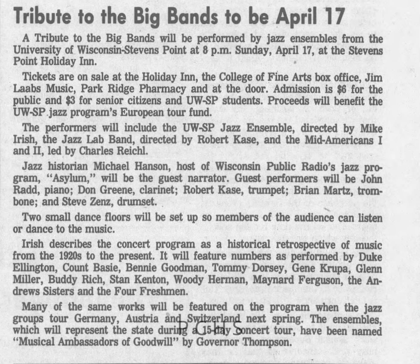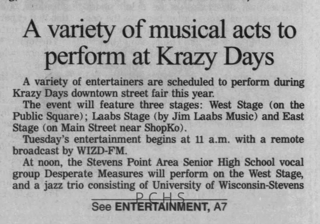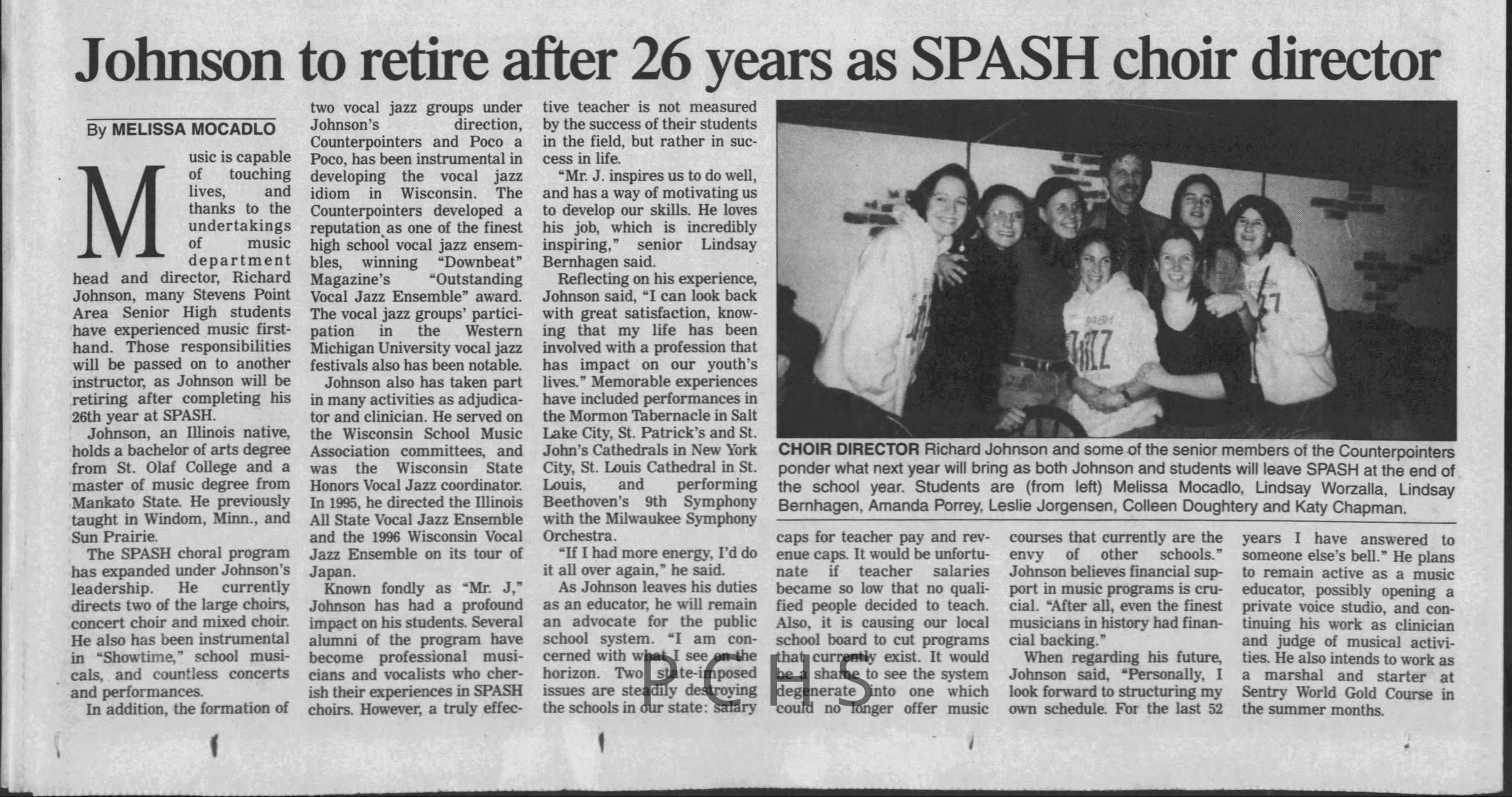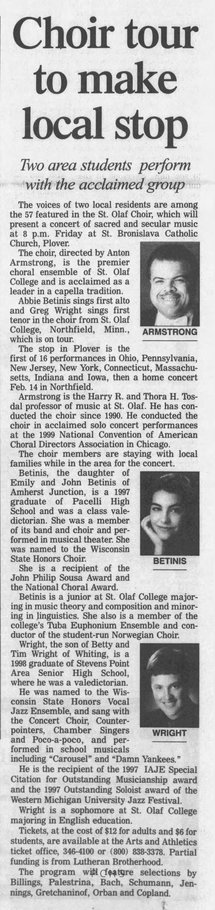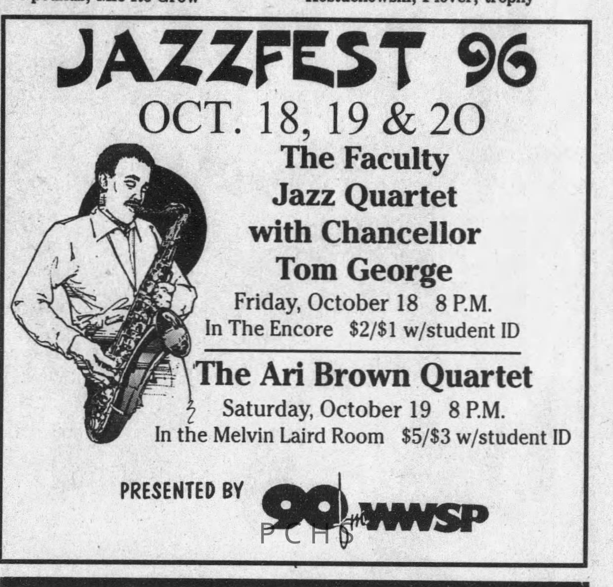 Newspaper clippings from Portage County newspapers. These clippings show jazz musicians, bands, events, school organizations, and traveling shows from 1996-2000. Some highlighted topics are Shawn Sommer, SPASH jazz ensemble, Don Chesebro, Thomas George, Rosholt, UWSP Mardi Gras Ball, CWSO, Poco a Poco, Don Greene, Ben Franklin Junior High, Riverfront Rendezvous, Dick Johnson, Almond-Bancroft, Todd Gustafson, Mike Metheny, John Greiner, John Altenburgh, Janet Planet, WWSP, jazzfest, Kip Gutke, Matt Dow, Bethany Ackeret, Counterpointers, PJ Jacobs, Big Band Express, Erin McLennon, Lindsey Quick, jazz lab band, Breanne Hetzel, Brian Reince, Matthew Antoniewicz, CWSO, Gold Company, David Hastings, Amanda Sommers, Laura Sommer, Jazz Point, Laura Caviani, Karrin Allyson, Soiree Musicale, Pacelli high school, Krazy Days, May Erickson, Wisconsin Christmas Jazz and Blues Show, Abbie Betinis, Greg Wright, Dave Kiepert, Jeff Erickson, Down Beat Ensemble, Pops Concert, Richard Johnson, Swing into Action, River Cities Jazz, Bob Kase Quartet, Don Chesebro Swing Quartet, Dennis Provisor.Created By
