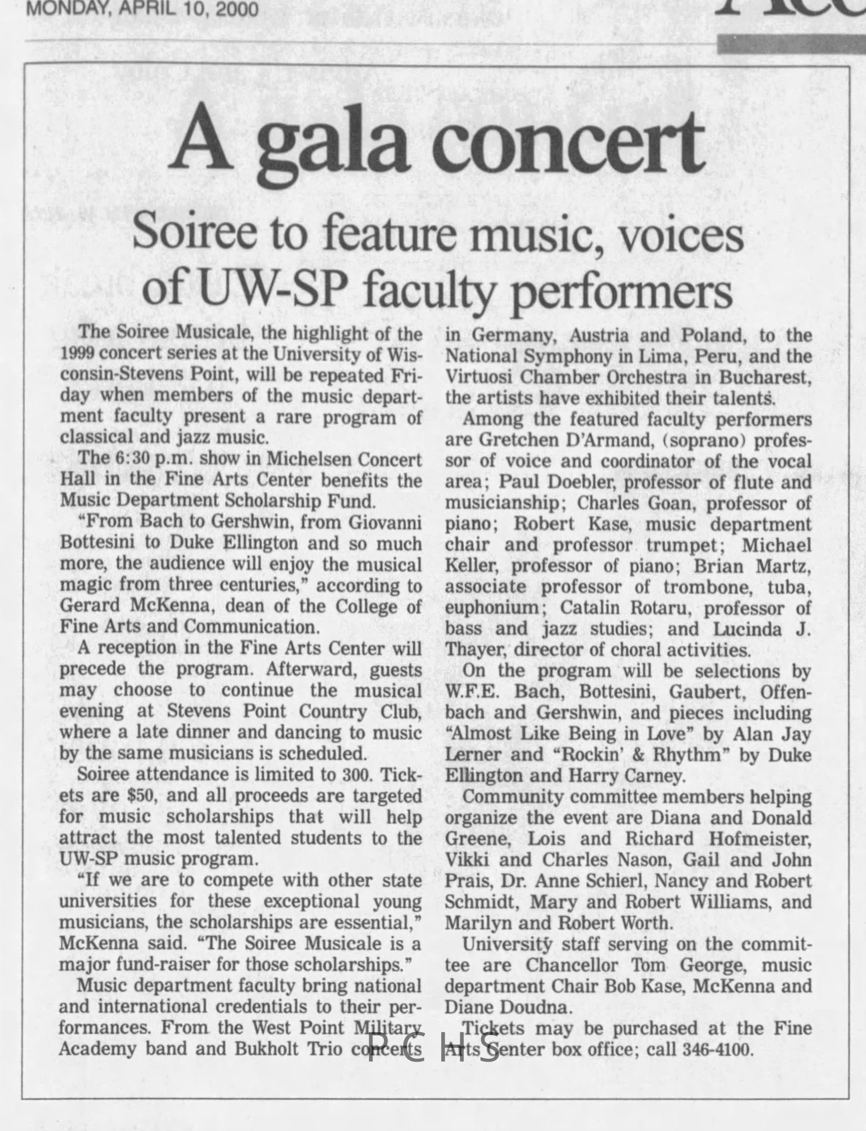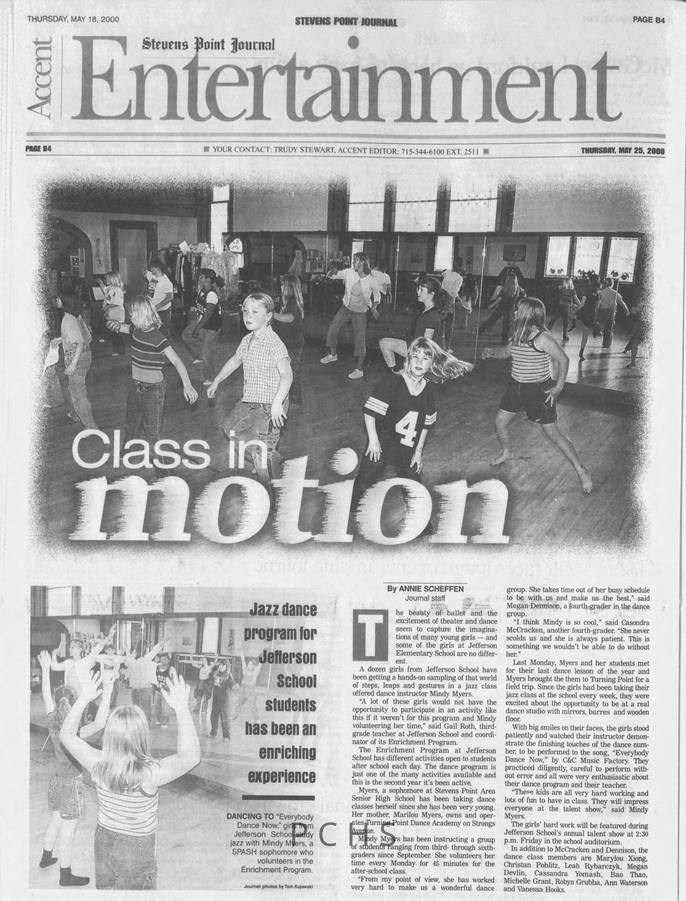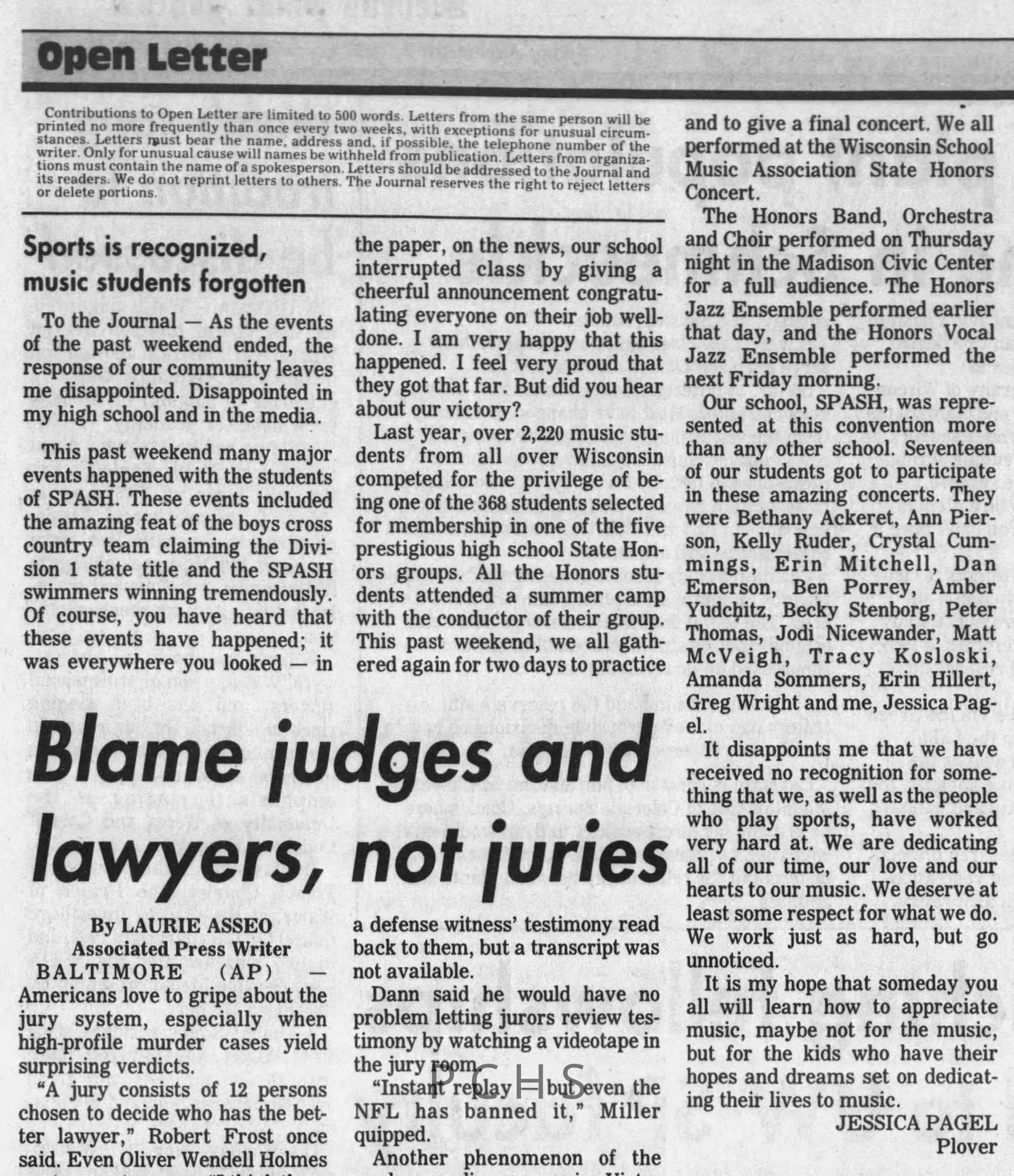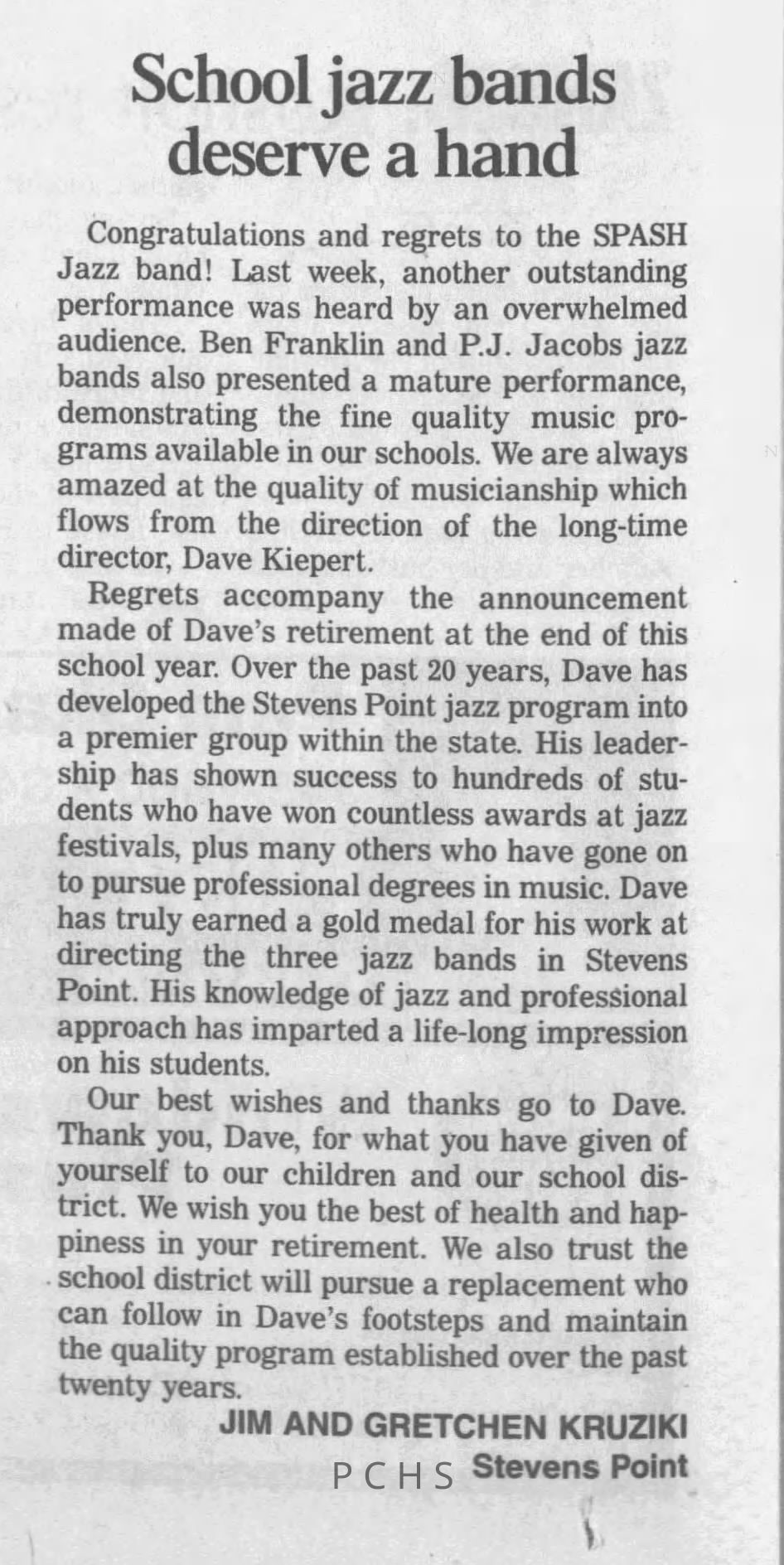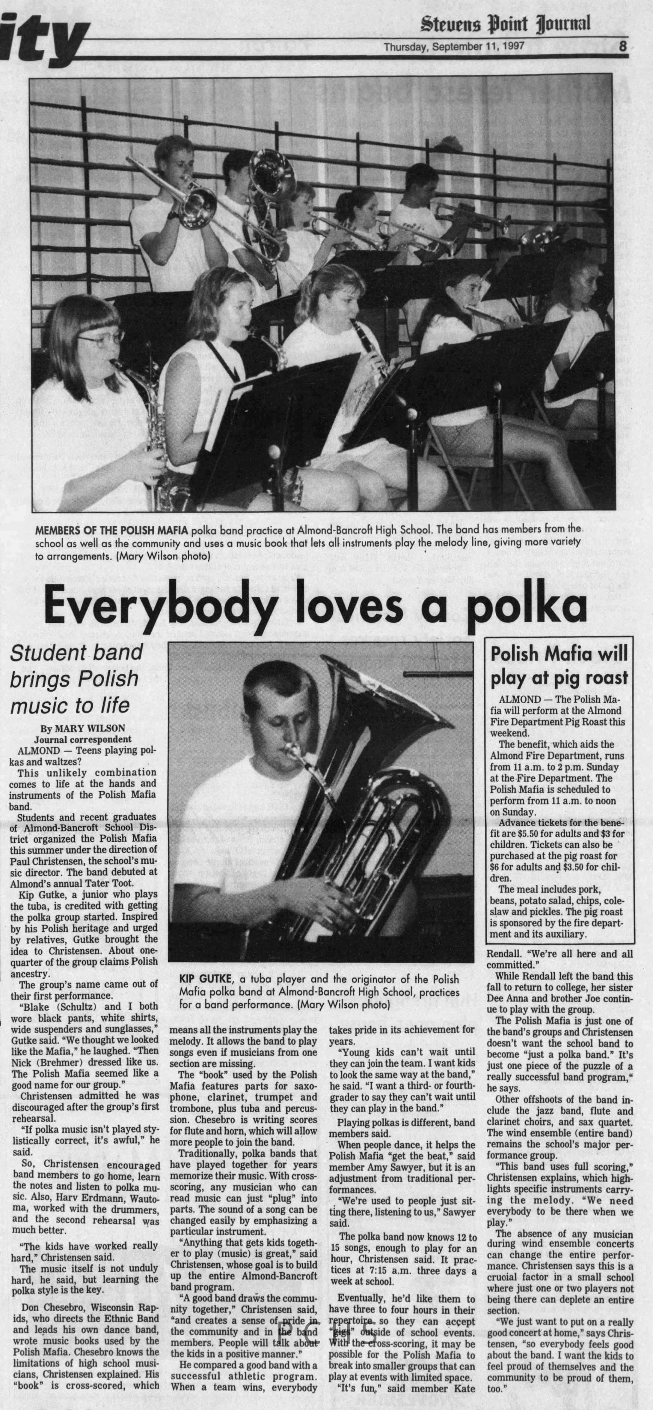 Newspaper clippings from Portage County newspapers. These clippings show jazz musicians, bands, events, school organizations, and traveling shows from 1996-2000. Some highlighted topics are Shawn Sommer, SPASH jazz ensemble, Don Chesebro, Thomas George, Rosholt, UWSP Mardi Gras Ball, CWSO, Poco a Poco, Don Greene, Ben Franklin Junior High, Riverfront Rendezvous, Dick Johnson, Almond-Bancroft, Todd Gustafson, Mike Metheny, John Greiner, John Altenburgh, Janet Planet, WWSP, jazzfest, Kip Gutke, Matt Dow, Bethany Ackeret, Counterpointers, PJ Jacobs, Big Band Express, Erin McLennon, Lindsey Quick, jazz lab band, Breanne Hetzel, Brian Reince, Matthew Antoniewicz, CWSO, Gold Company, David Hastings, Amanda Sommers, Laura Sommer, Jazz Point, Laura Caviani, Karrin Allyson, Soiree Musicale, Pacelli high school, Krazy Days, May Erickson, Wisconsin Christmas Jazz and Blues Show, Abbie Betinis, Greg Wright, Dave Kiepert, Jeff Erickson, Down Beat Ensemble, Pops Concert, Richard Johnson, Swing into Action, River Cities Jazz, Bob Kase Quartet, Don Chesebro Swing Quartet, Dennis Provisor.Created By