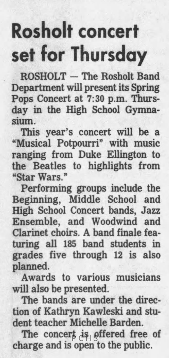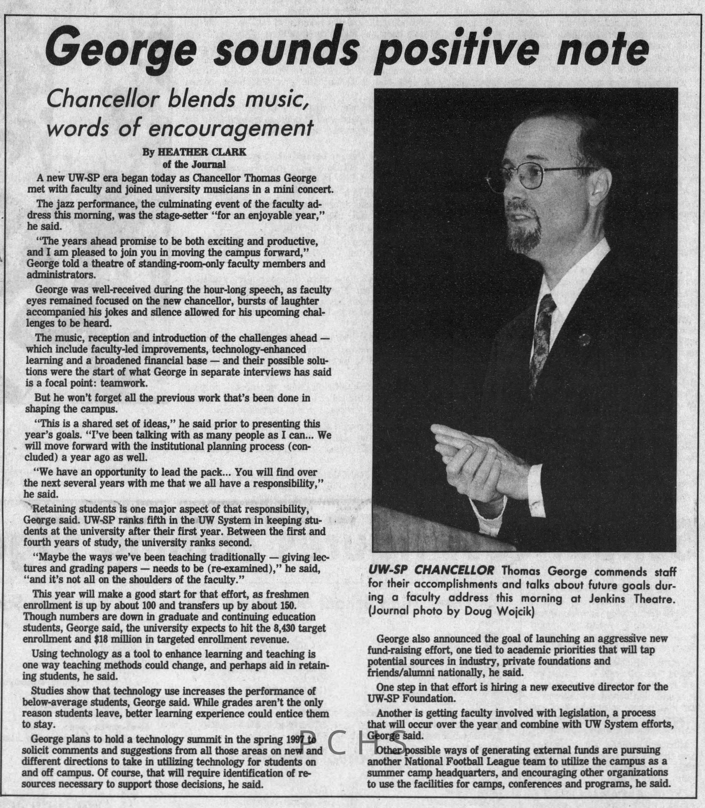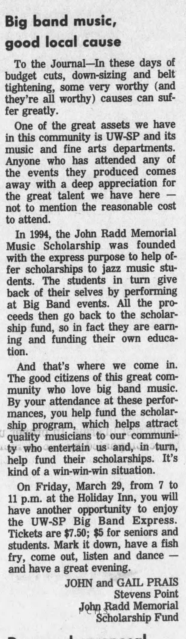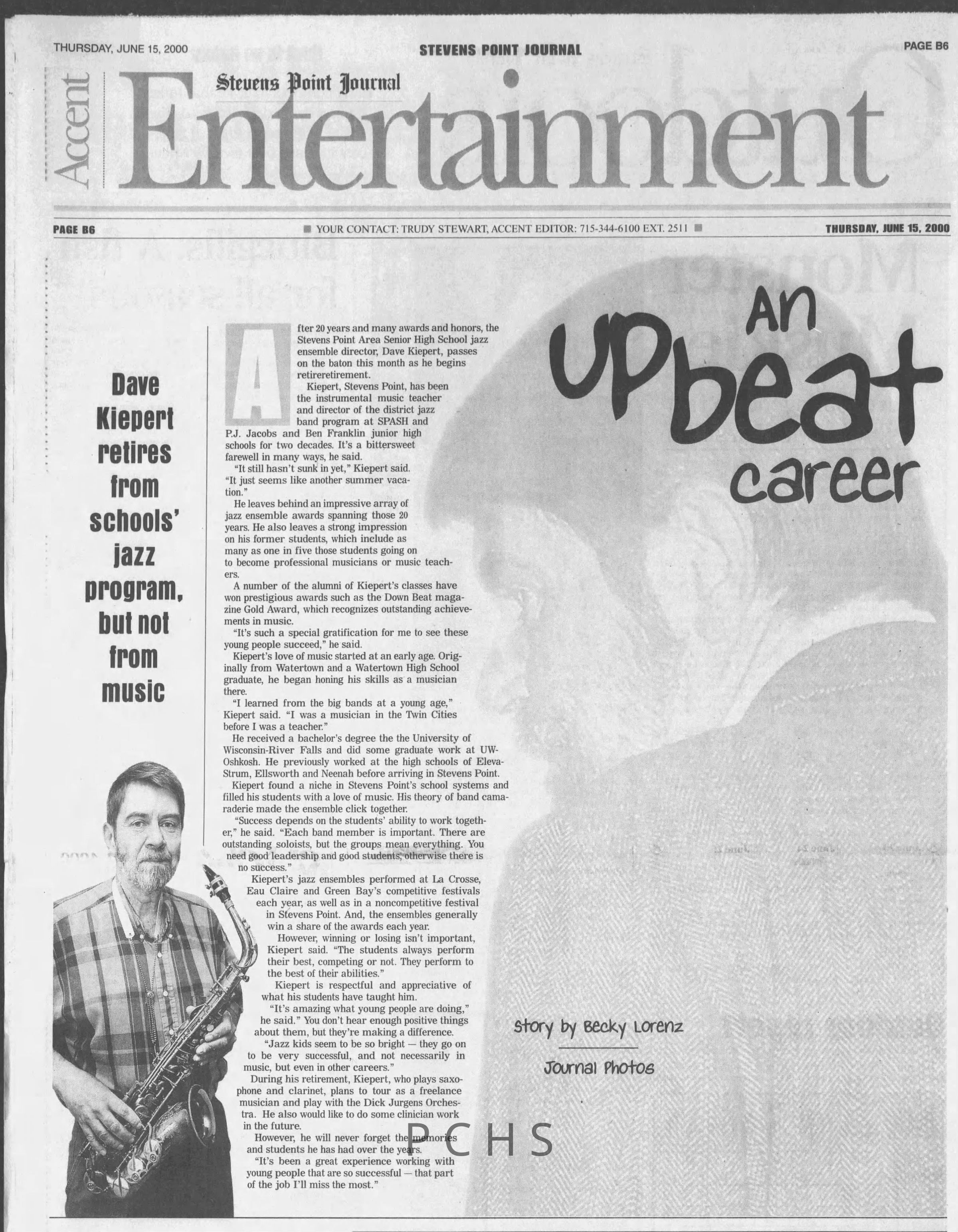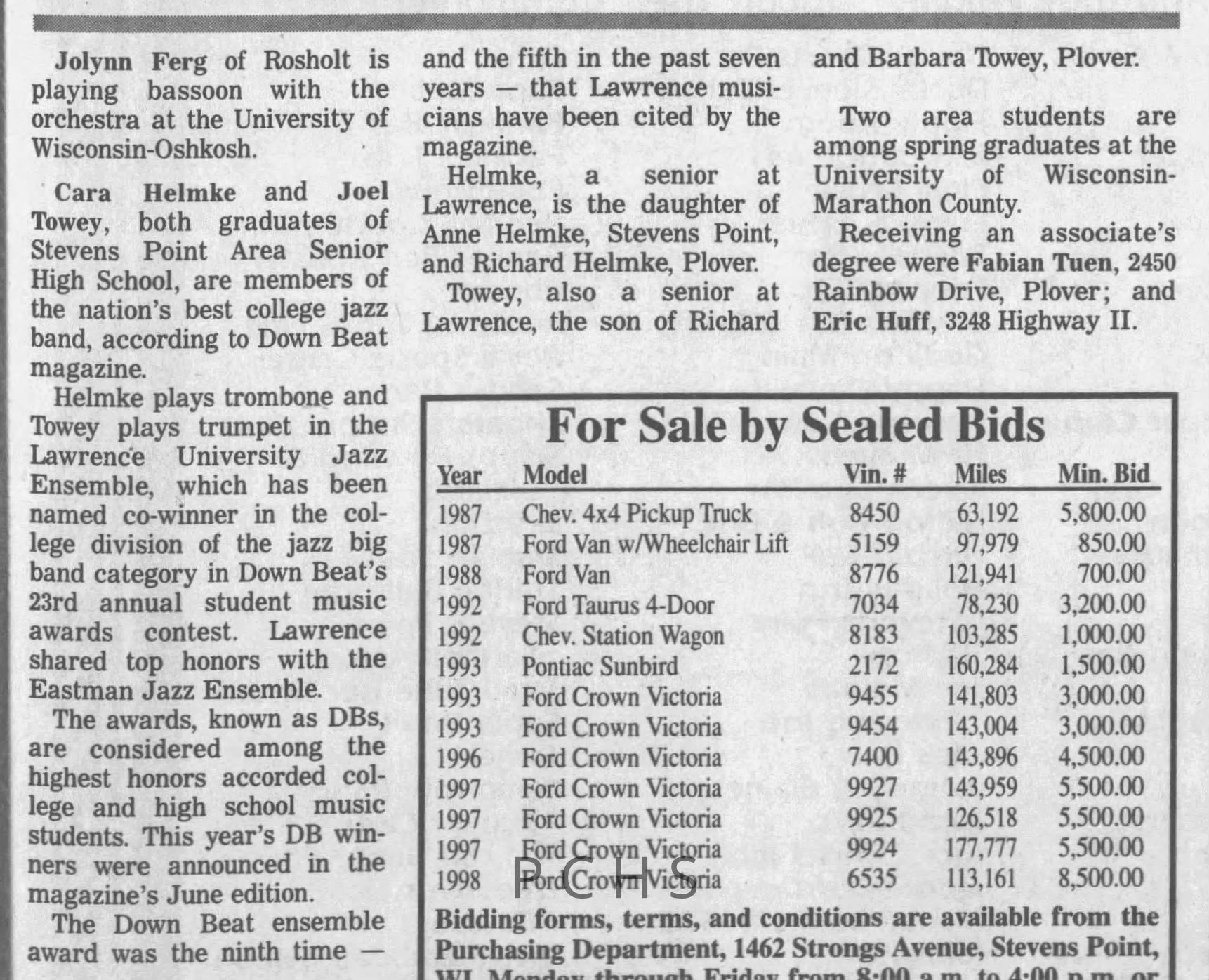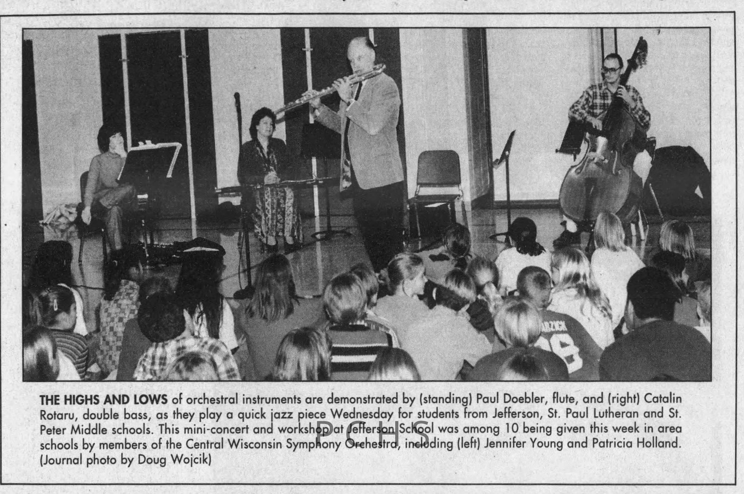 Newspaper clippings from Portage County newspapers. These clippings show jazz musicians, bands, events, school organizations, and traveling shows from 1996-2000. Some highlighted topics are Shawn Sommer, SPASH jazz ensemble, Don Chesebro, Thomas George, Rosholt, UWSP Mardi Gras Ball, CWSO, Poco a Poco, Don Greene, Ben Franklin Junior High, Riverfront Rendezvous, Dick Johnson, Almond-Bancroft, Todd Gustafson, Mike Metheny, John Greiner, John Altenburgh, Janet Planet, WWSP, jazzfest, Kip Gutke, Matt Dow, Bethany Ackeret, Counterpointers, PJ Jacobs, Big Band Express, Erin McLennon, Lindsey Quick, jazz lab band, Breanne Hetzel, Brian Reince, Matthew Antoniewicz, CWSO, Gold Company, David Hastings, Amanda Sommers, Laura Sommer, Jazz Point, Laura Caviani, Karrin Allyson, Soiree Musicale, Pacelli high school, Krazy Days, May Erickson, Wisconsin Christmas Jazz and Blues Show, Abbie Betinis, Greg Wright, Dave Kiepert, Jeff Erickson, Down Beat Ensemble, Pops Concert, Richard Johnson, Swing into Action, River Cities Jazz, Bob Kase Quartet, Don Chesebro Swing Quartet, Dennis Provisor.Created By