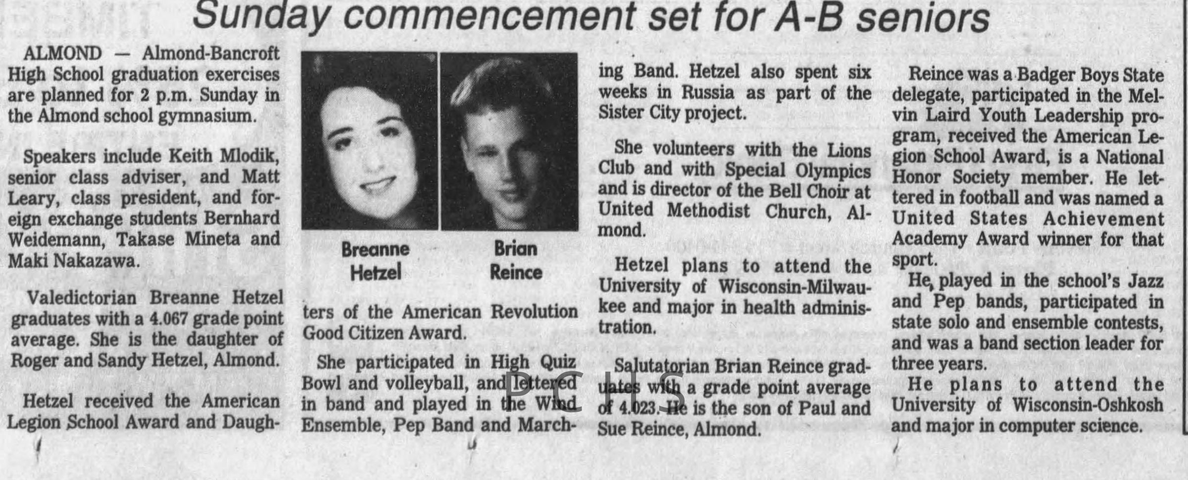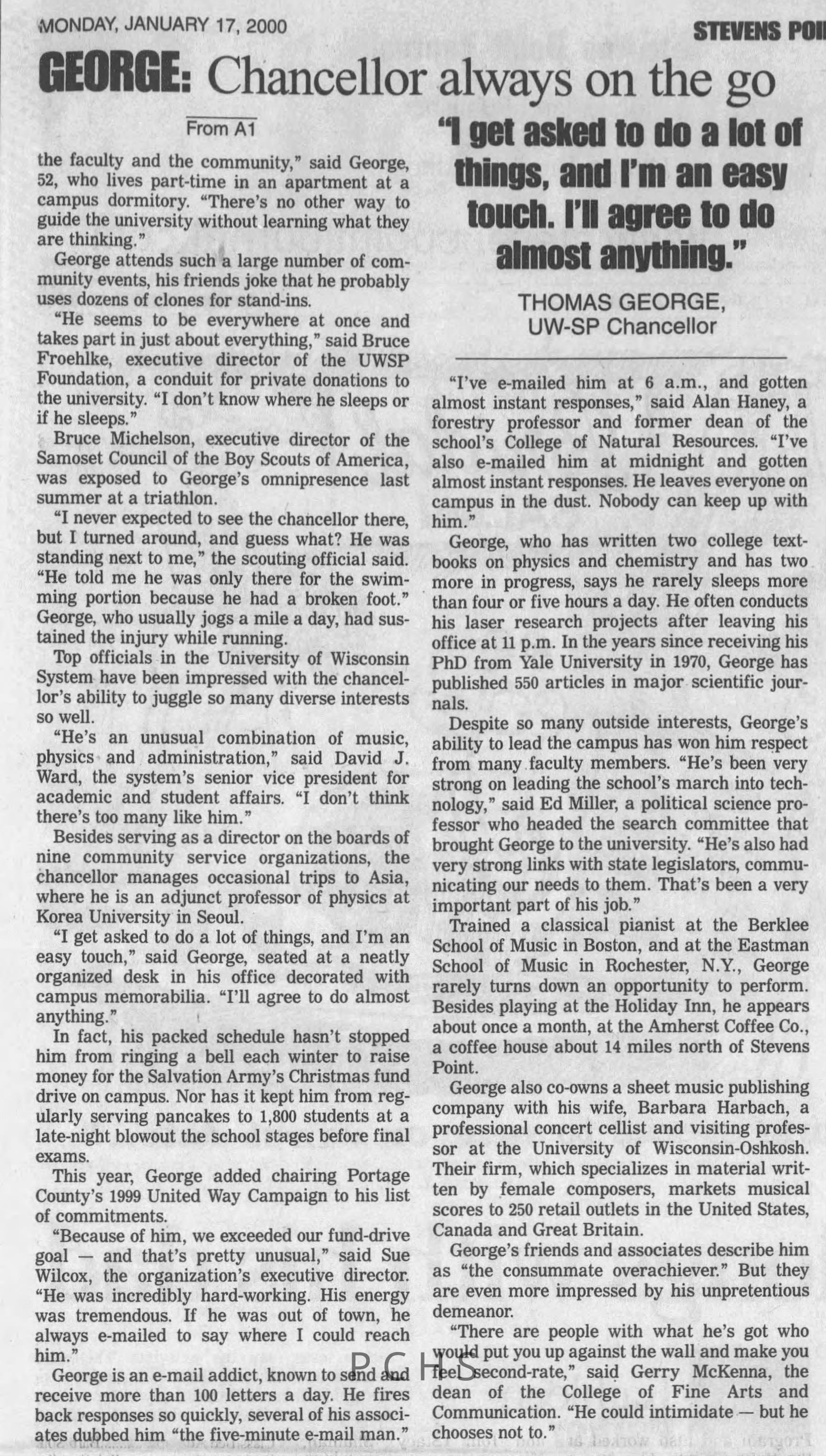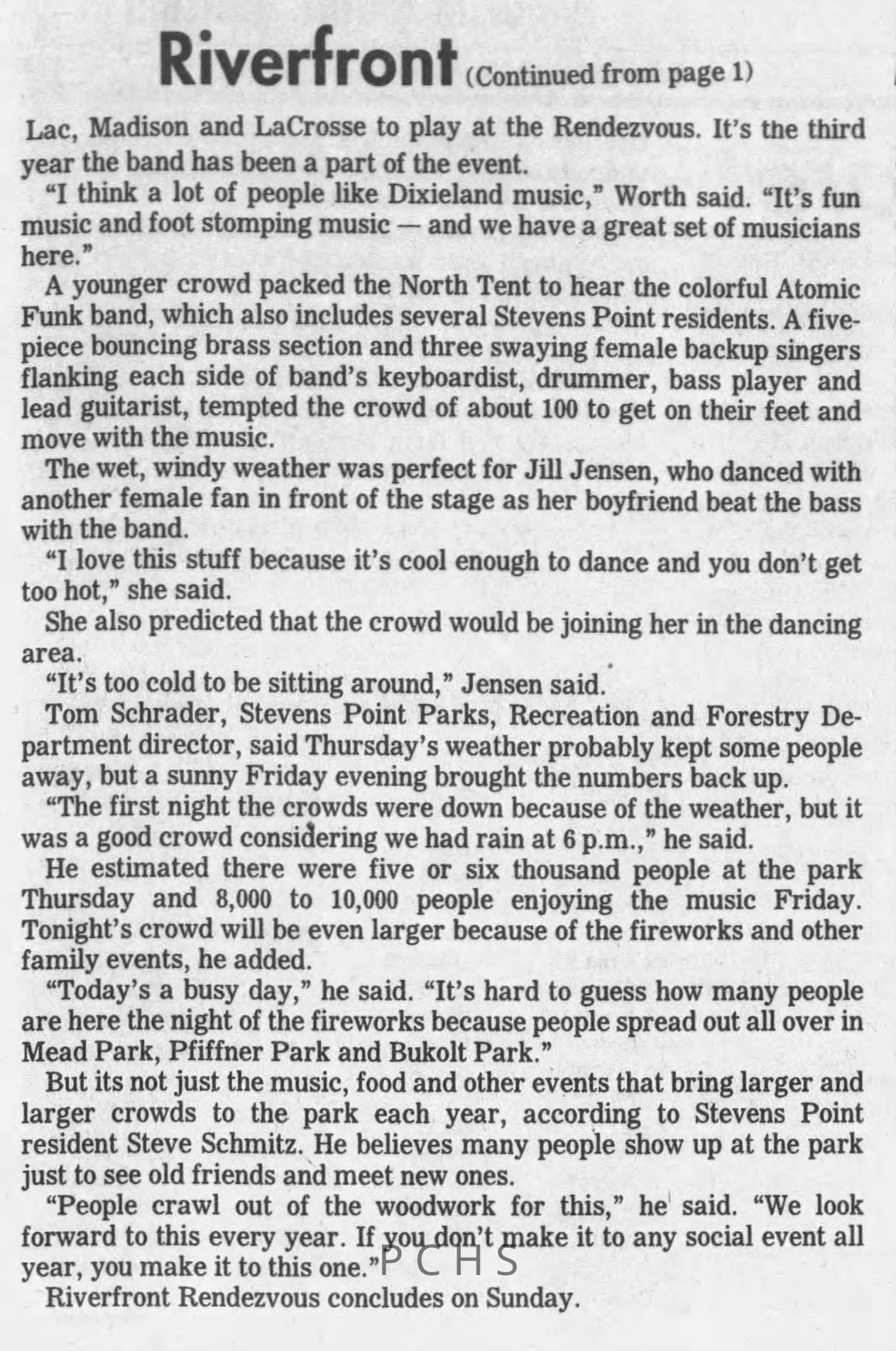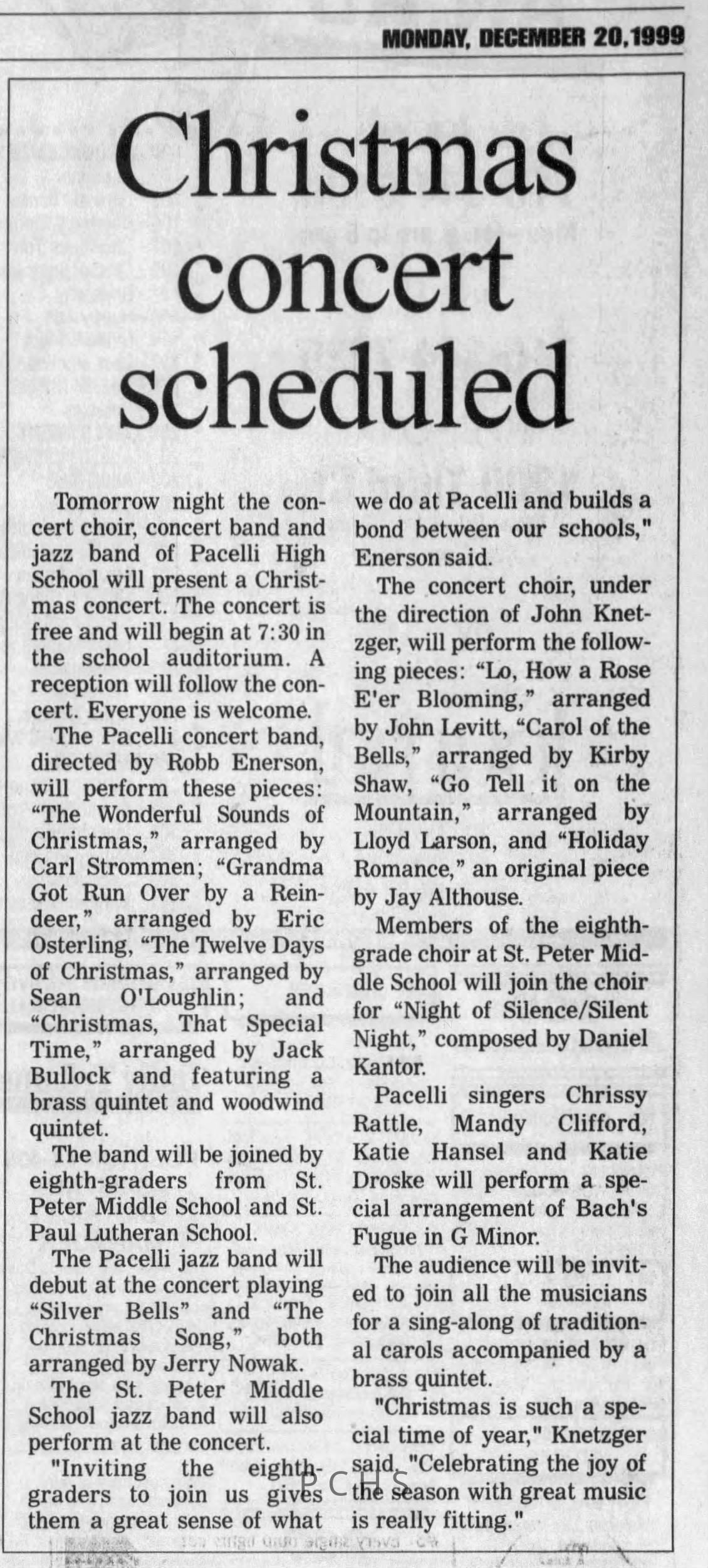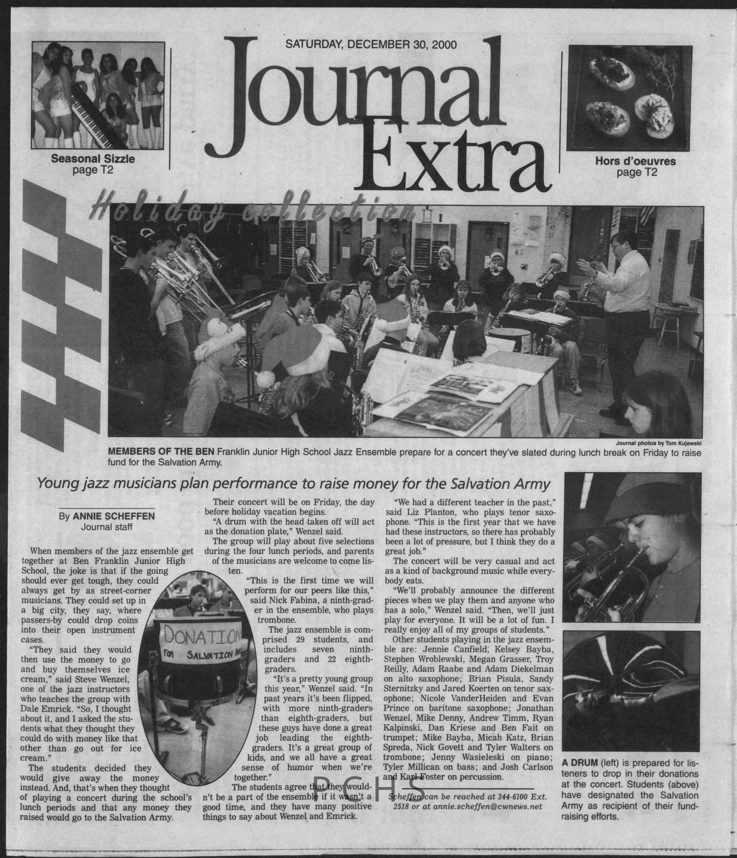 Newspaper clippings from Portage County newspapers. These clippings show jazz musicians, bands, events, school organizations, and traveling shows from 1996-2000. Some highlighted topics are Shawn Sommer, SPASH jazz ensemble, Don Chesebro, Thomas George, Rosholt, UWSP Mardi Gras Ball, CWSO, Poco a Poco, Don Greene, Ben Franklin Junior High, Riverfront Rendezvous, Dick Johnson, Almond-Bancroft, Todd Gustafson, Mike Metheny, John Greiner, John Altenburgh, Janet Planet, WWSP, jazzfest, Kip Gutke, Matt Dow, Bethany Ackeret, Counterpointers, PJ Jacobs, Big Band Express, Erin McLennon, Lindsey Quick, jazz lab band, Breanne Hetzel, Brian Reince, Matthew Antoniewicz, CWSO, Gold Company, David Hastings, Amanda Sommers, Laura Sommer, Jazz Point, Laura Caviani, Karrin Allyson, Soiree Musicale, Pacelli high school, Krazy Days, May Erickson, Wisconsin Christmas Jazz and Blues Show, Abbie Betinis, Greg Wright, Dave Kiepert, Jeff Erickson, Down Beat Ensemble, Pops Concert, Richard Johnson, Swing into Action, River Cities Jazz, Bob Kase Quartet, Don Chesebro Swing Quartet, Dennis Provisor.Created By