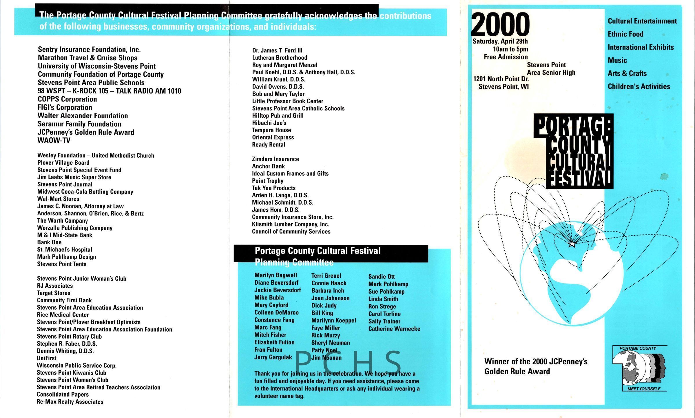 These handouts were collected from the Stevens Point Cultural Festival between 2000 and 2019. They contain lists of represented ethnic groups, performances, sponsors, and maps of the event space inside the Stevens Point Area Senior High school.Created By