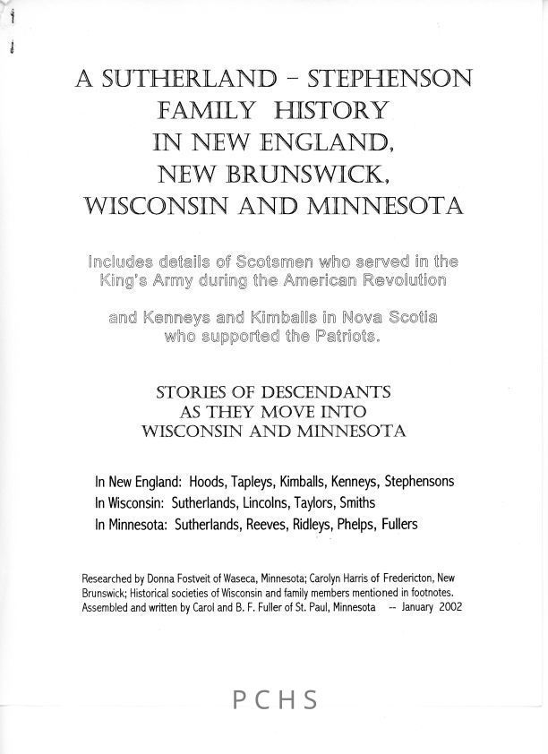 A family history in New England, New Brunswick, Wisconsin, and Minnesota. The family names mentioned are Hoods, Tapleys, Kimballs, Kennedys, Stephensons, Sutherlands, Lincolns, Taylors, Smiths, Reeves, Ridleys, Phelps, and Fullers.Created By
