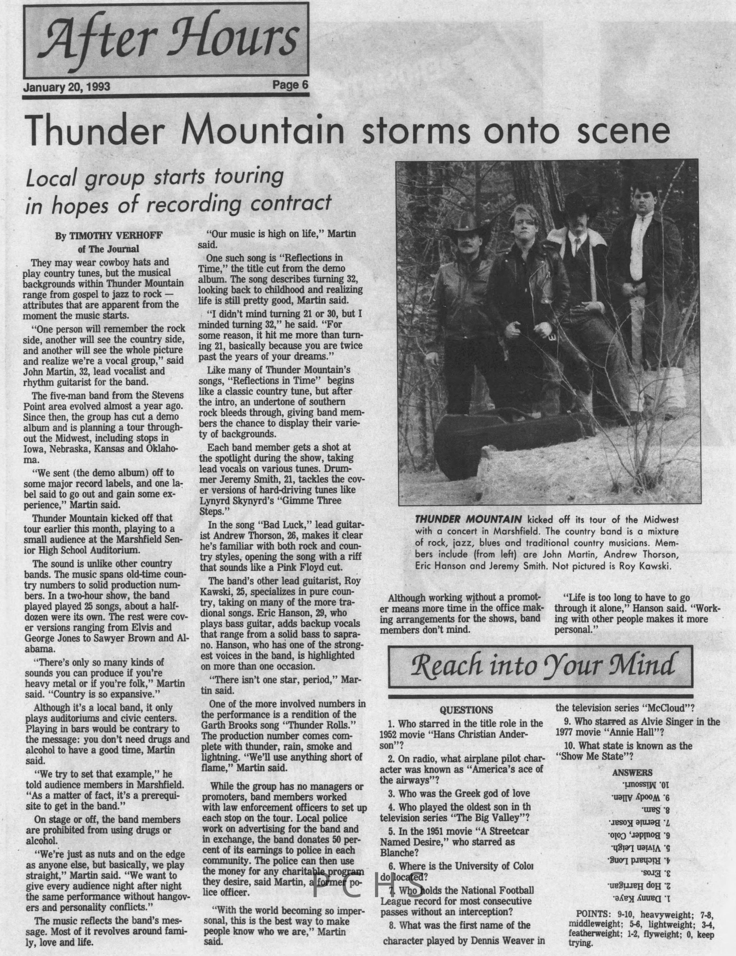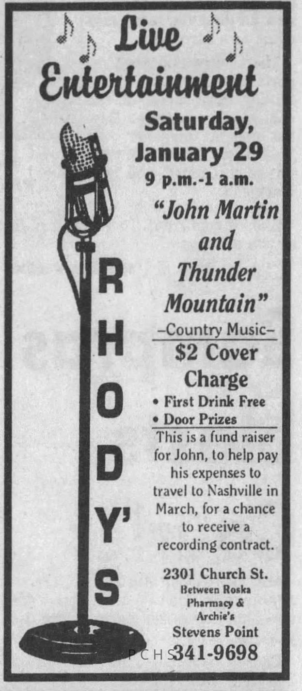 Thunder Mountain was a 5-man country band from Stevens Point. They started in 1992 and their last newspaper advertisement is from 1999. They were also sometimes known as John Martin and Thunder Mountain. Members included John Martin (lead guitar and vocals), Jeremy Smith (drums), Andrew Thorson (lead guitar), Roy Kawski (lead guitar), and Eric Hanson (bass guitar).Created By