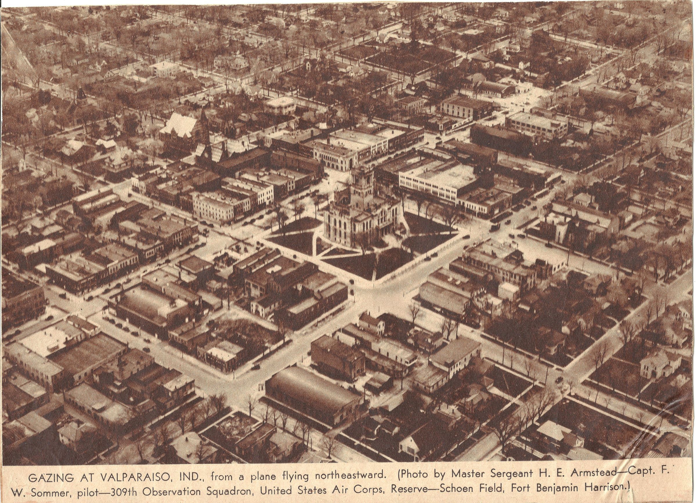 Sepia-toned photograph of downtown Valparaiso, as photographed from an airplane flying northeastward. Photograph was taken before the Courthouse fire, as the courthouse still has its belltower. Pilot was Captain F.W. Sommer, with the photograph taken by Master Sergeant H.E. Armstead. Both men were members of the 309th Observation Squadron of the United States Air Corps, based out of Schoen Field at Fort Benjamin Harrison.Acquisition