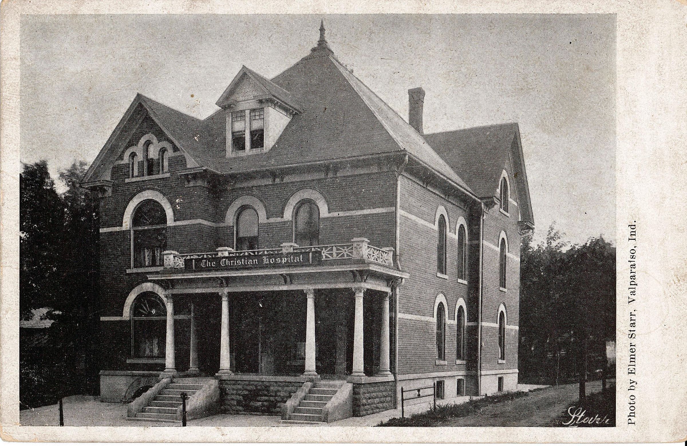 Black and white photographic postcard of the Christian Hospital in Valparaiso. Handwritten notes on back read, "Nancy, this is the Hospital across the street from Clara's."Acquisition