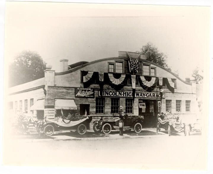 This black and white picture found in collections depicts Lincoln HIghway Garage. It is decked out in American flags. There are four cars seen in the photograph. They look as if they are going out to a parade. There are six people in the picture. One is in the first car. The second is in the second car. The last four people are in the third car. The third car holds two men and two women. The other two people are both men.Acquisition