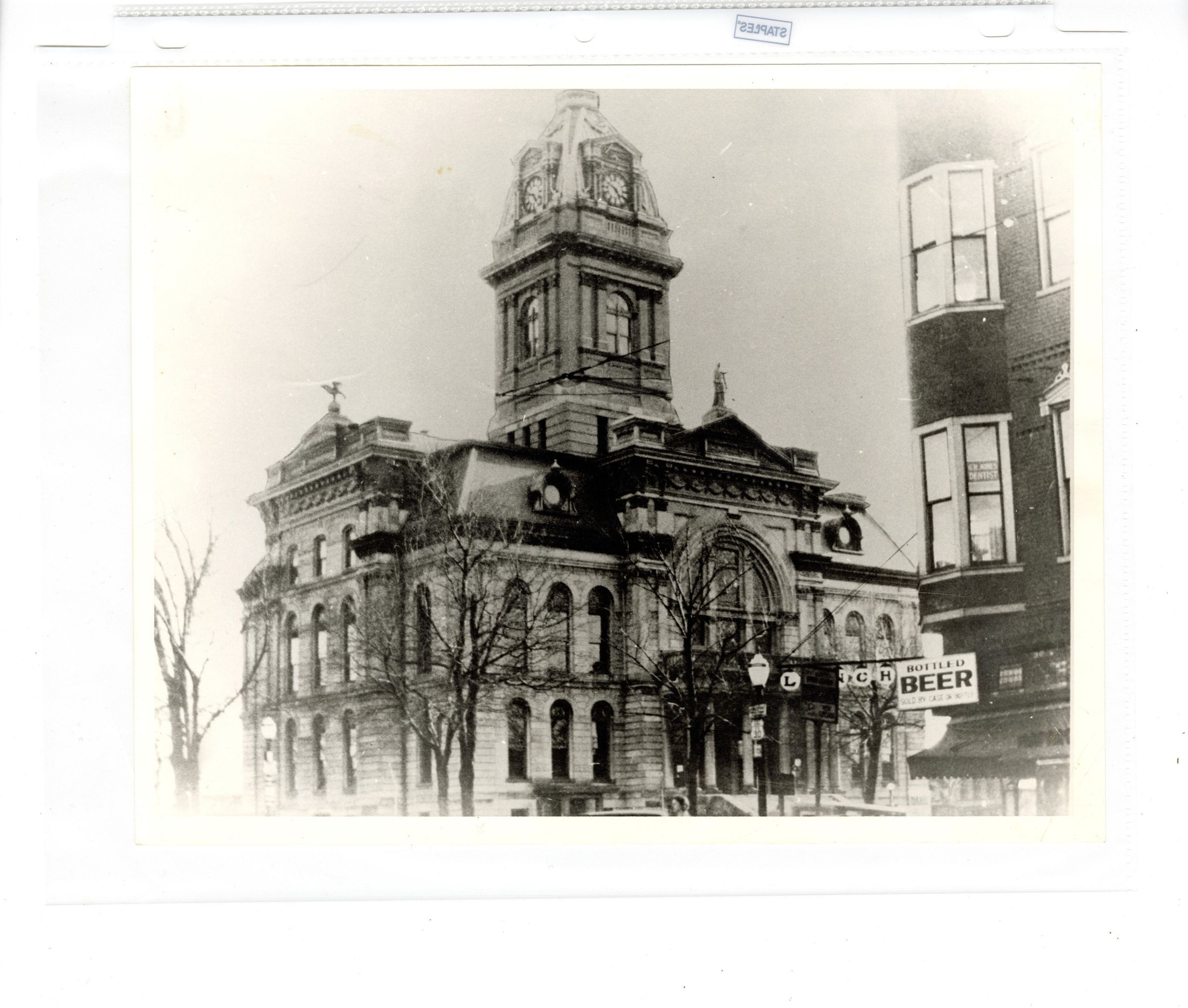 This black and white photography depicts a view of the Porter County Court House. In the right hand corner there is a sign for bottled beer. On the reverse of the picture there is a handwritten note that states the "Original photo taken by Kelly Gott After prohibition and just before Court House Fire". Below that it says the name "Sharon Emmerson".Acquisition