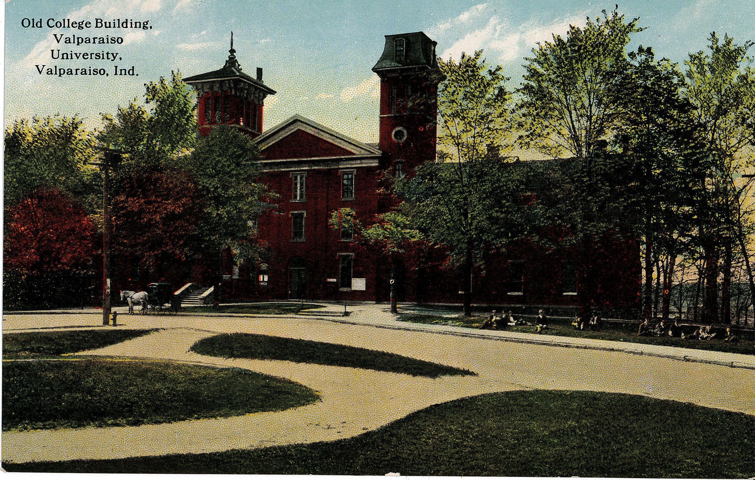 Tinted photographic postcard of the Old College Building on the campus of Valparaiso University. Per Steve Shook at the inportercounty.org website, "This image shows the original campus building of the Valparaiso Male and Female College, which was founded by the Methodist Church and operated between 1859 to 1871. The college went defunct in 1871 and was closed for approximately two years, reopening in 1873 as the Northern Indiana Normal School and Business Institute. The original large brick structure consisted of the center portion of the building between the two towers. The tower and east wing to the left in this image were erected in 1867, while the tower and west wing to the right were added later. The structure shown here, with its several additions, was destroyed on February 15, 1923, by a fire originating from an overheated stove."Acquisition