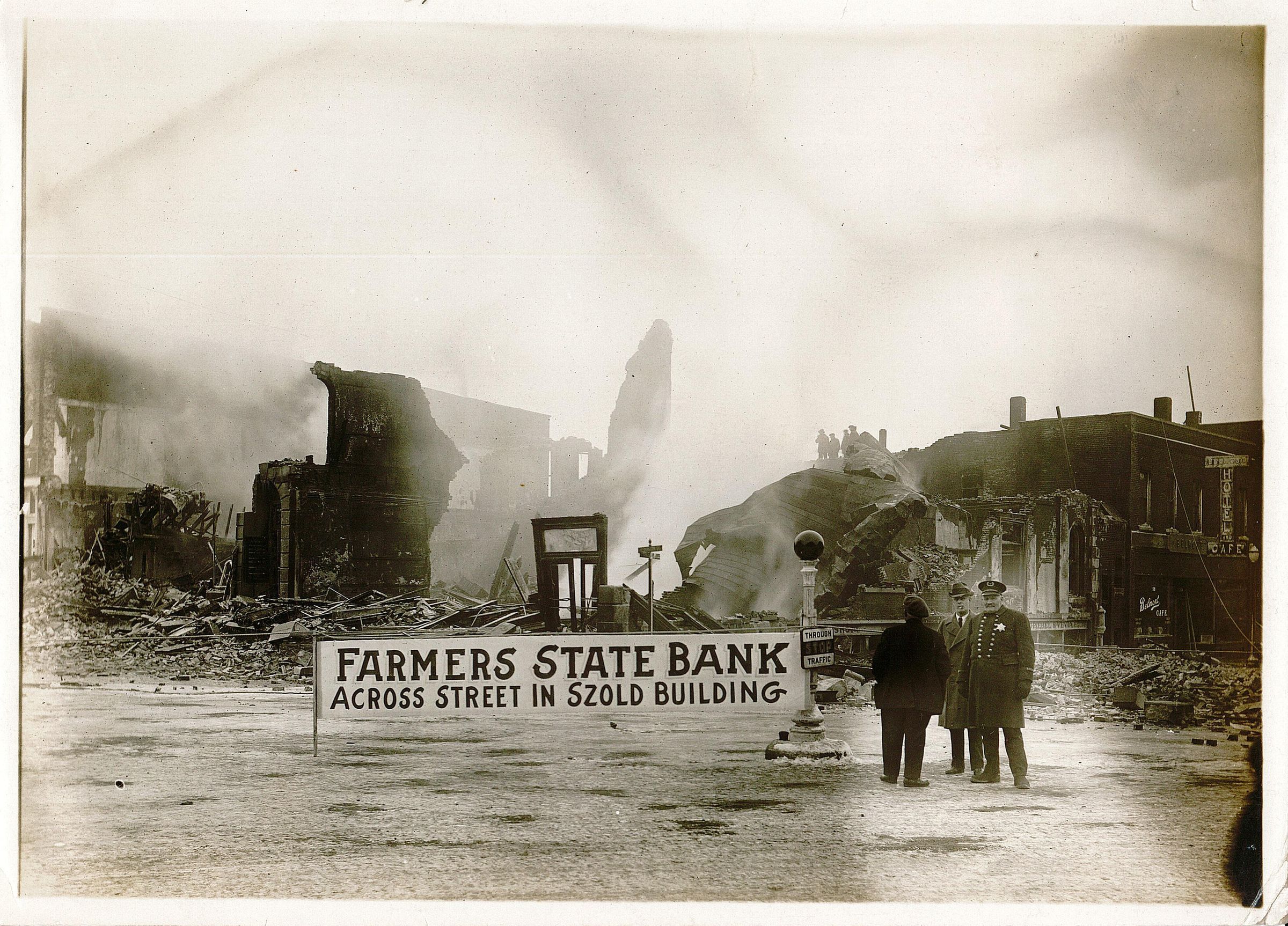 Black and white photograph of the wreckage after the Academy of Music Block Fire. Per Steve Shook at inportercounty.org, "Farmers State Bank was located on West Main Street and was destroyed by fire in 1926. The structure was originally known as Valparaiso Hall, located on the Starr and Anthony Block, and was constructed in 1864. Later, the structure was more commonly known as the Academy of Music Block. The second floor of the structure housed professional offices, while the third floor was home to the Masonic Lodge. Heineman & Sievers Rexall Drug Store shared the first floor of this structure with Farmers State Bank. The Porter County Courthouse would be located directly behind the photographer, who would have been standing on the Courthouse grounds. Prior to the construction of the Academy of Music Block, this site was the location of one of the first homes in Valparaiso, that of John Spurlock. Spurlock's home was also the location of the first session of circuit court in Porter County in October 1836, presided over by Judge Samuel C. Sample."Acquisition