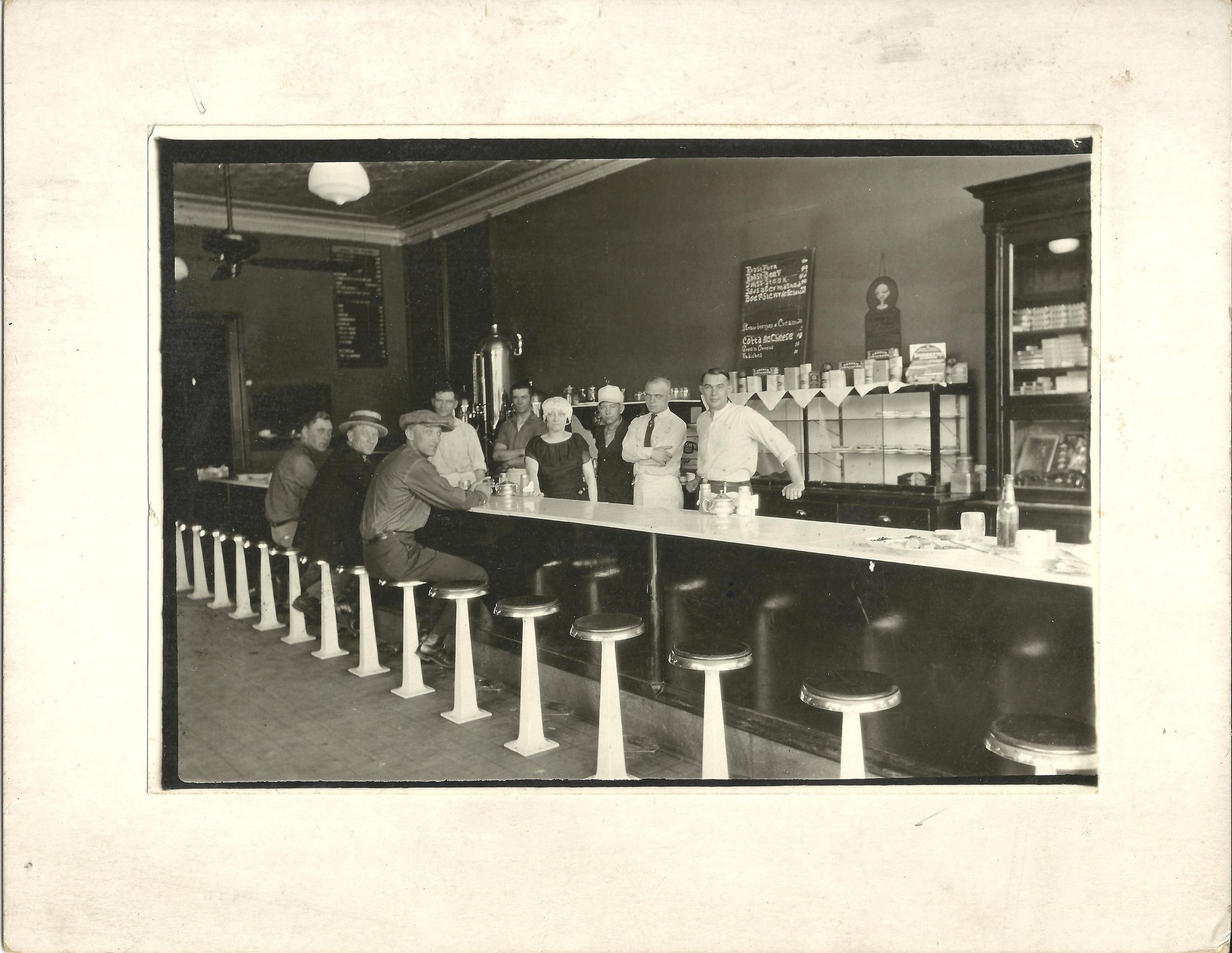 Black and white photograph of a downtown lunch counter, matted on cream cardboard.Acquisition