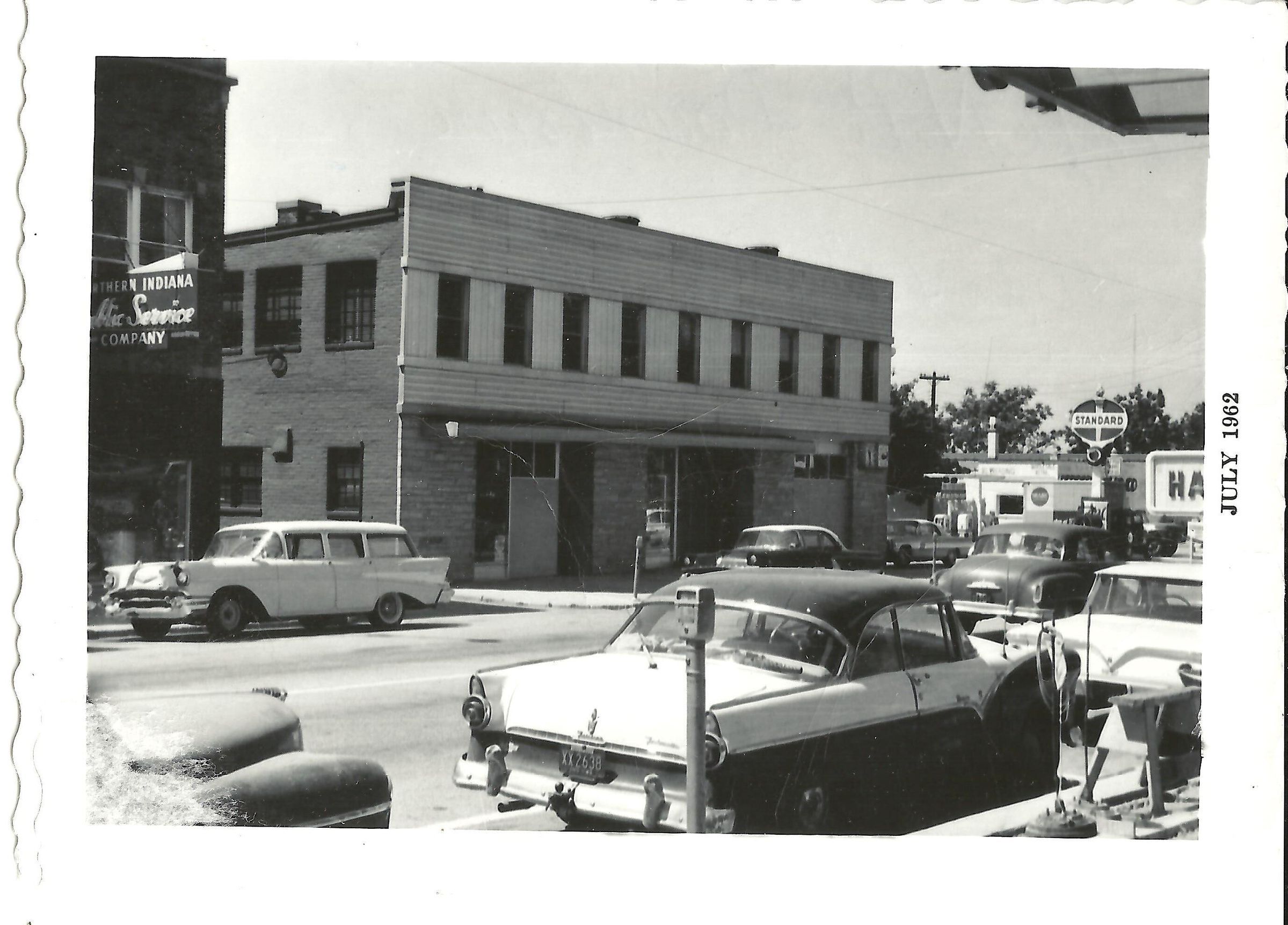 Black and white photograph of what appears to be the Vidette Messenger building in downtown Valparaiso. The NIPSCO sign is also visible.Acquisition
