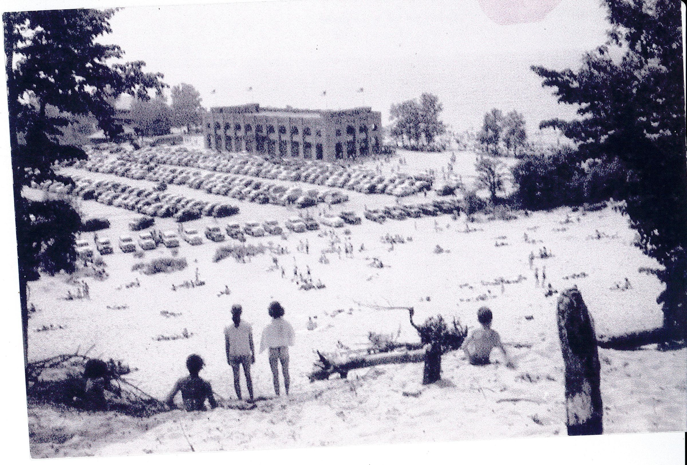 Black and white photograph of the Indiana Dunes Pavilion, with cars filling the parking lots. Pavilion is seen from the top of the Devil's Slide dune. In the foreground, a cluster of children play in the sand. Image dates to the 1950s or 1960s.Acquisition