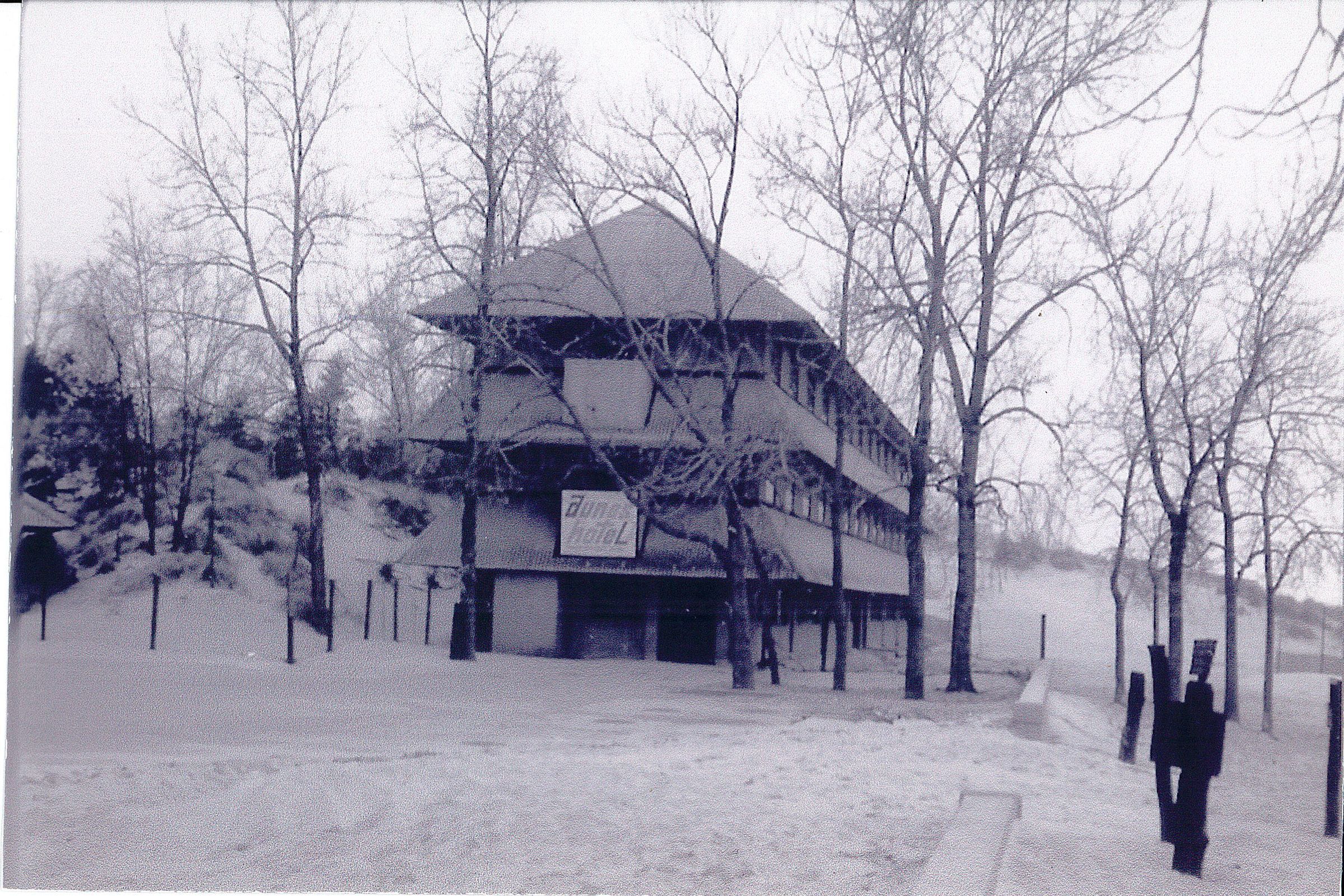 Black and white photograph of the Dunes Hotel, as seen in winter. Image dates to the 1950s or 1960s.Acquisition