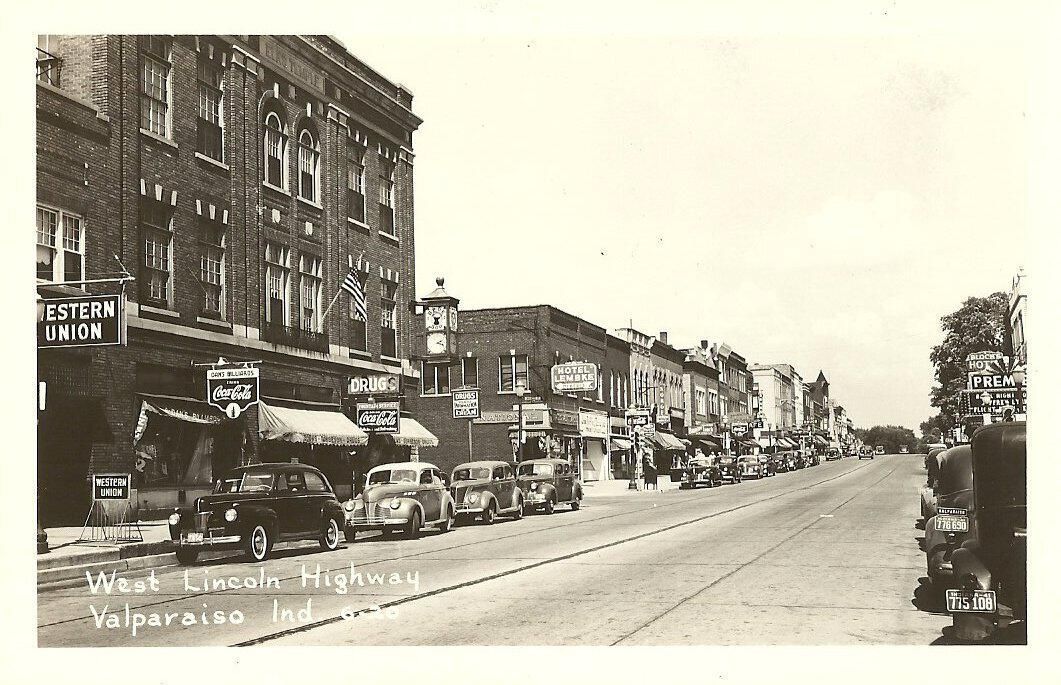 Postcard is of downtown Valparaiso commercial district, on West Lincoln Highway.