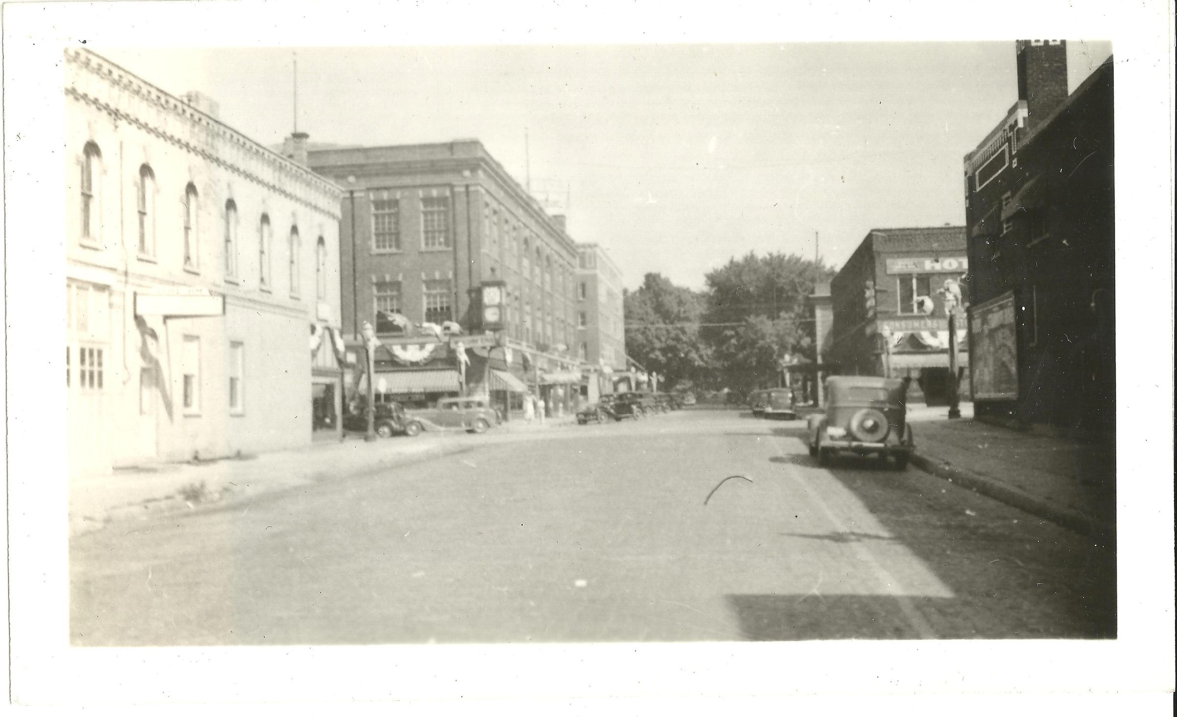 Black and white photograph of Lafayette Street in downtown Valparaiso, looking north. Taken in 1936, the image shows the Elk's Temple and the Premier Theatre.Acquisition