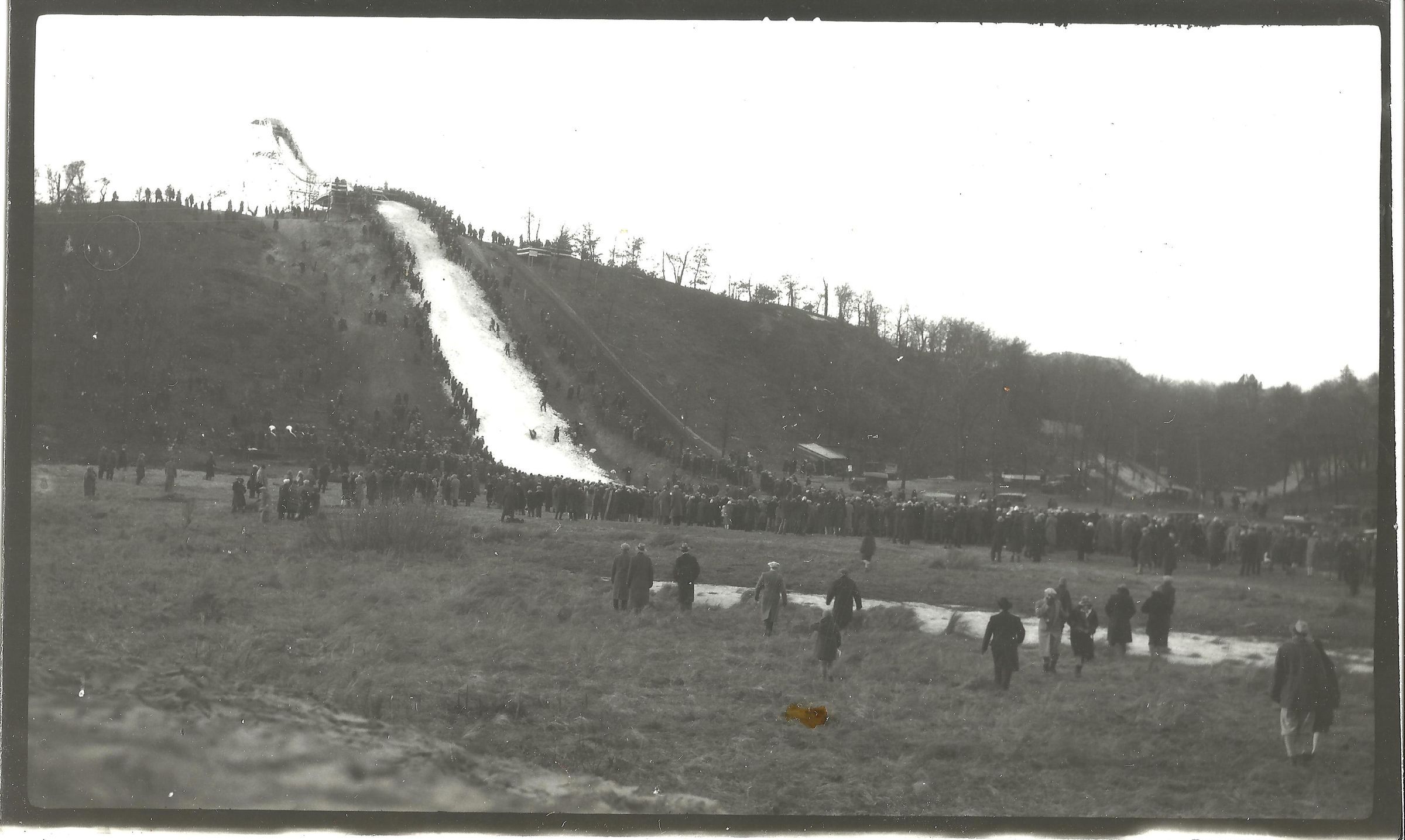 Black and white photograph of the Olympic length and height ski jump on the beach at Ogden Dunes. The jump was built onto a particularly large sand dune.Acquisition
