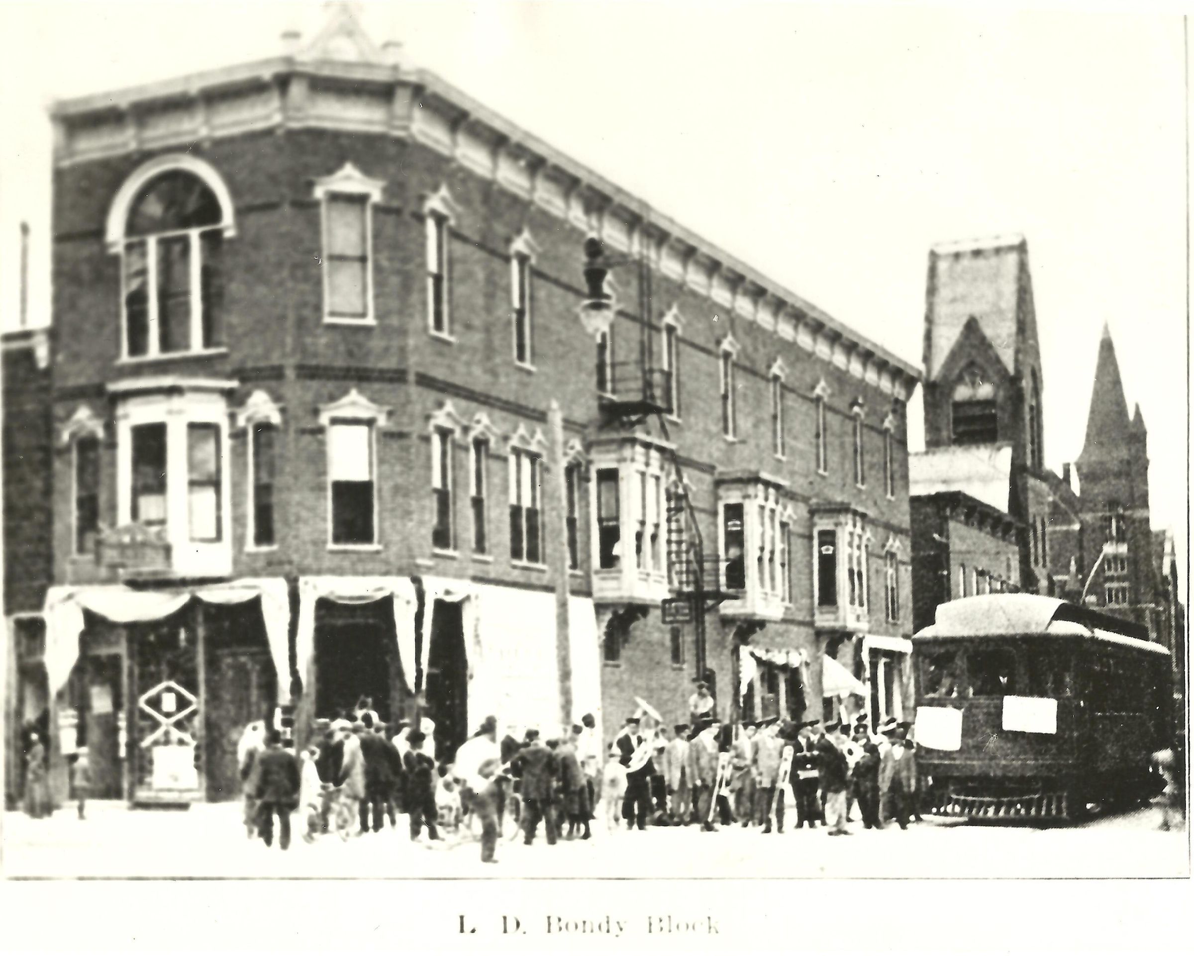 Black and white reproduction of a photograph showing the L.D. Bondy Block, located on Franklin Street, just north of Lincolnway. An Interurban train car is pulling up to the station located there.Acquisition