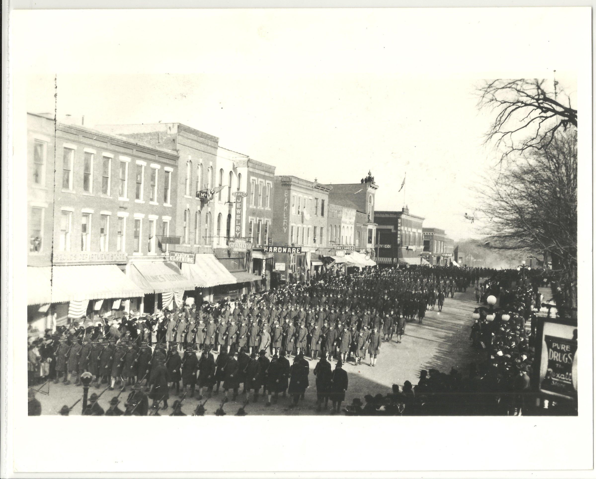 Reproduction of black and white photograph showing ranks of soldiers in uniform marching on Lincolnway, between Washington and Franklin Streets, in Valparaiso. Parade was to celebrate Porter County's military veterans returning from World War I. Parade held in November of 1918.Acquisition