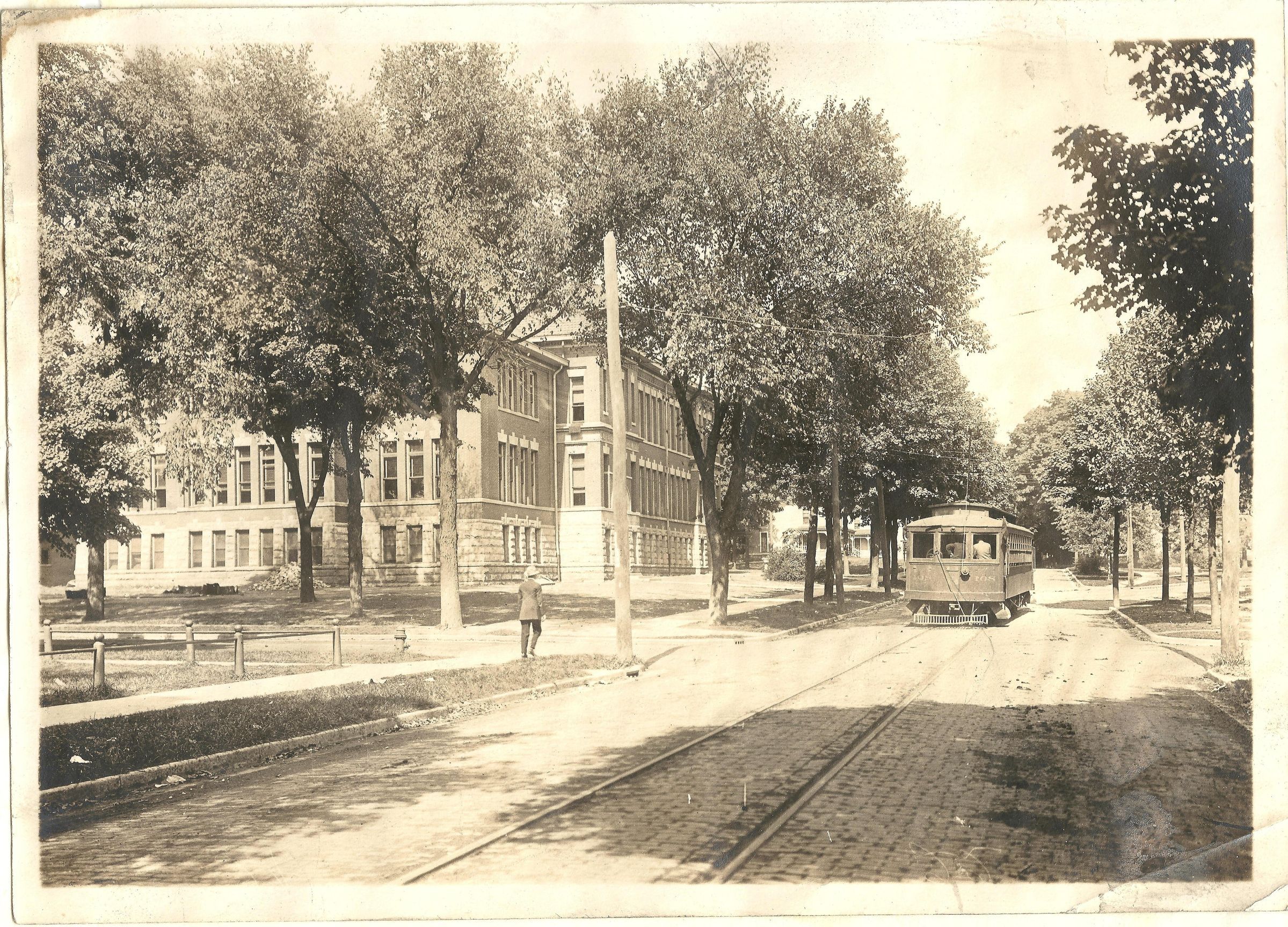 Item is a page from Walter J. White's 1916 scrapbook, covering his school year at Valparaiso University, and travels. This page features a large, beautiful image of an Interurban car passing by Central School in downtown Valparaiso.Acquisition