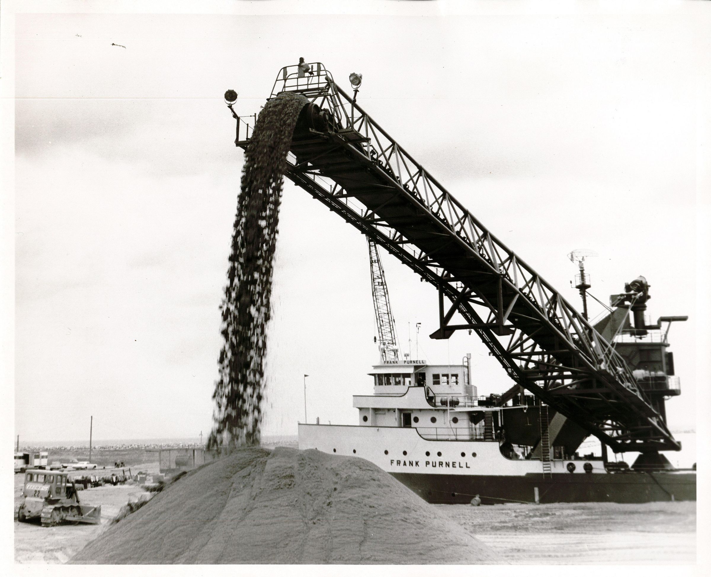 Black and white photograph of the Frank Purnell, the first ship to dock at Port of Indiana berth, as it unloads gravel to be used in highway construction. The vessel carried approx. 12,000 tons and can unload itself in about 3.5 hours. Photograph taken 5/1/1970.Acquisition