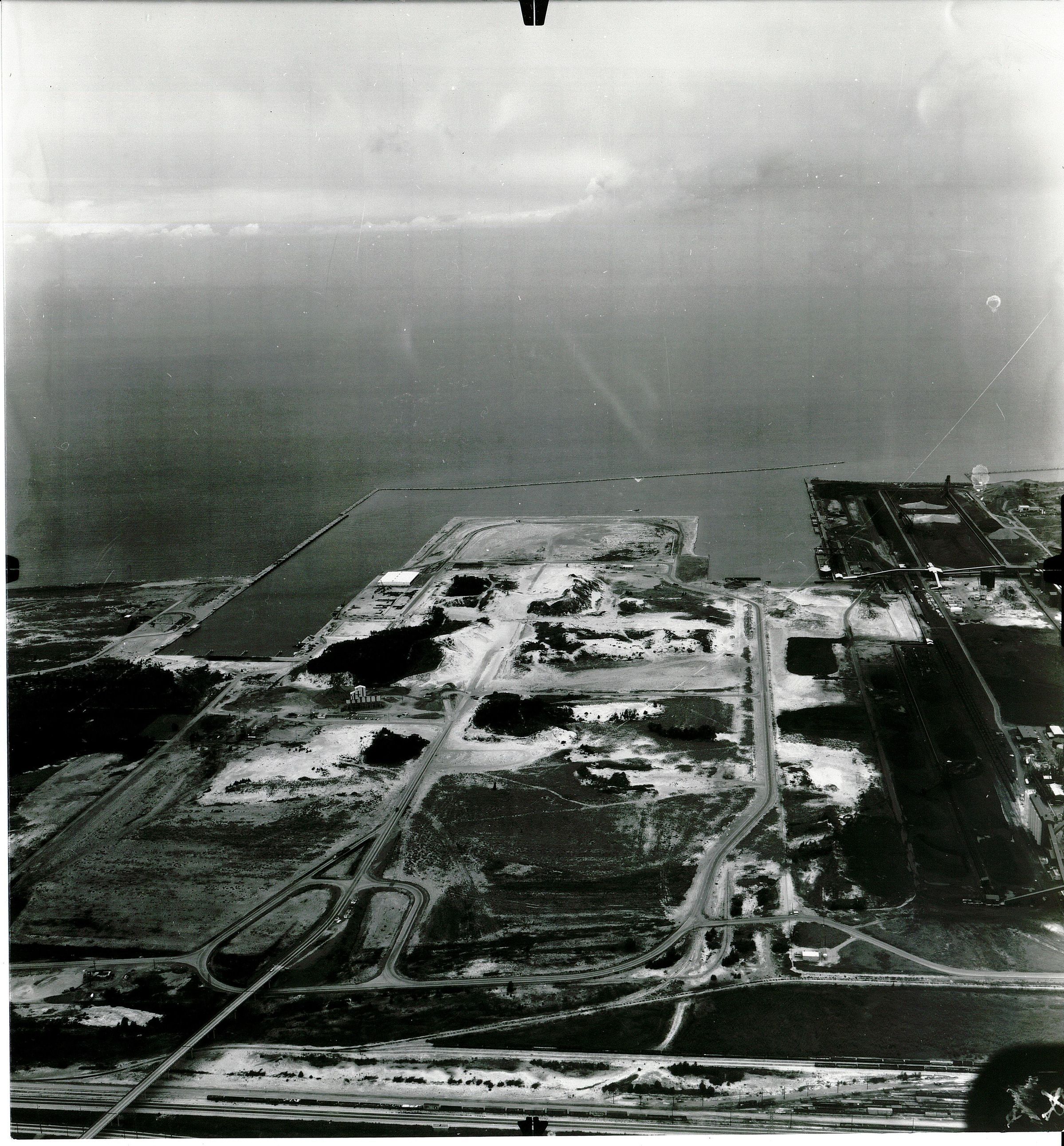 Square black and white photograph of an aerial view looking over the harbors at the Port of Indiana.Acquisition