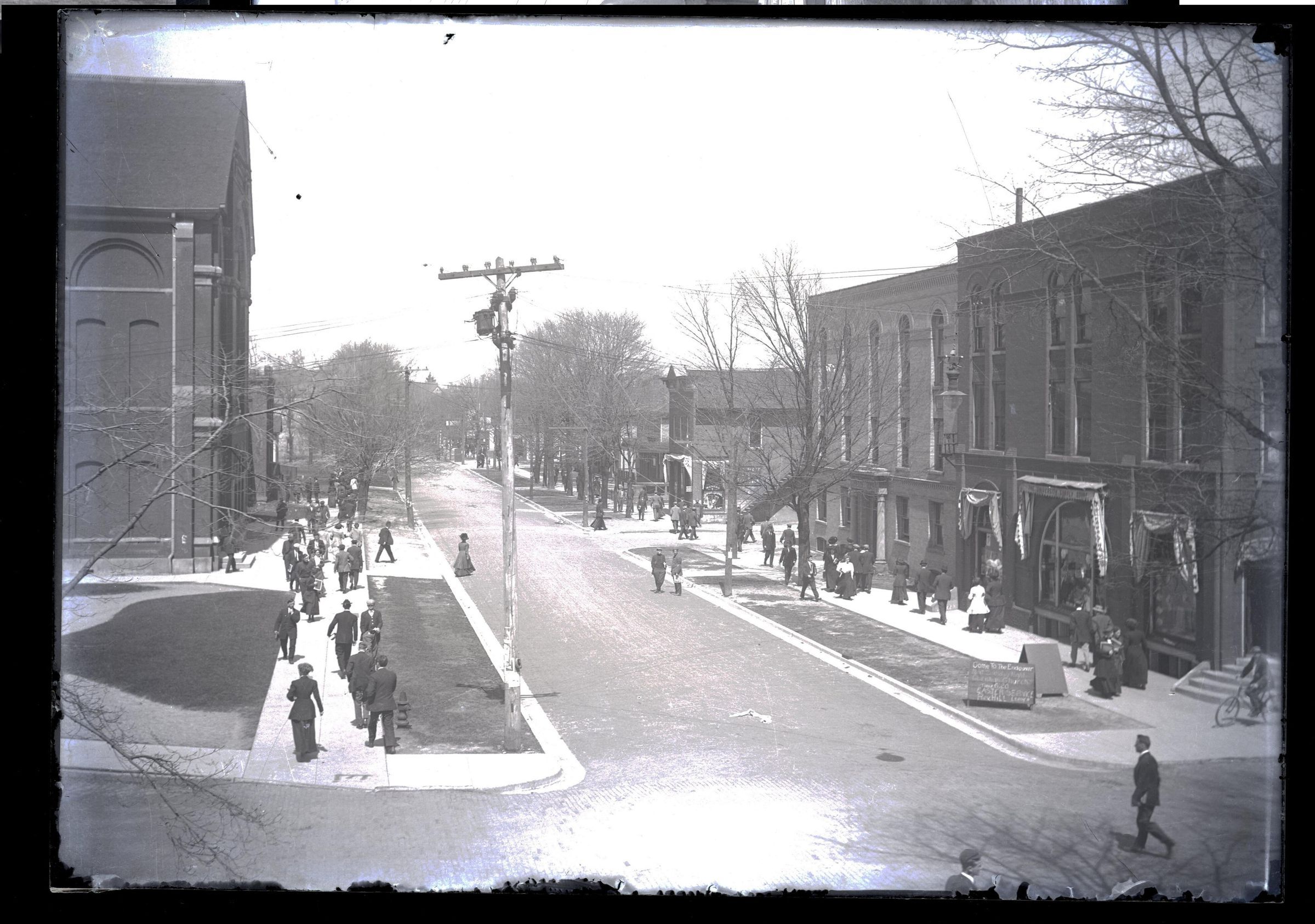 Glass plate negative featuring Valpariaso University, a number of people visible in photo, shops and acadmic buildings.Acquisition