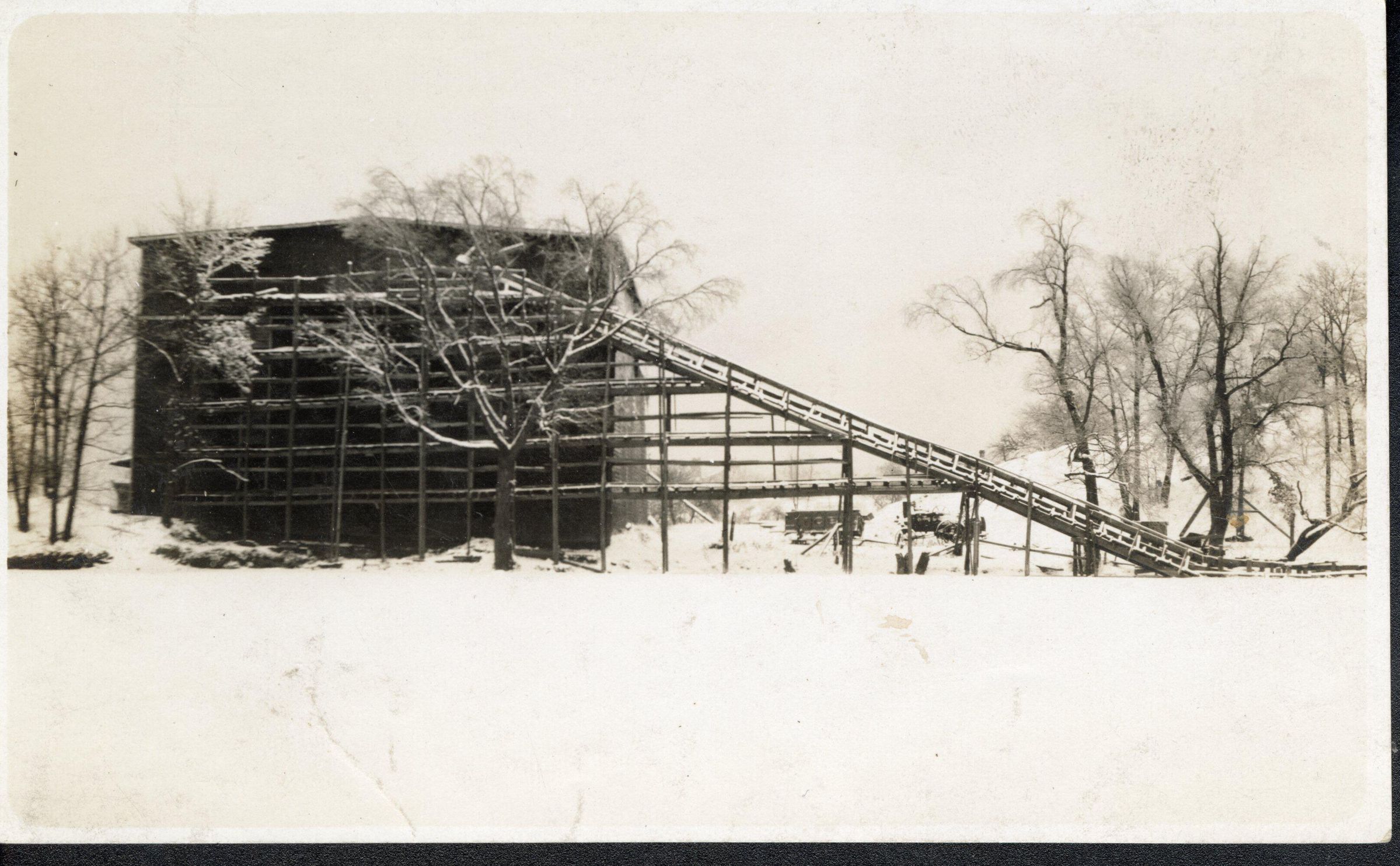 From the Steve Moeckler collection. Image depicts a large building with a large ramp leading up it. Inscription on the back reads "Sagers Ice House"
