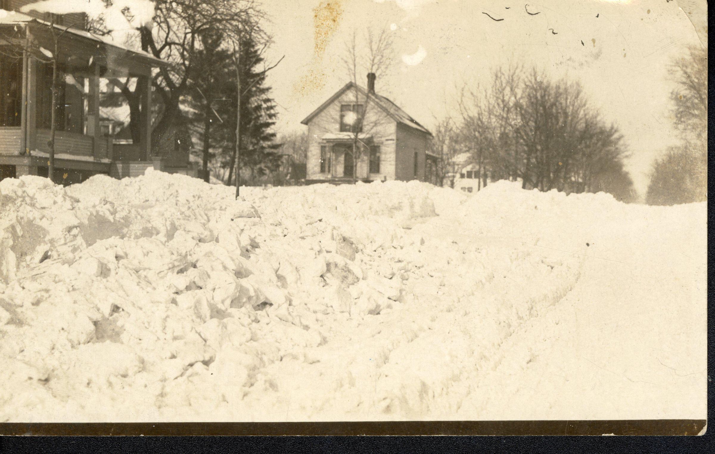 From the Steve Moeckler collection. The postcard shows a snow covered road and house. Written on the back is "College and Ind. Nate Shepards House"