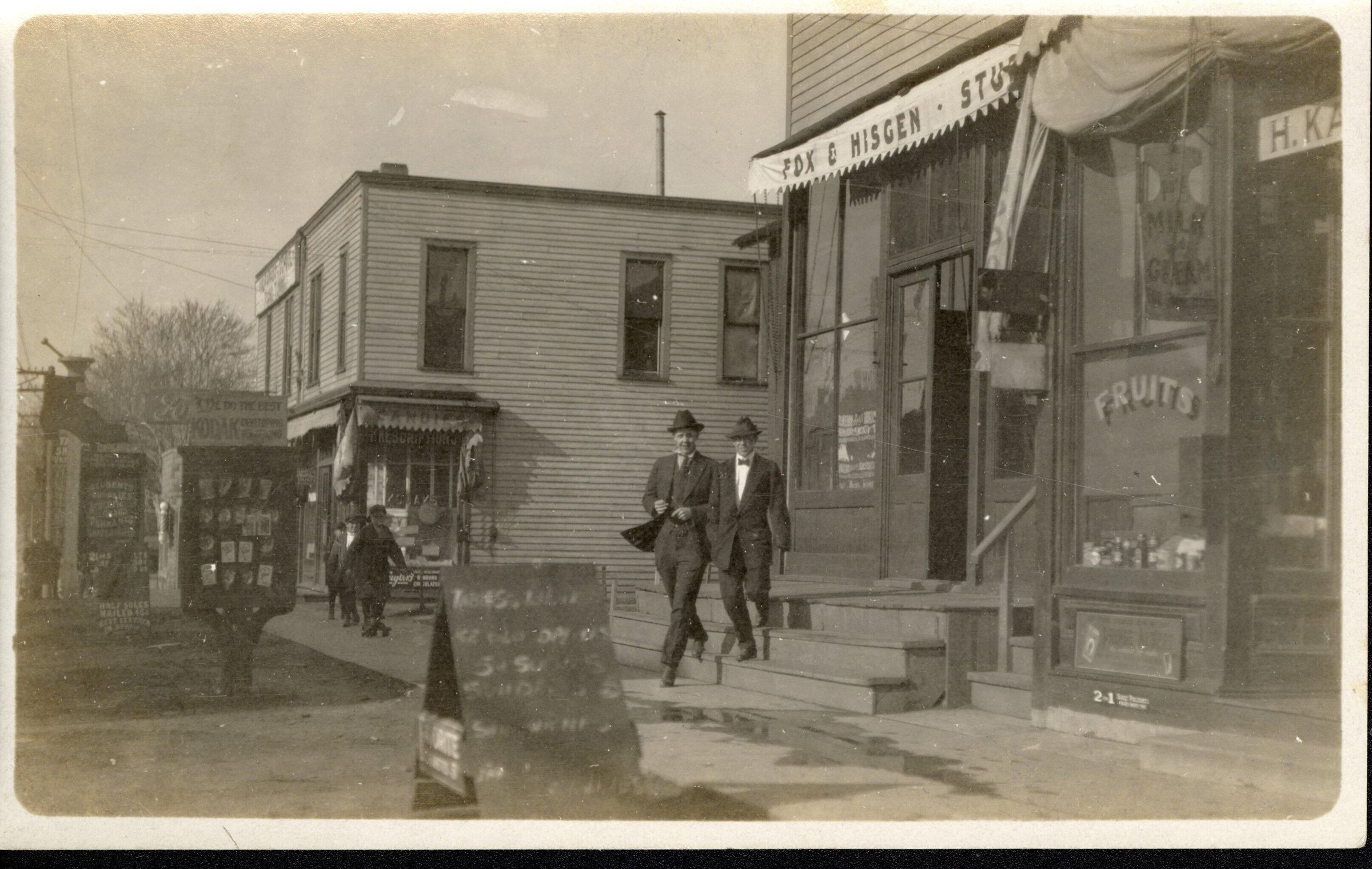 From the Steve Moeckler collection. This is a photo that shows busy street with 2 men leaving a store and 3 boys coming down the sidewalk. One sign above a shop reads "Fox _. Hisgen - Stu___" Possibly photo of Fox Studios on College Hill.
